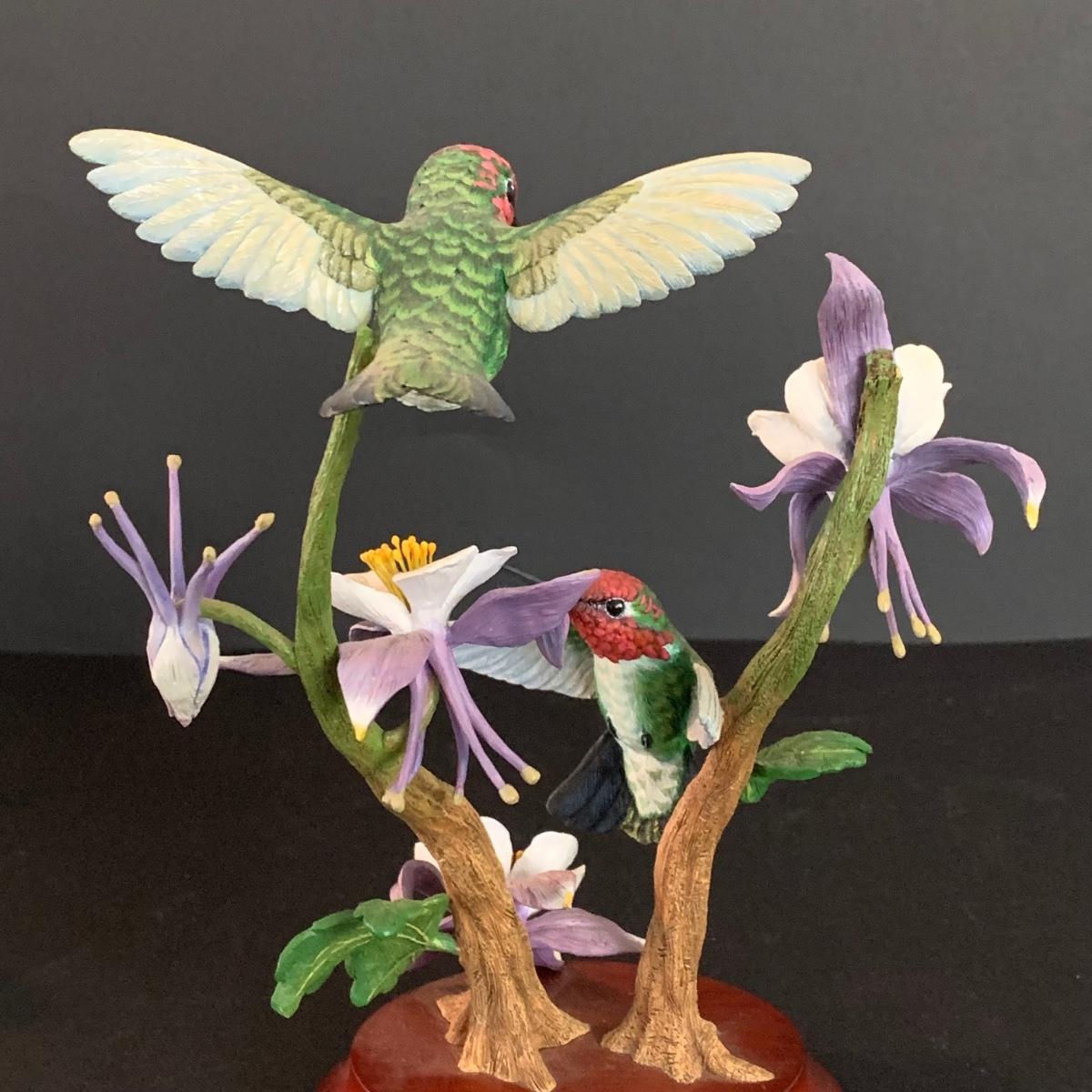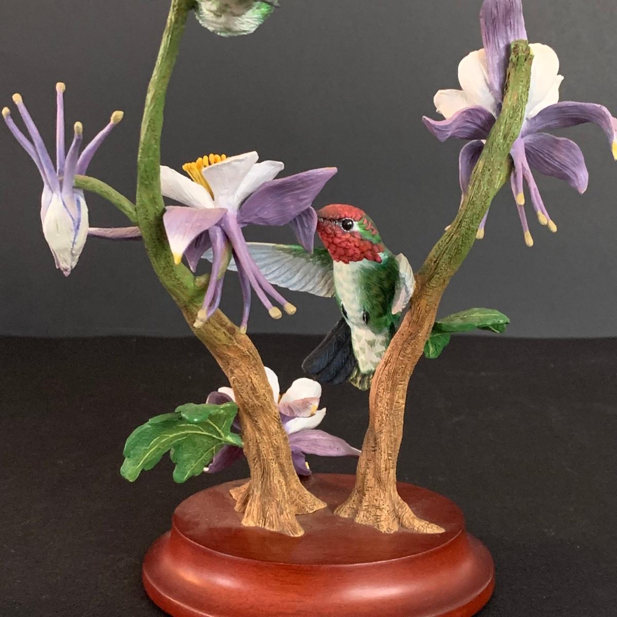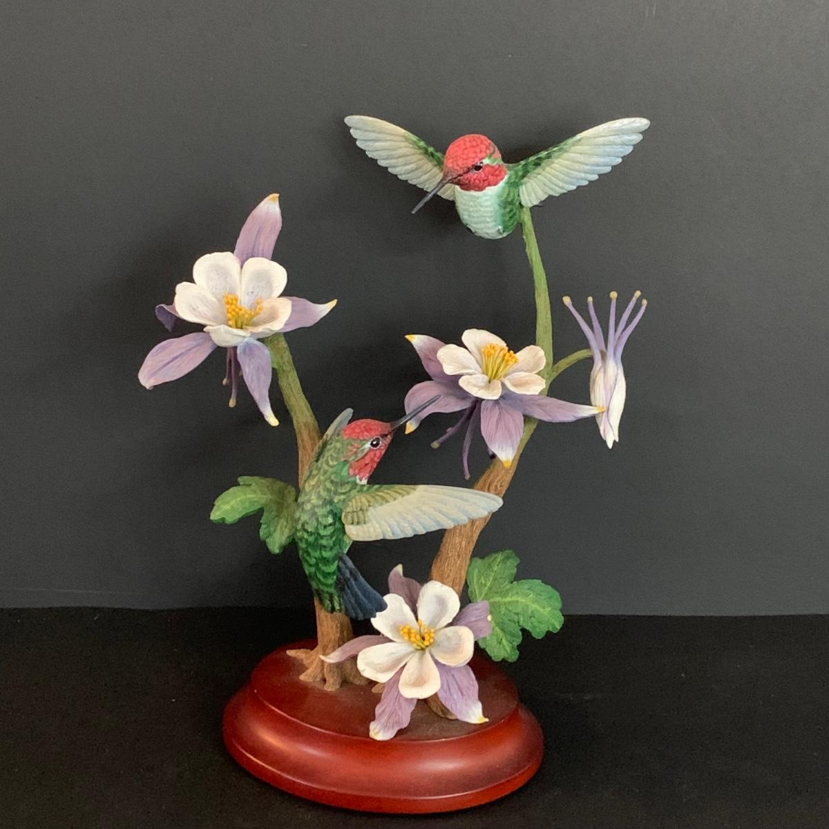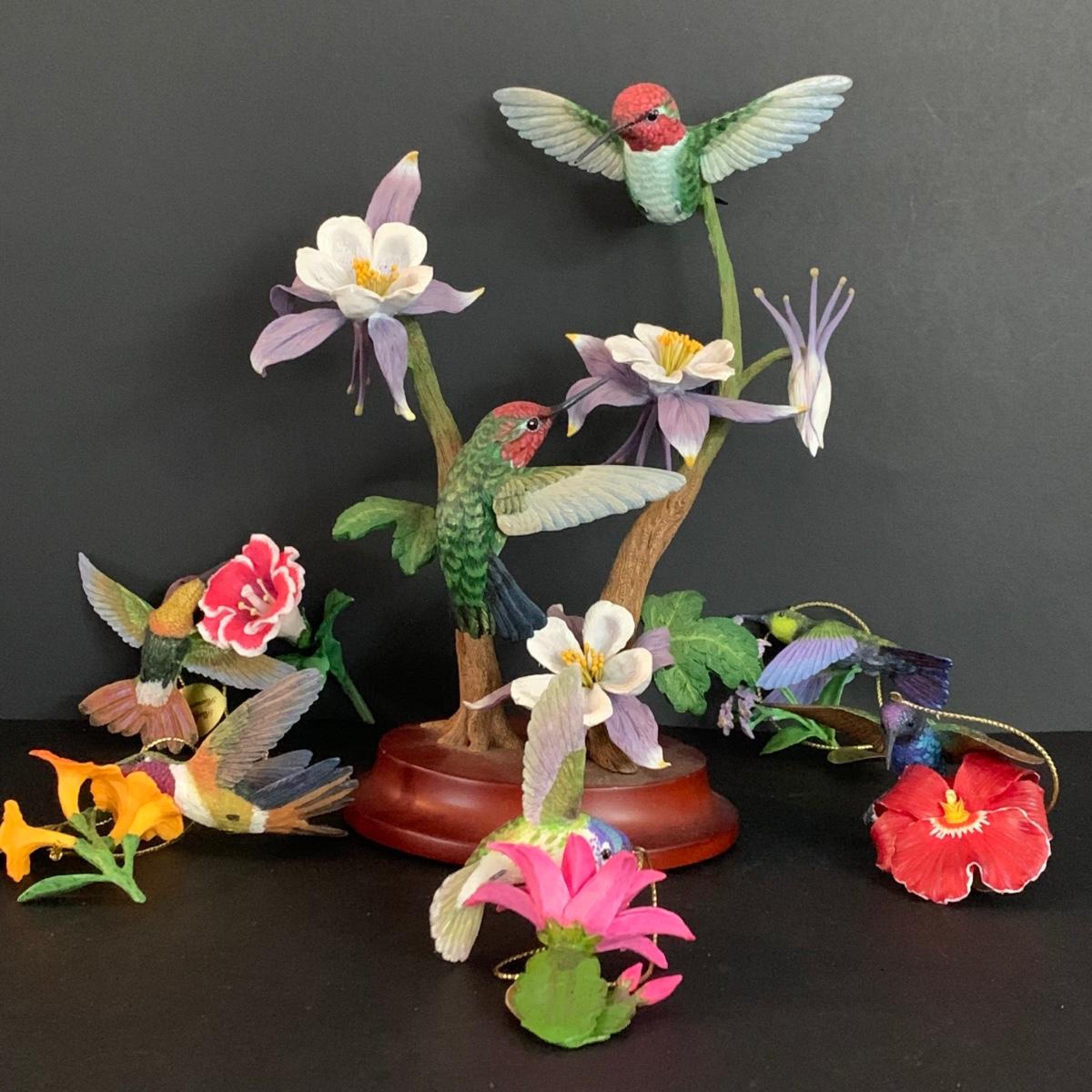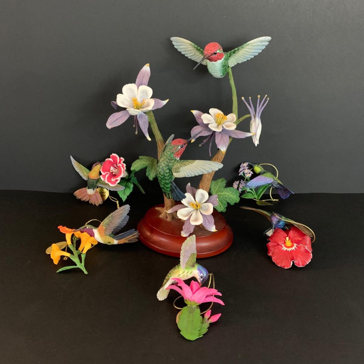 LOT 144: Beautiful Hummingbirds and Columbine Flower Statue and Danbury Mint Hummingbird Ornaments