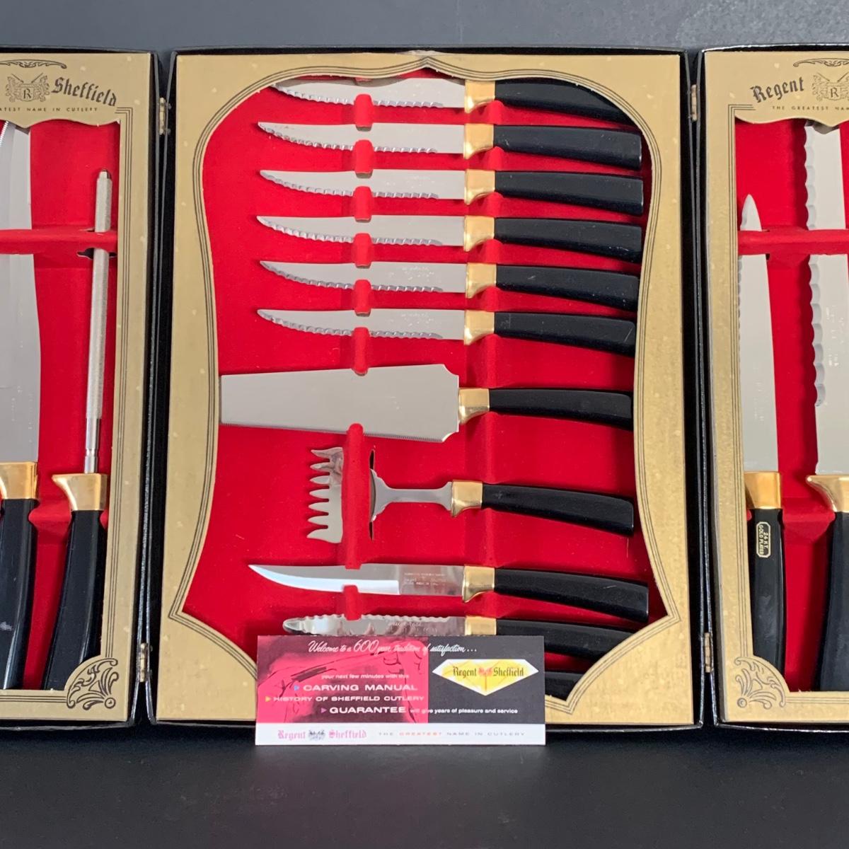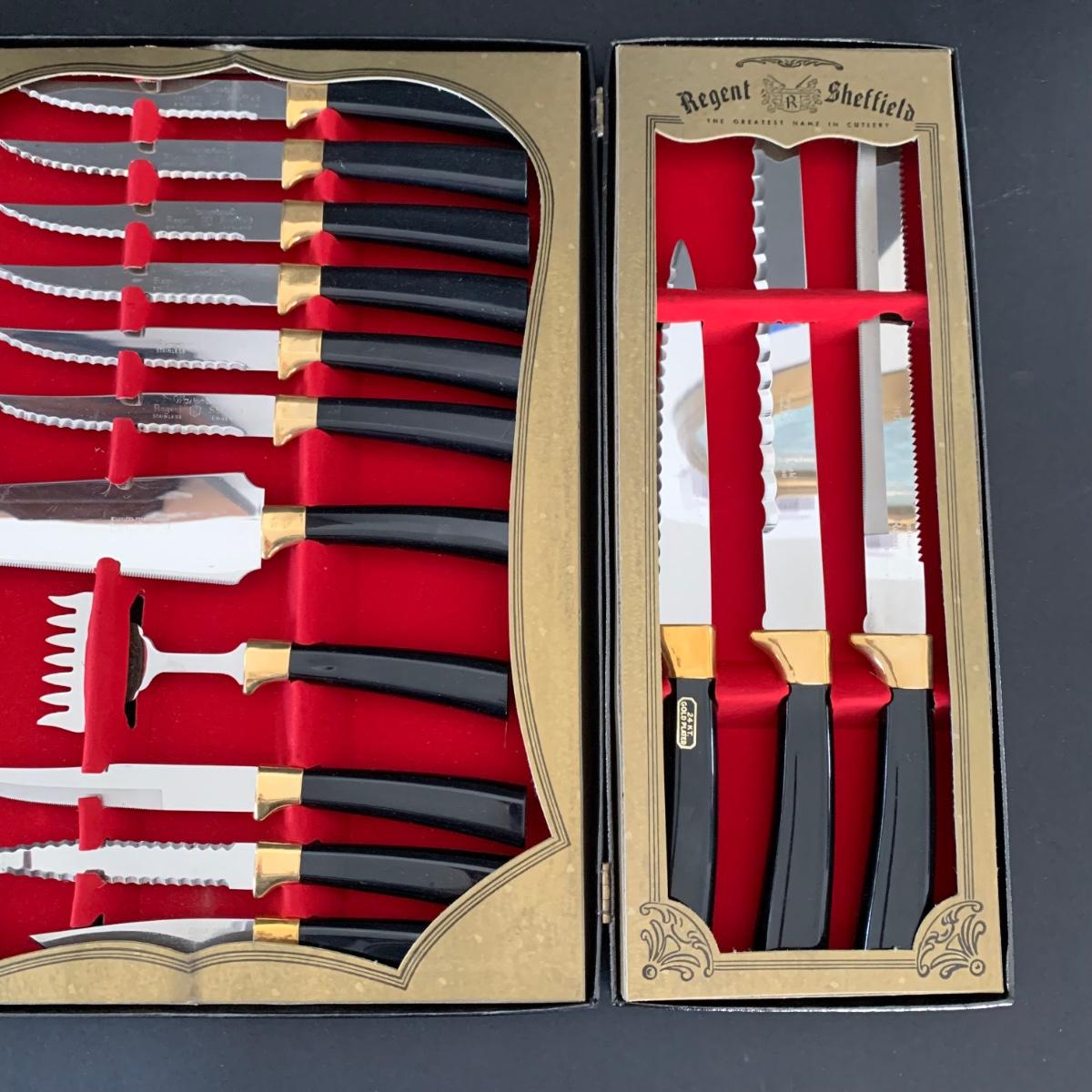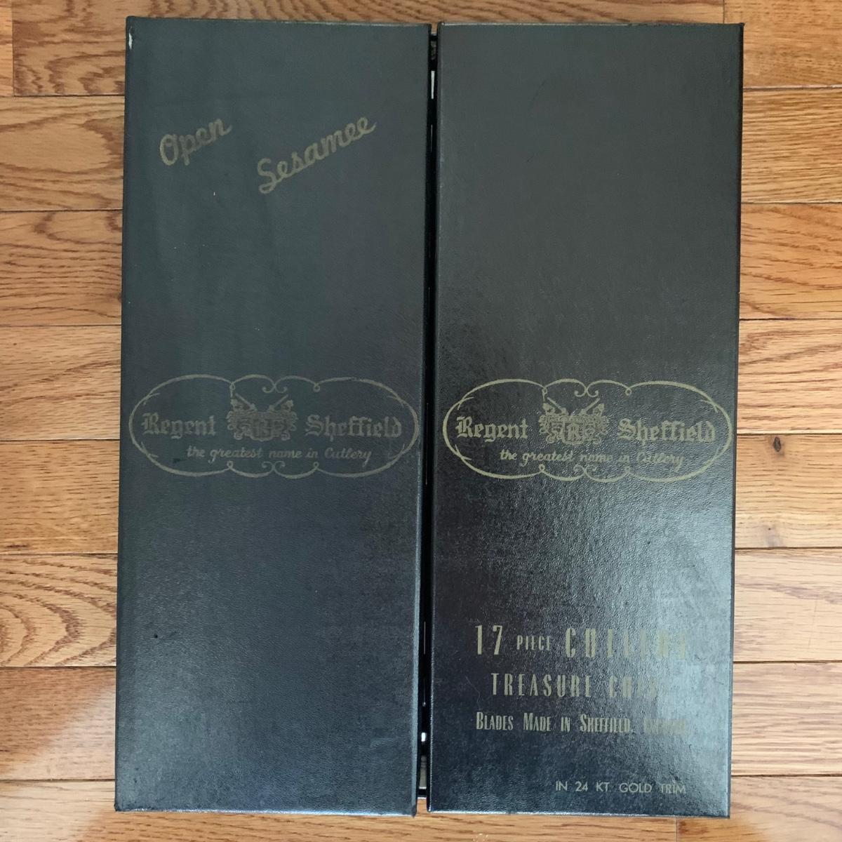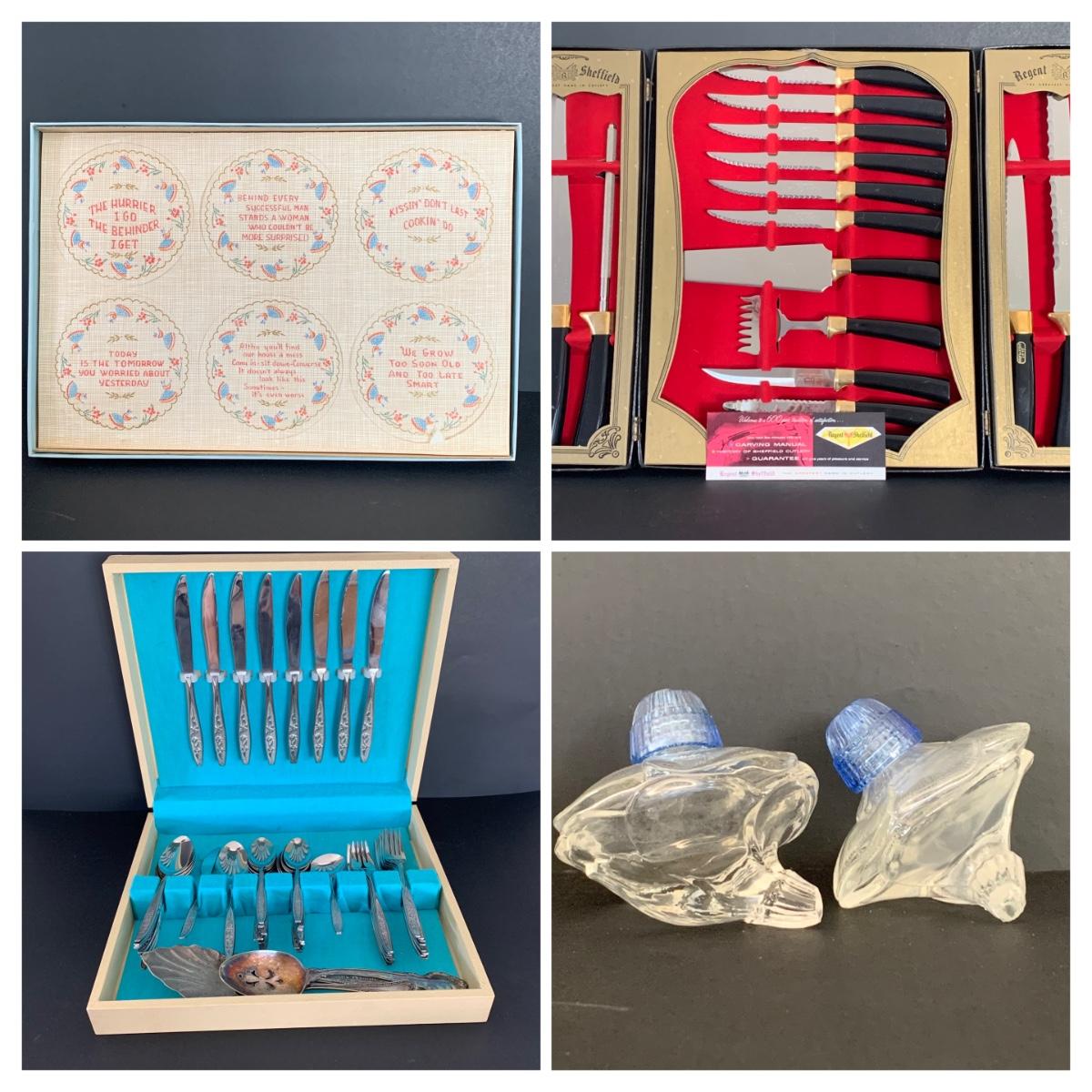 LOT 159: Regent Sheffield 17pc Cutlery Set w/24k Gold Plated Trim, Boxed Flatware Set, Floral Salt/Pepper & More