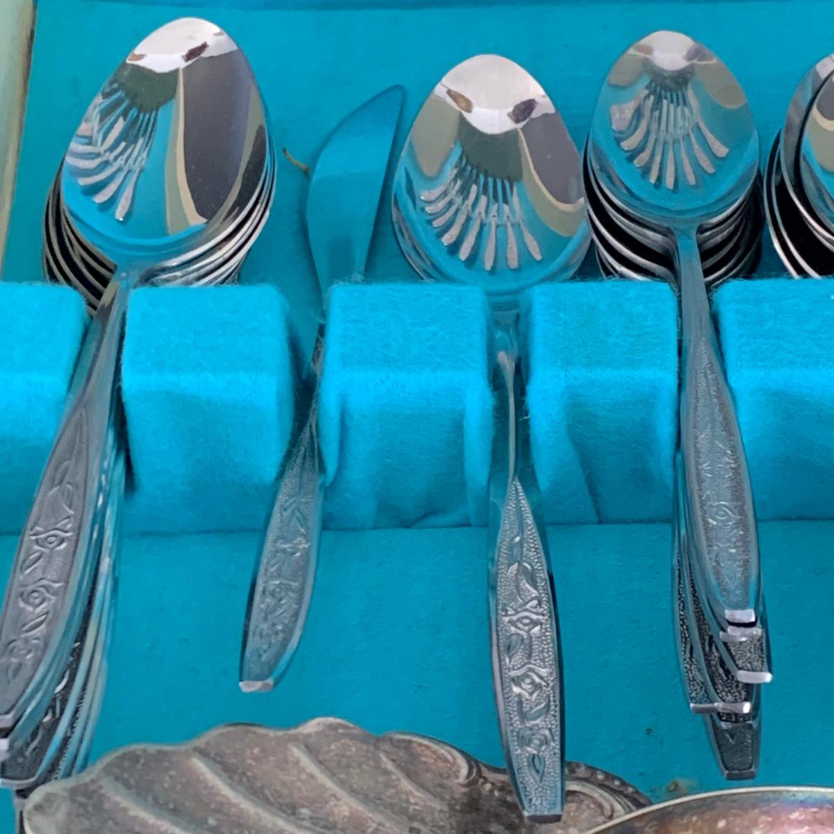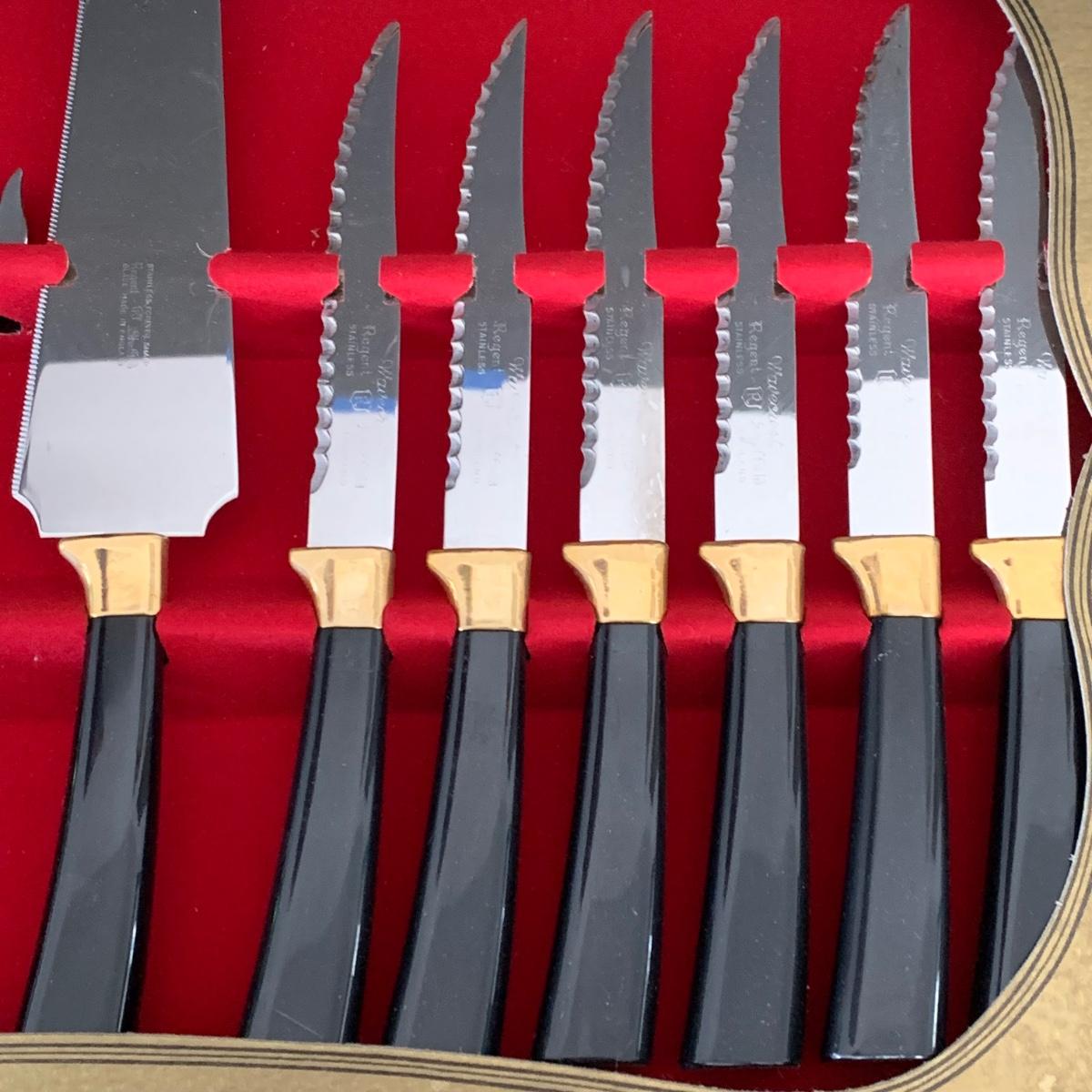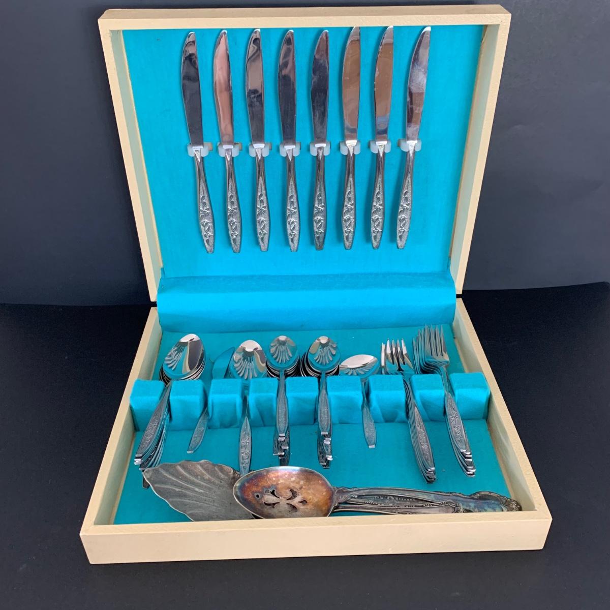 LOT 159: Regent Sheffield 17pc Cutlery Set w/24k Gold Plated Trim, Boxed Flatware Set, Floral Salt/Pepper & More