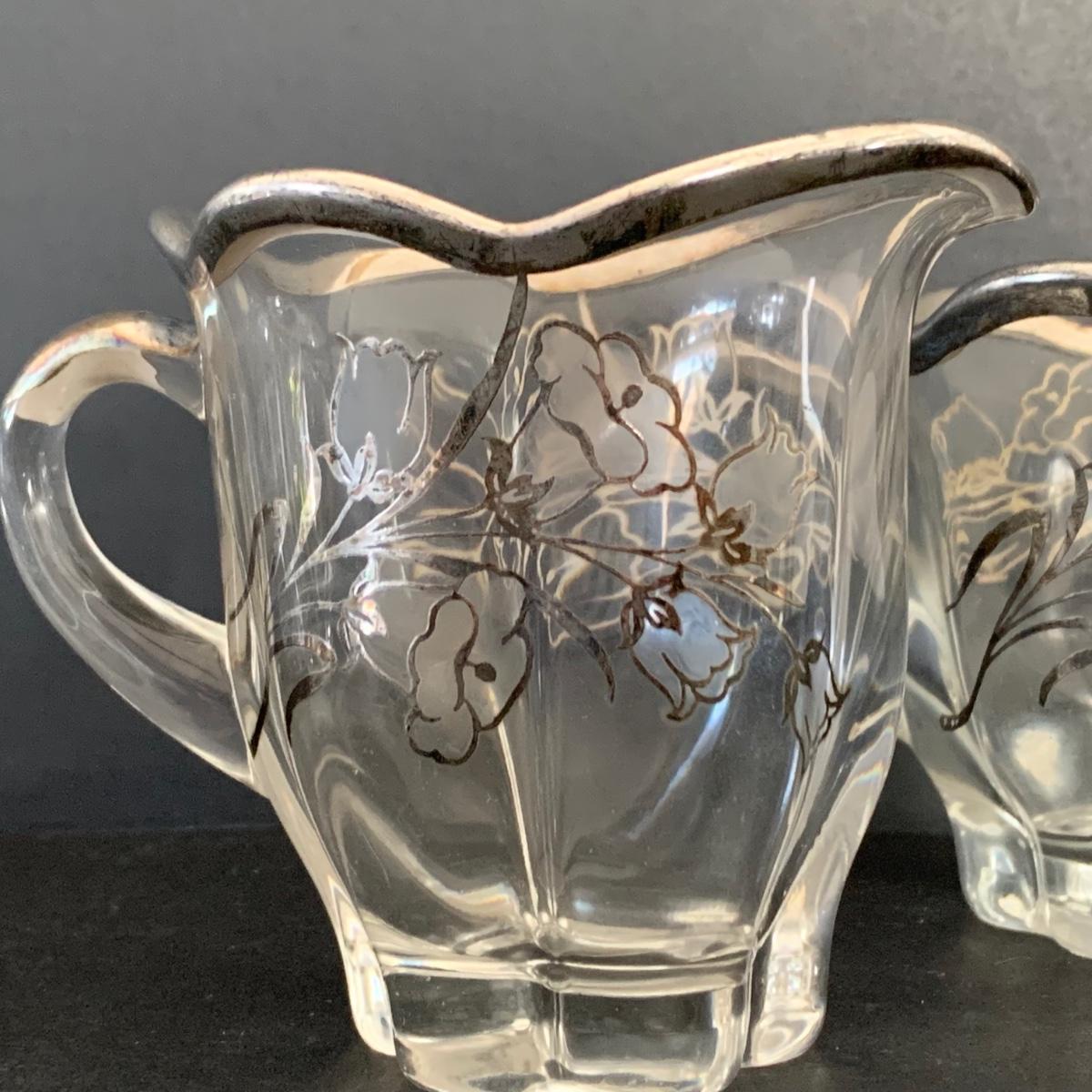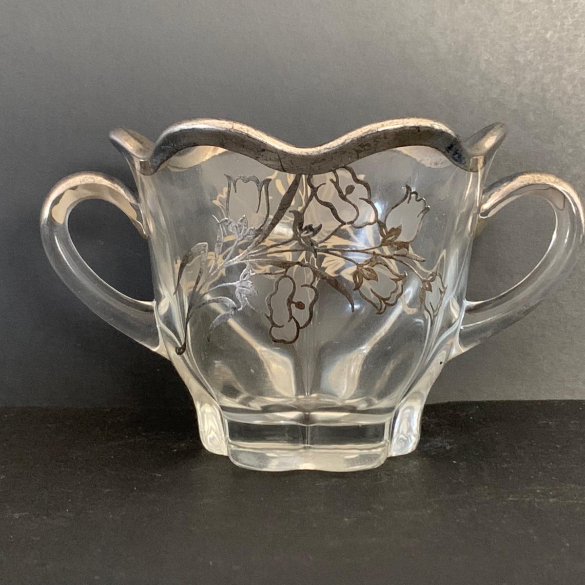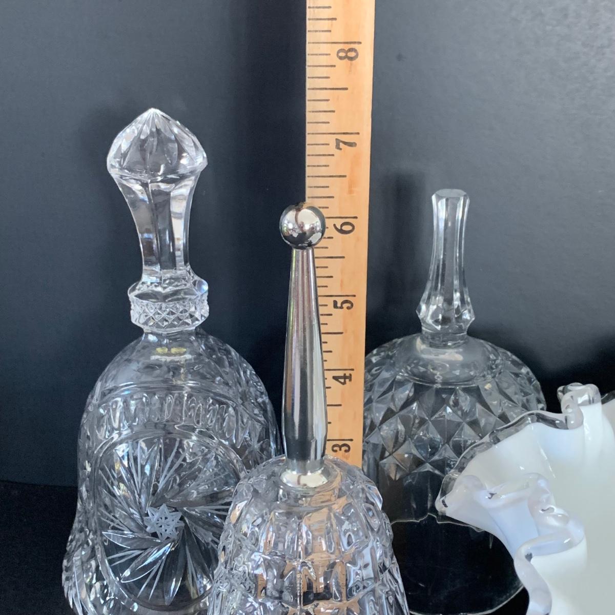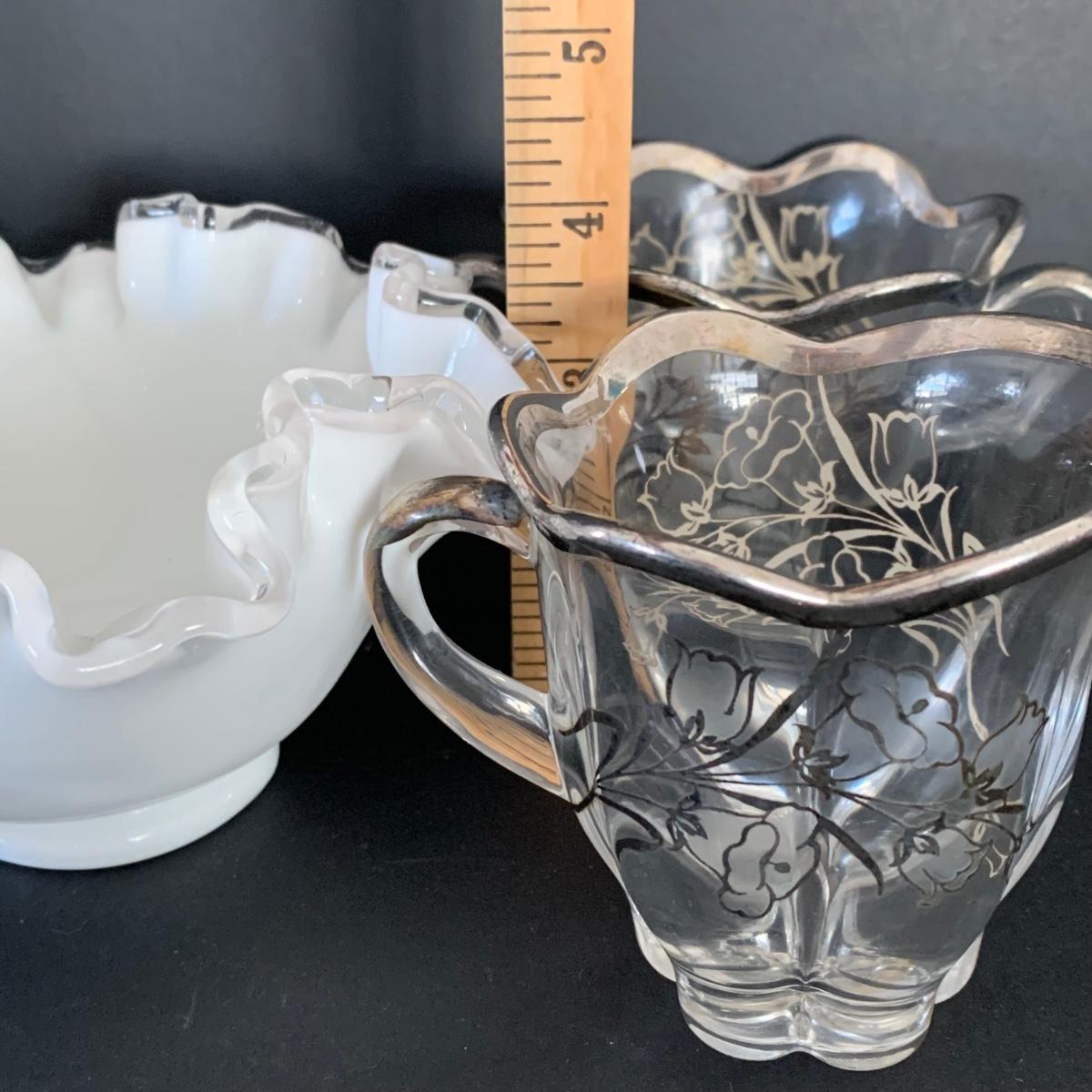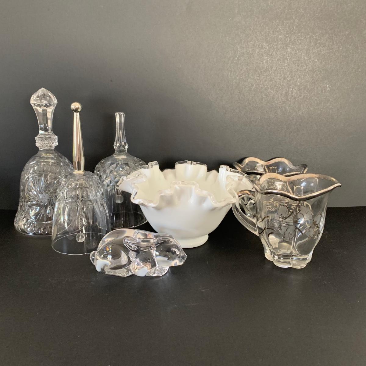 LOT 168: Vintage Milk Glass, Sugar Bowl & Creamer w/Silver Accents, Crystal Bells & Rabbit
