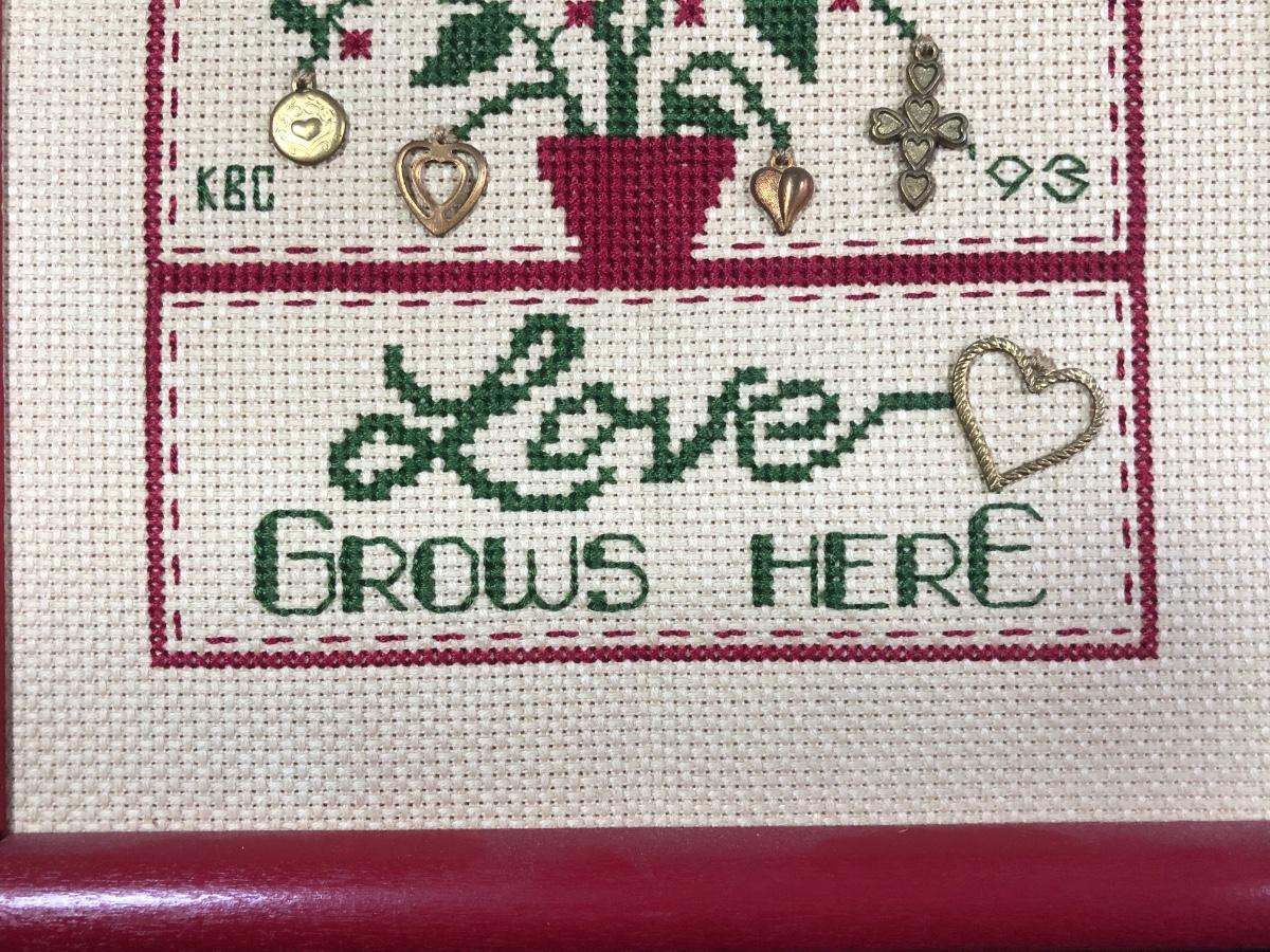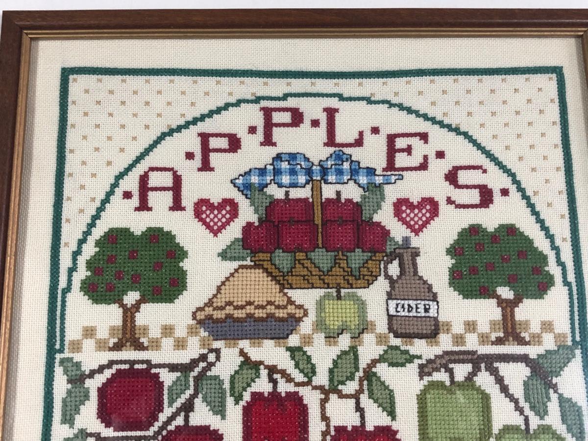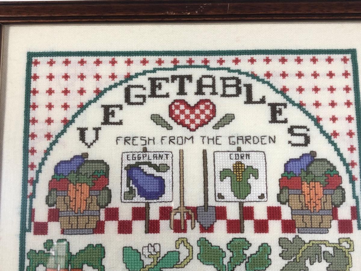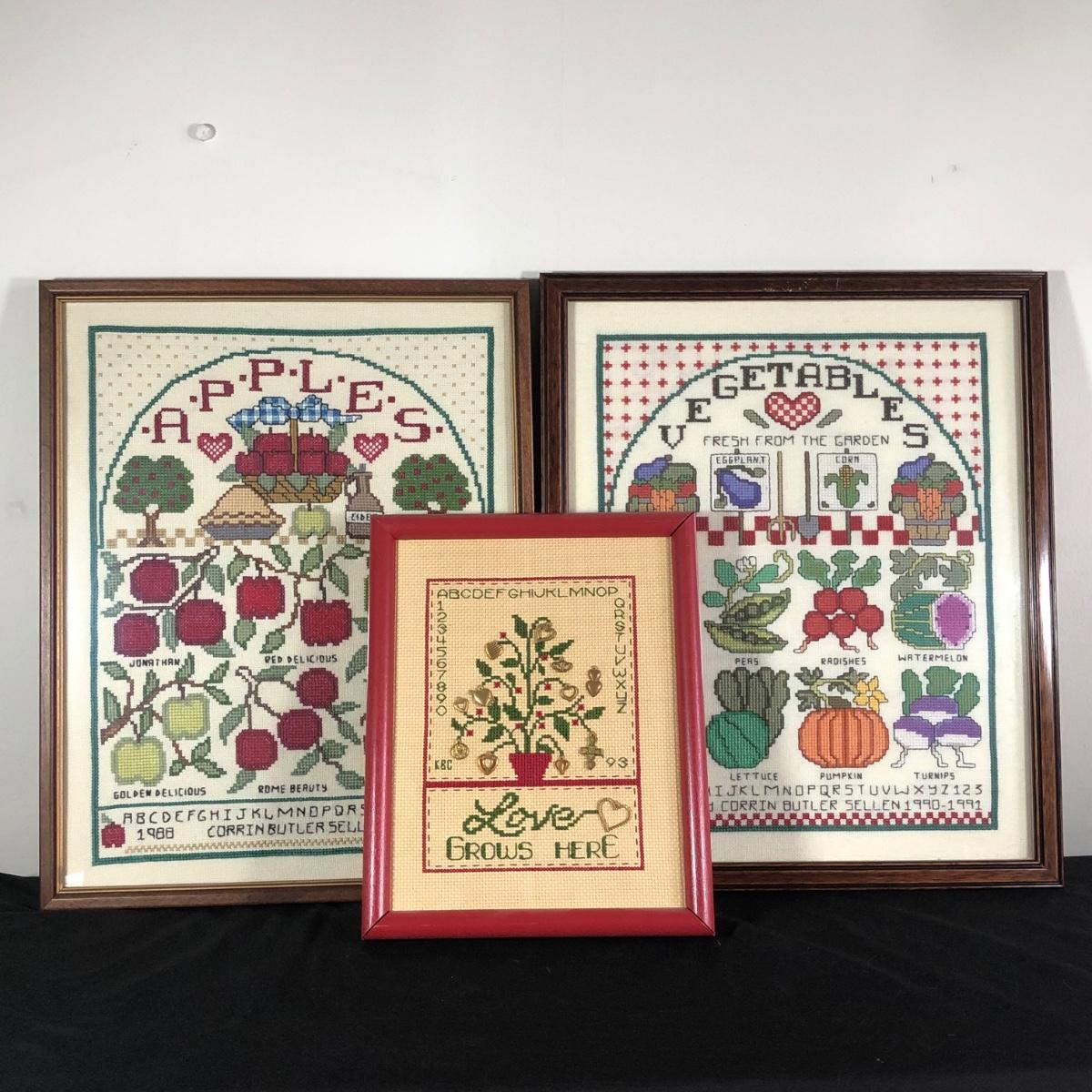 LOT 5M: Vintage 1980s Framed Victorian Vegetables & Apples Cottage Cross Stitches Signed by Artist & Vintage Love Grows Here Cross Stitch / Needlepoint w/ Charms