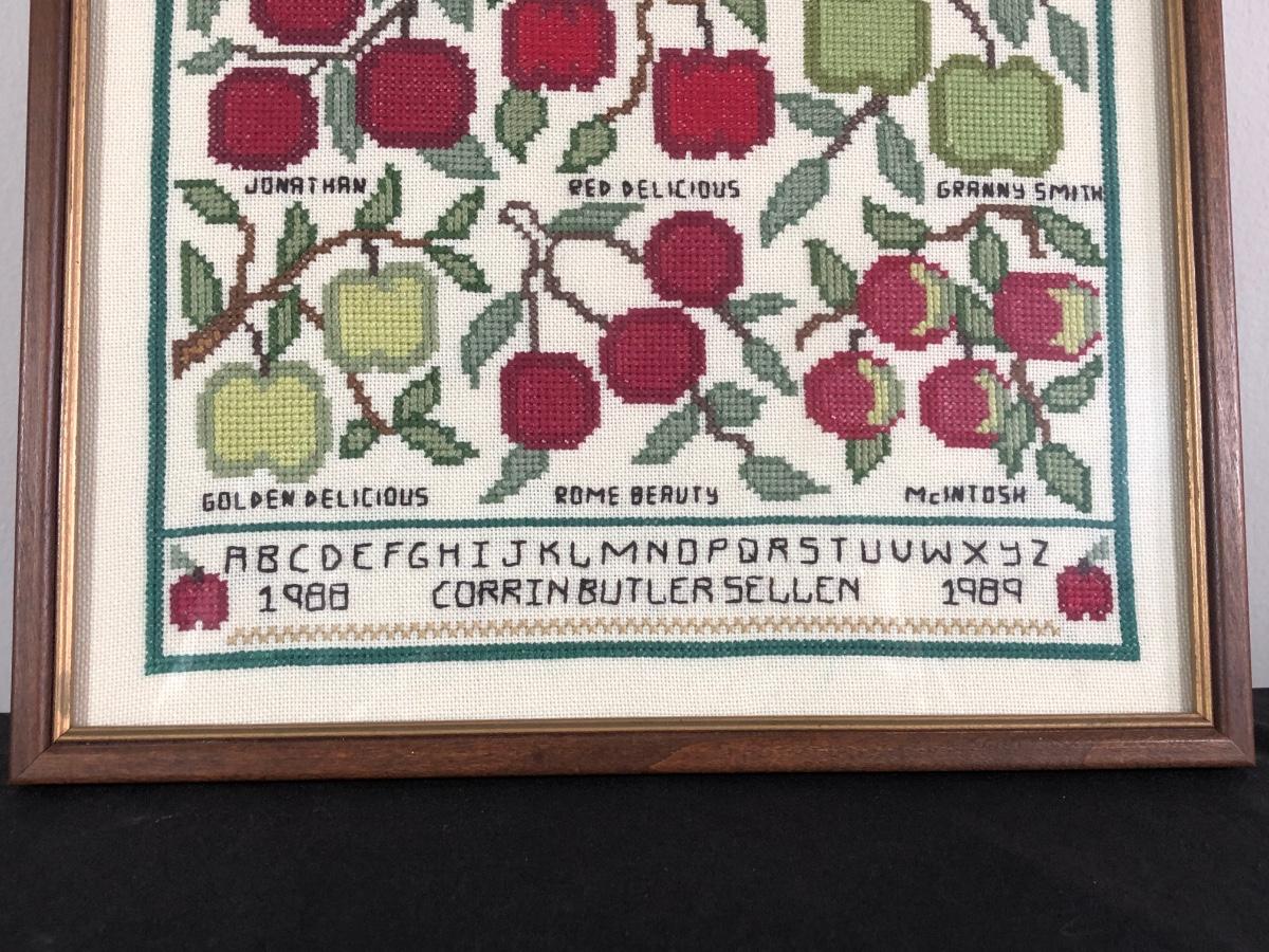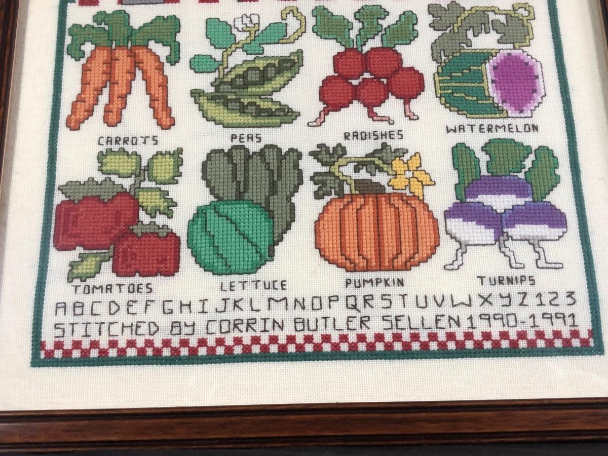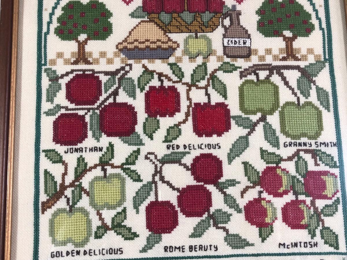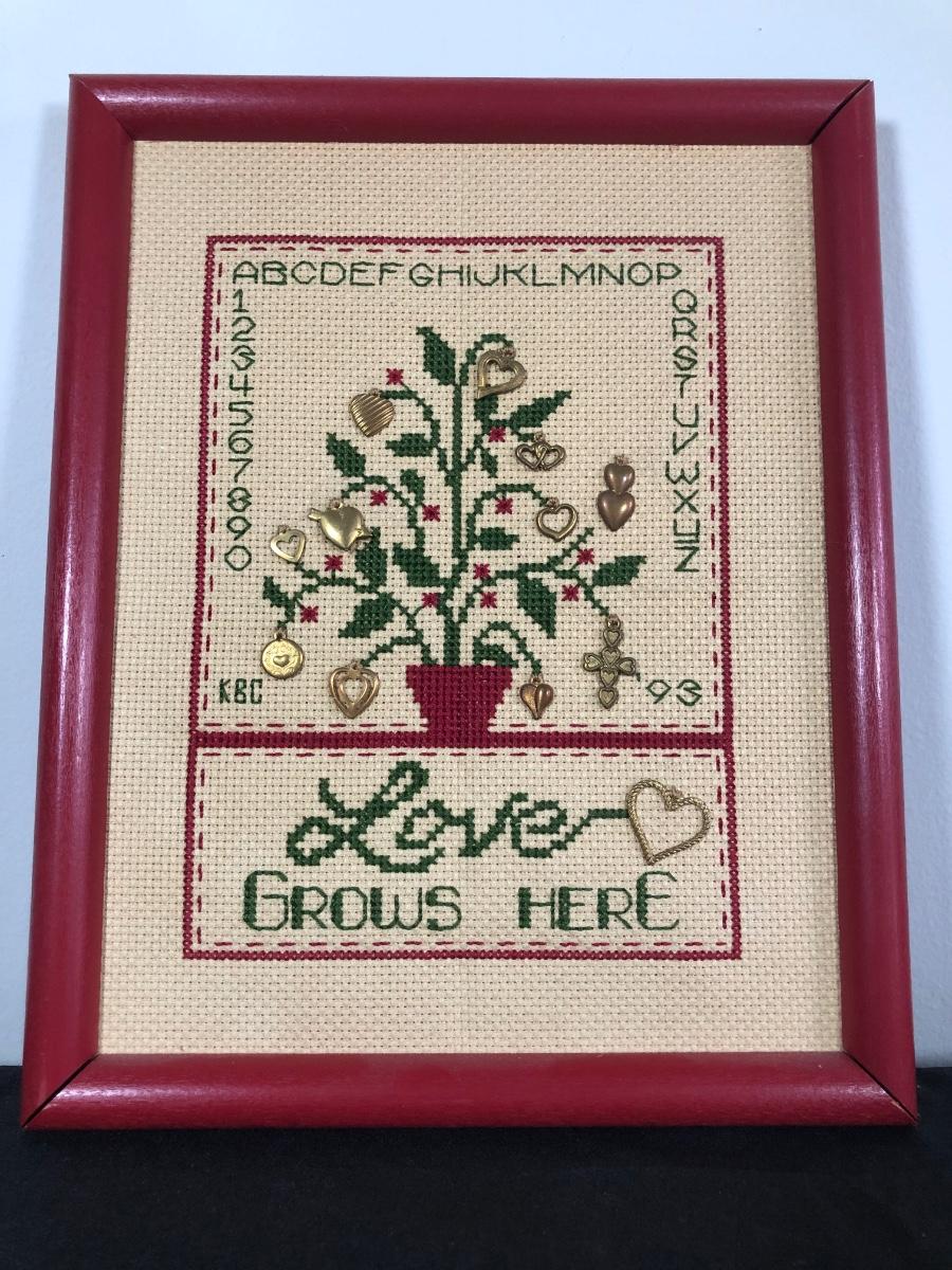LOT 5M: Vintage 1980s Framed Victorian Vegetables & Apples Cottage Cross Stitches Signed by Artist & Vintage Love Grows Here Cross Stitch / Needlepoint w/ Charms