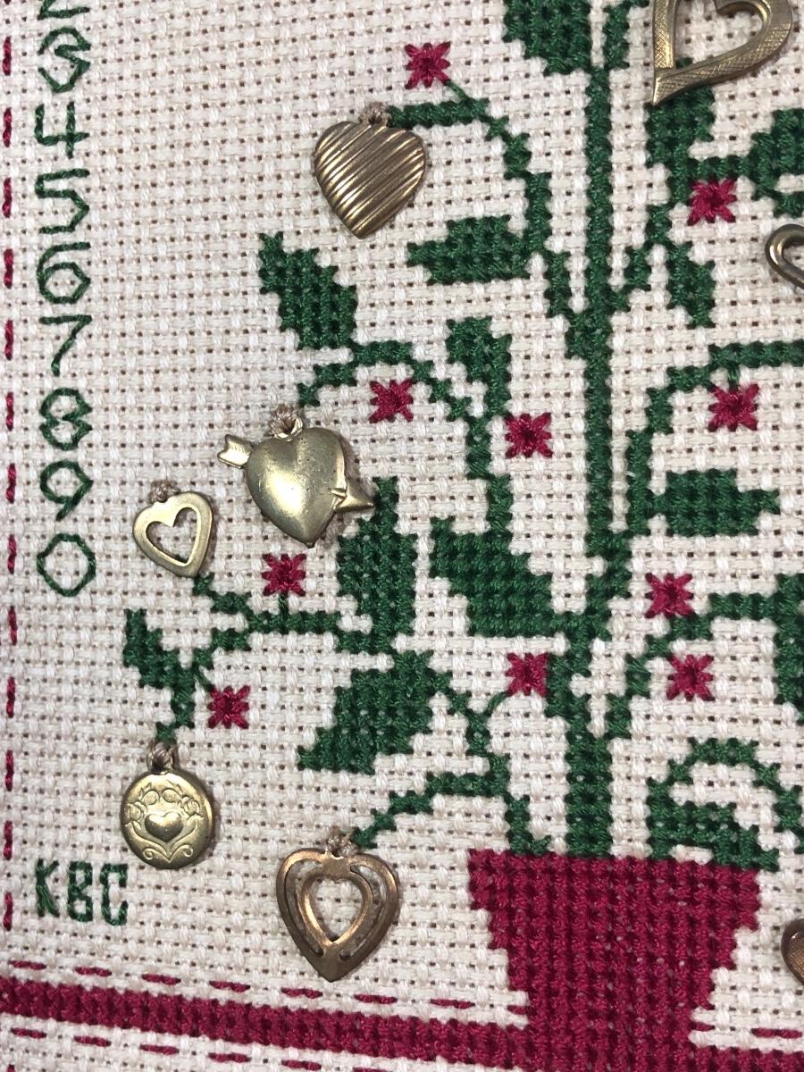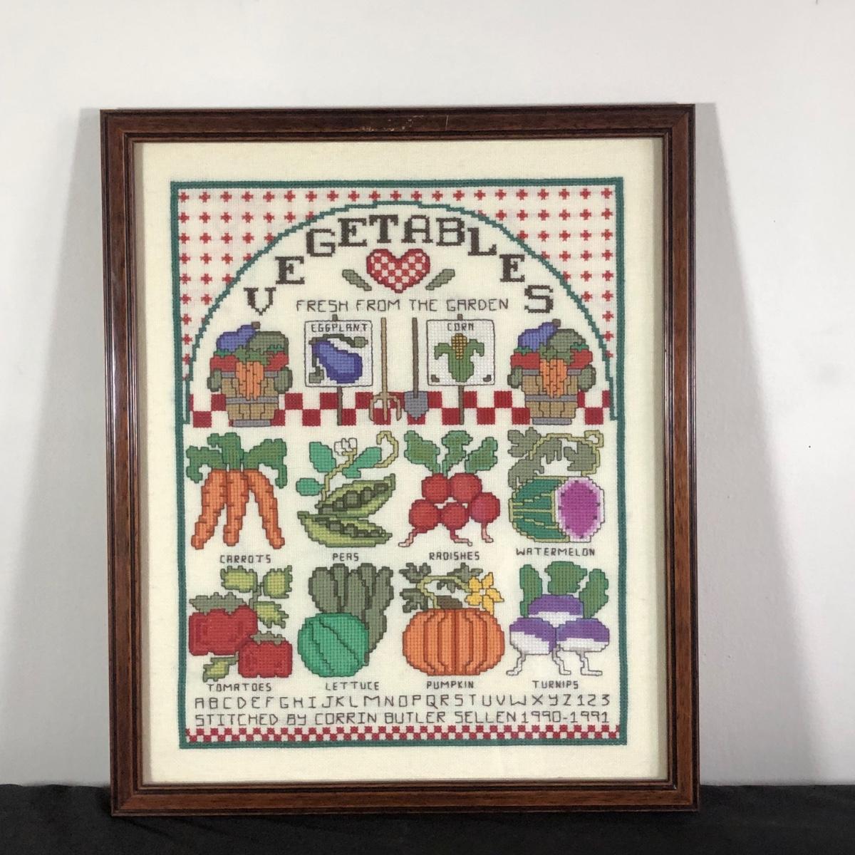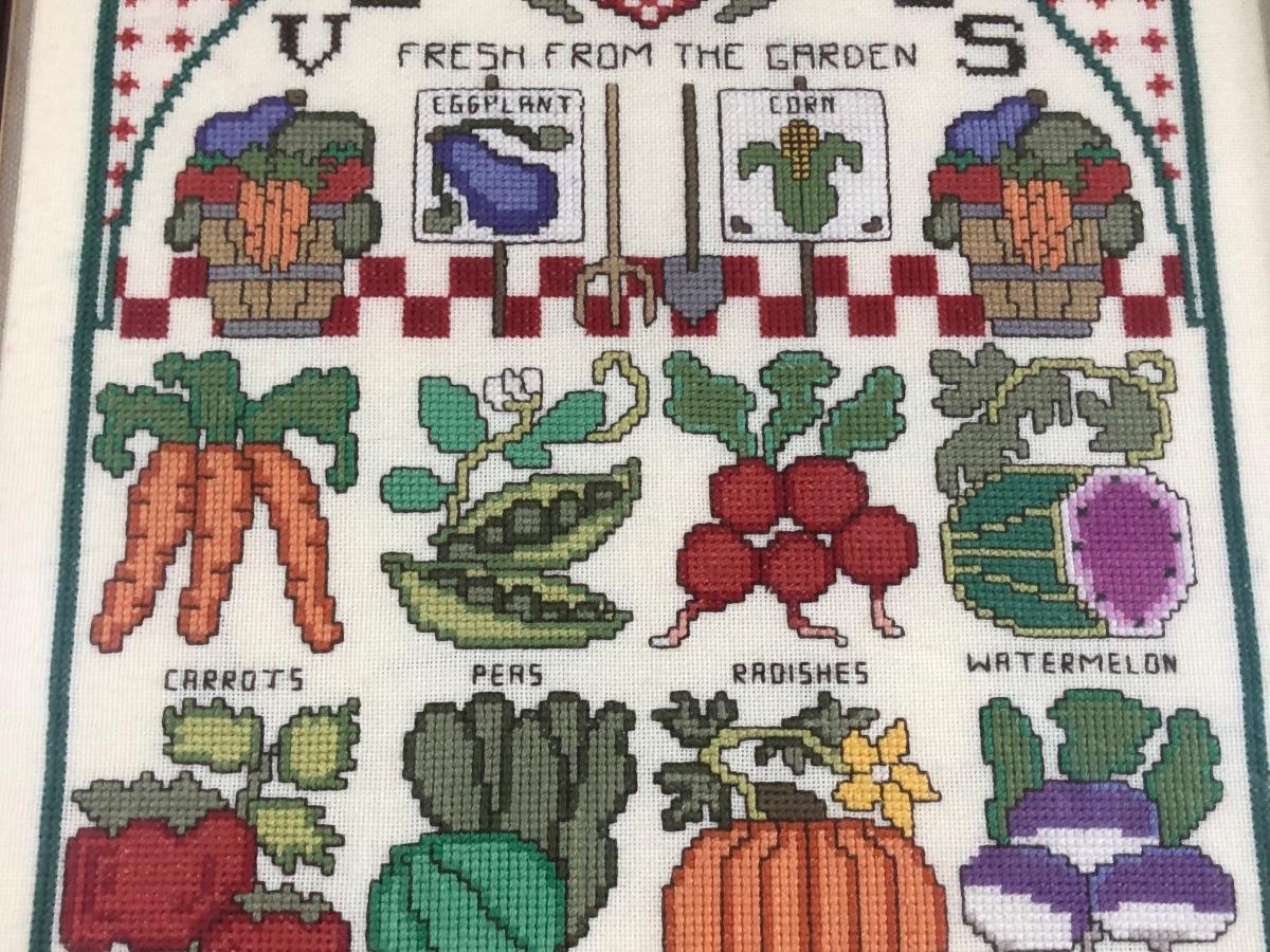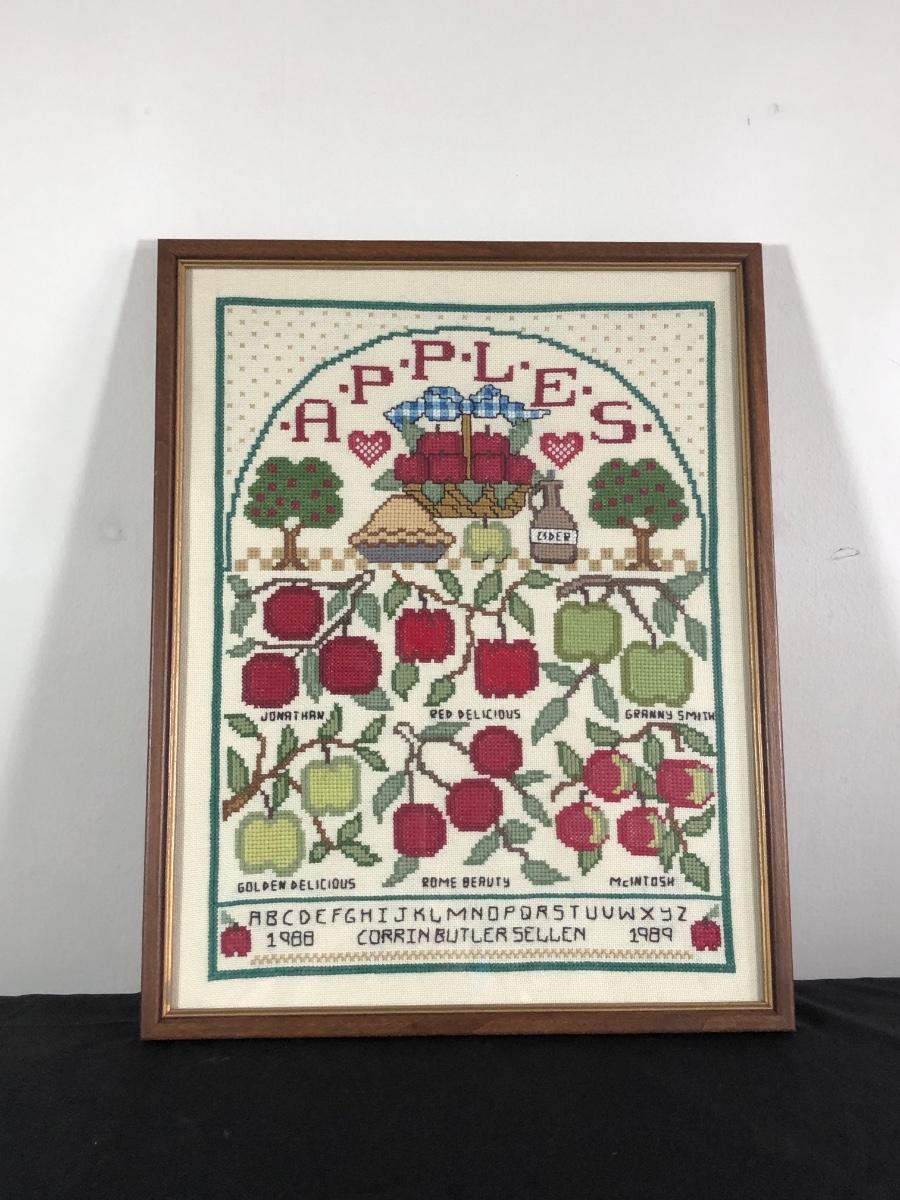 LOT 5M: Vintage 1980s Framed Victorian Vegetables & Apples Cottage Cross Stitches Signed by Artist & Vintage Love Grows Here Cross Stitch / Needlepoint w/ Charms