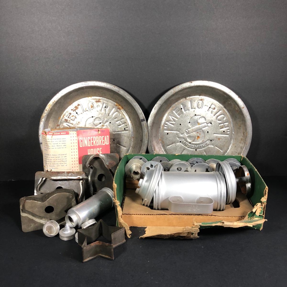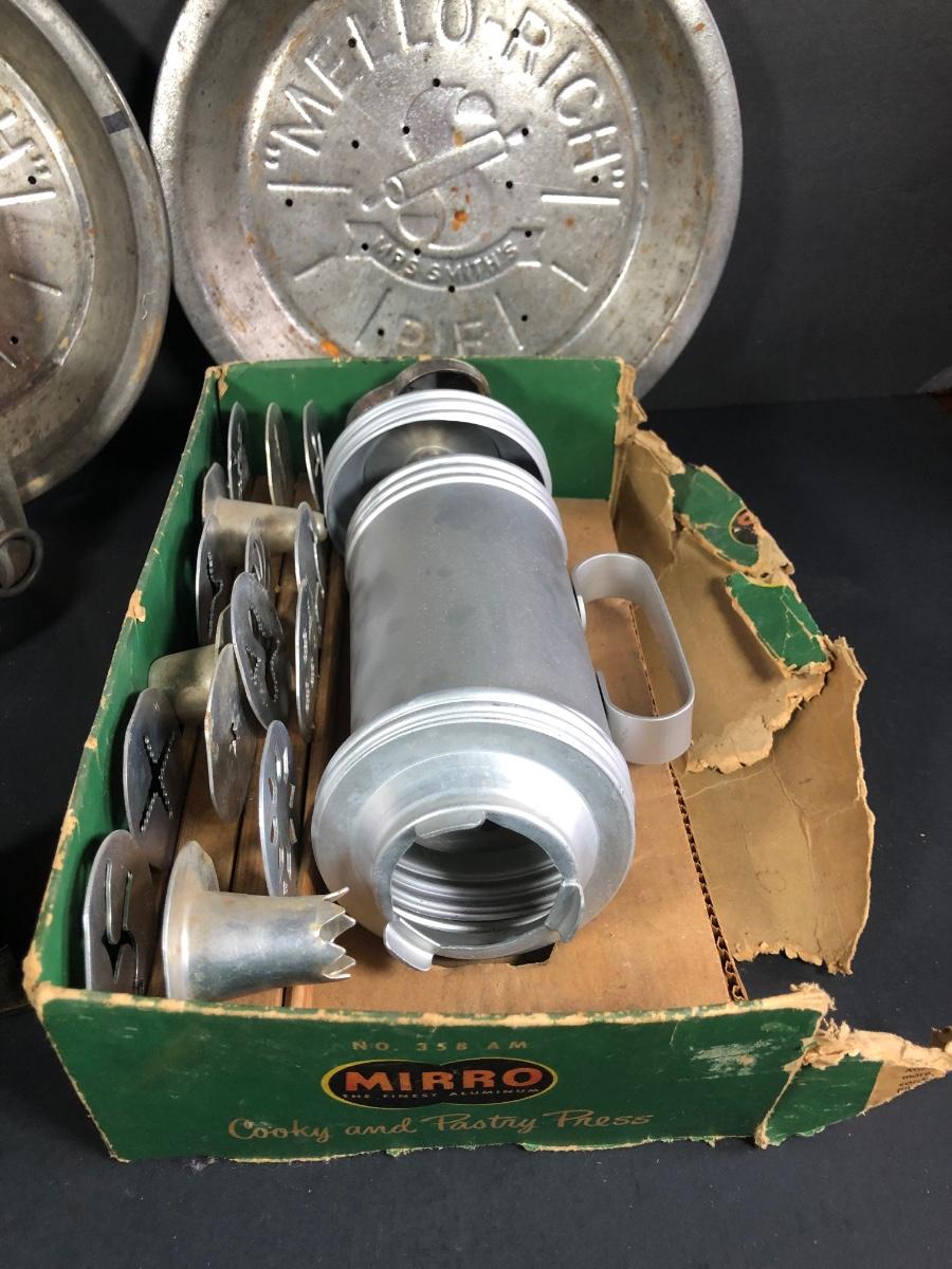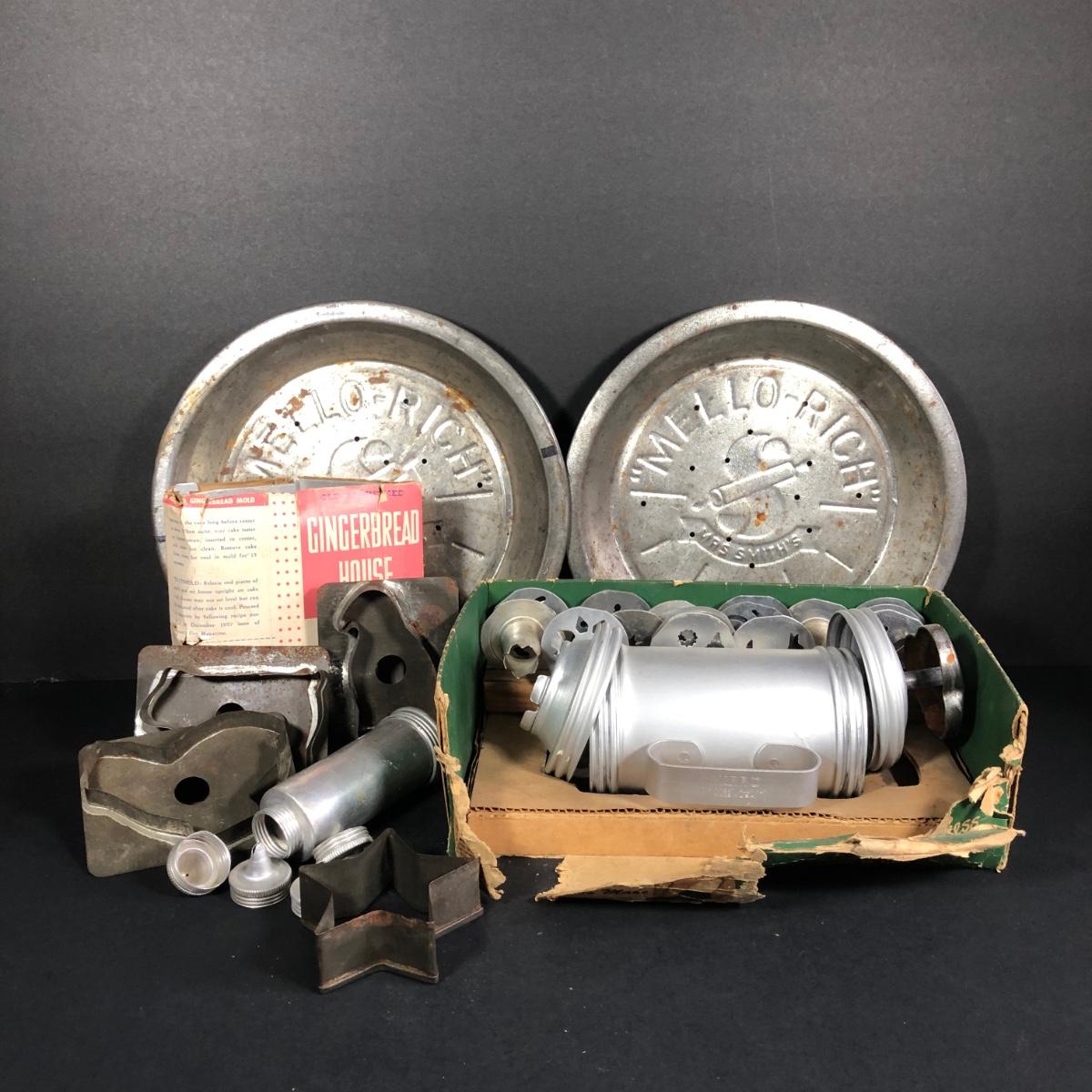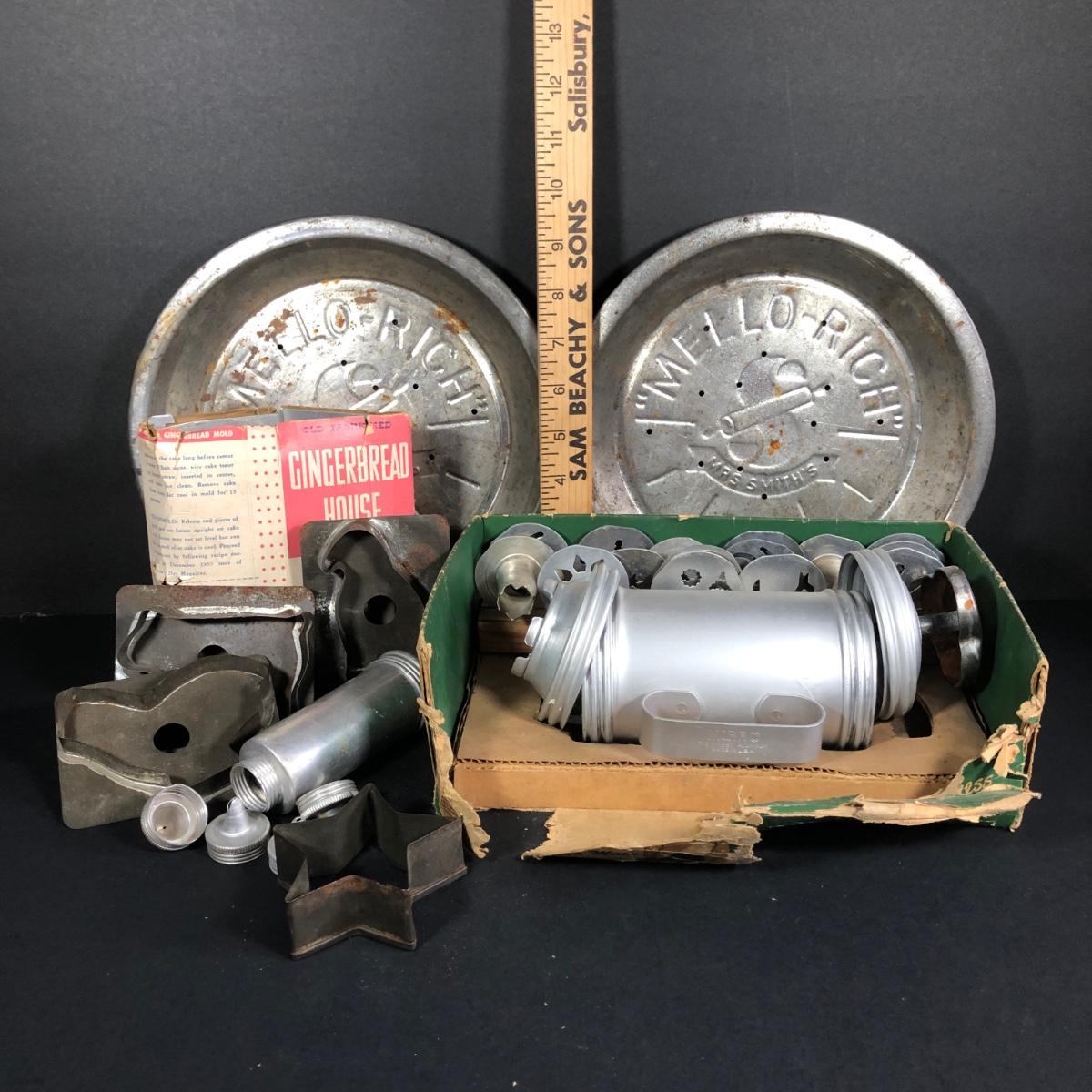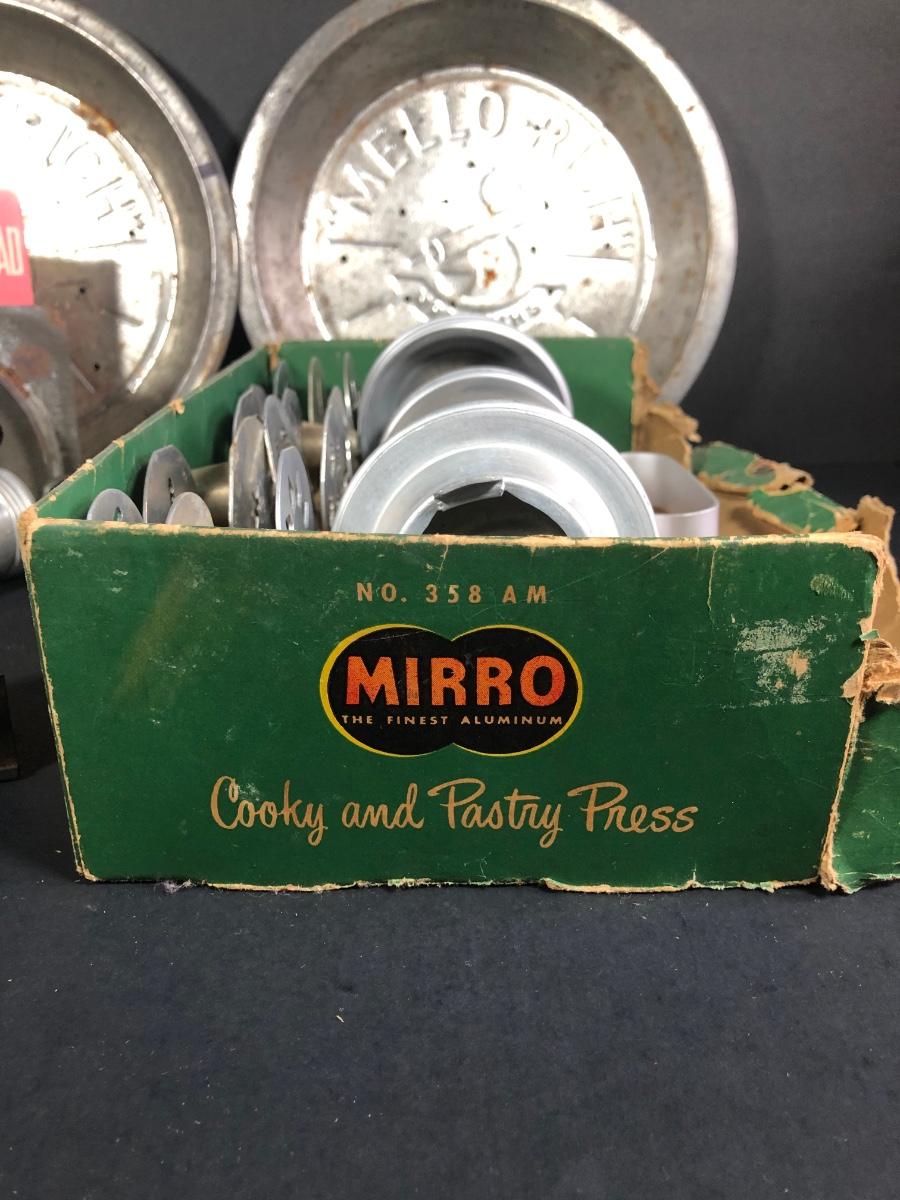 LOT 36M: Vintage Baking Collection - Mirro Cooky and Pastry Press, Metal Cake Decorator, Alumode Old Fashioned Ginger Bread House Mold & Mrs Smith's Mello-Rich Pie Pans