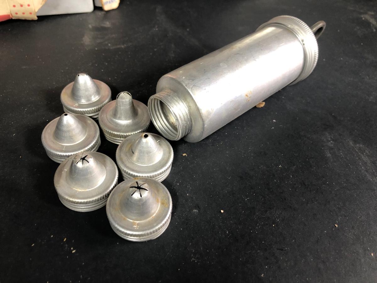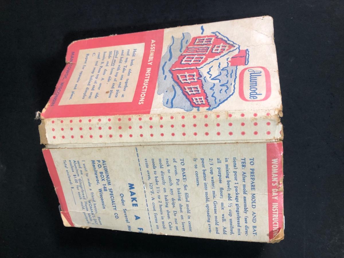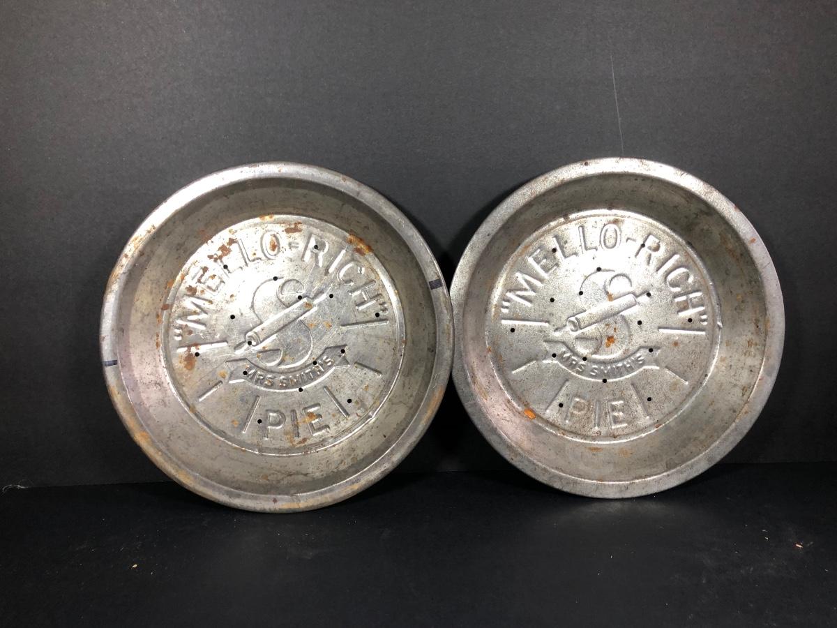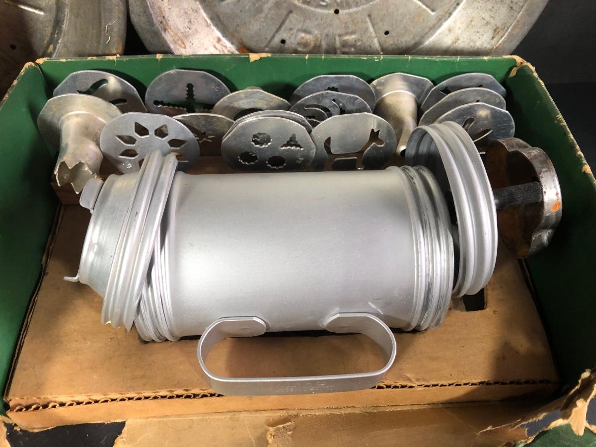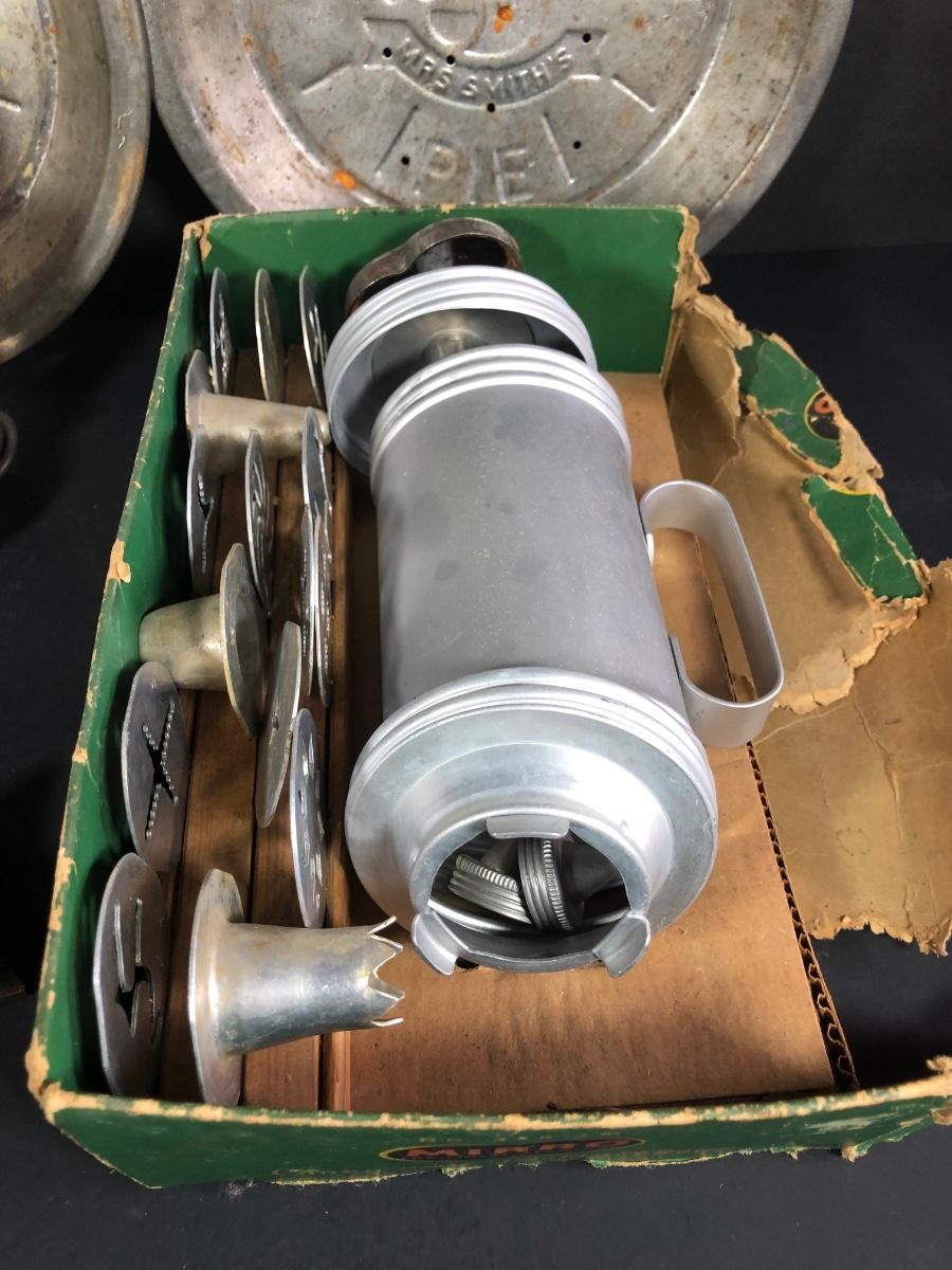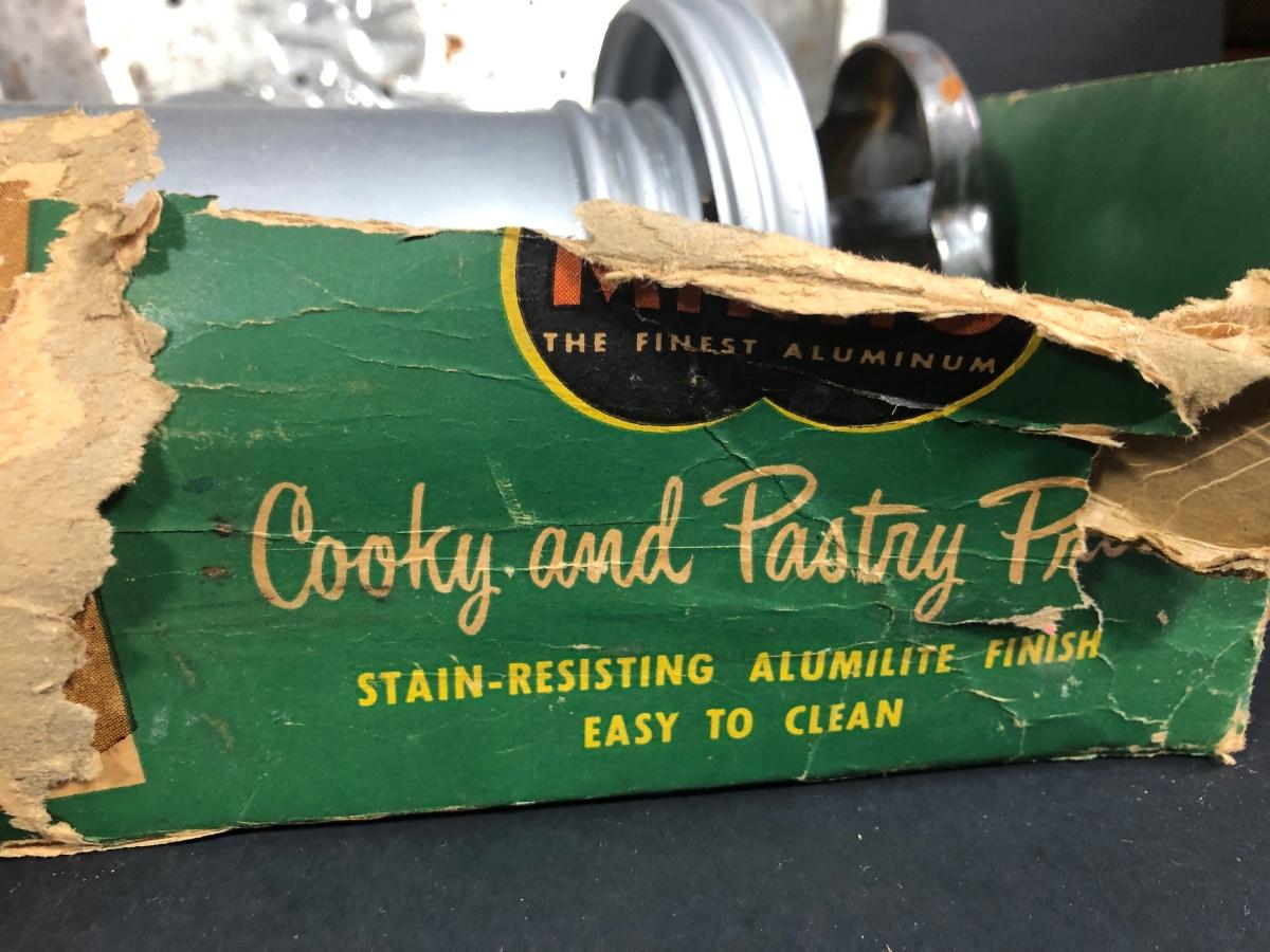 LOT 36M: Vintage Baking Collection - Mirro Cooky and Pastry Press, Metal Cake Decorator, Alumode Old Fashioned Ginger Bread House Mold & Mrs Smith's Mello-Rich Pie Pans