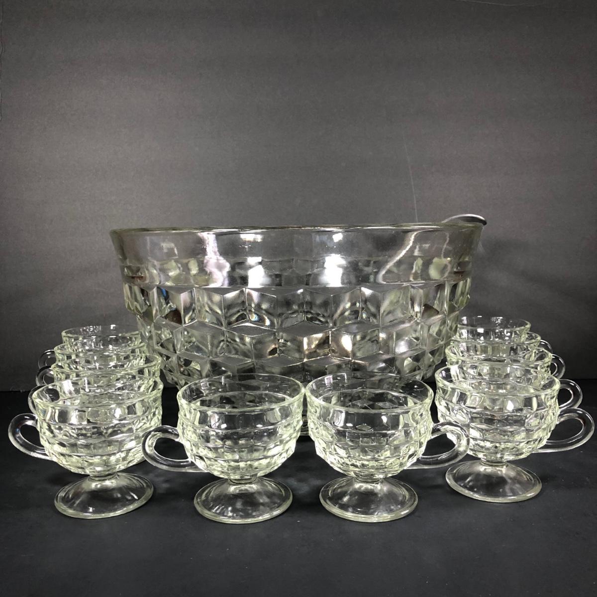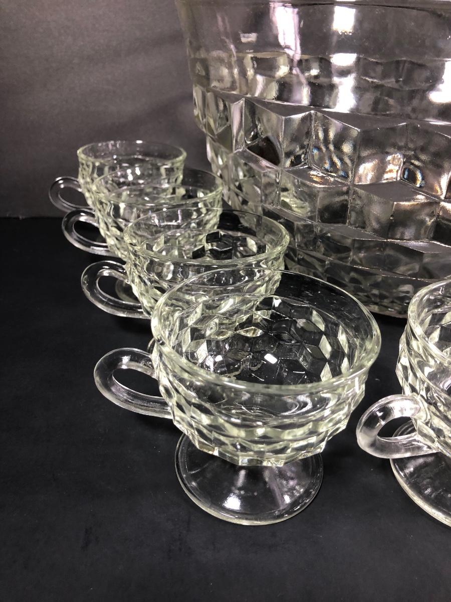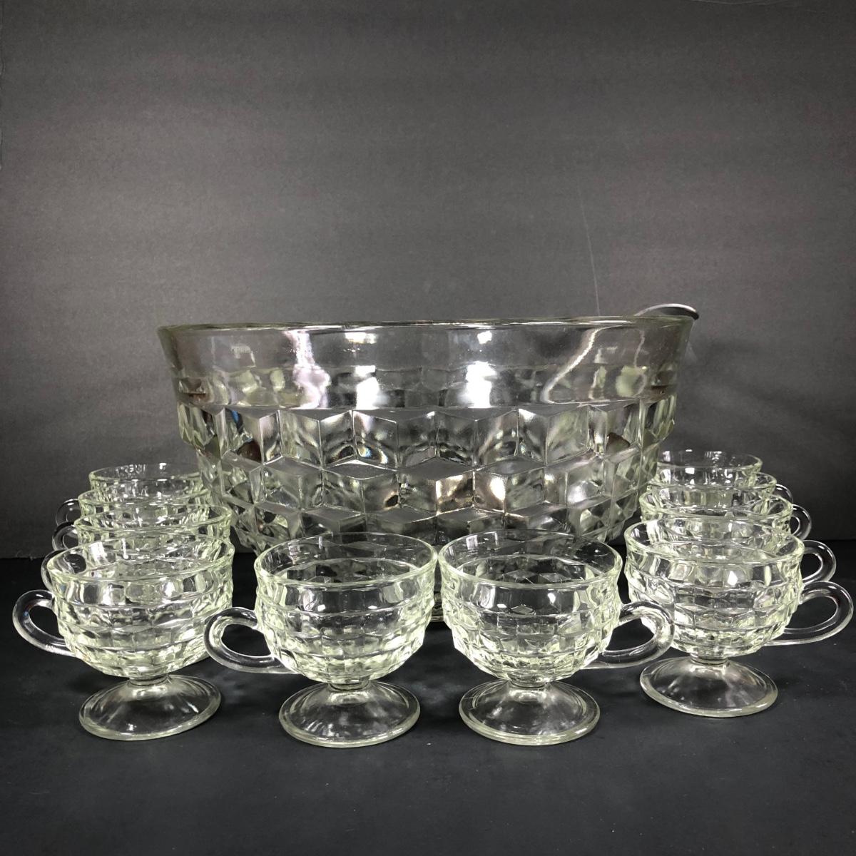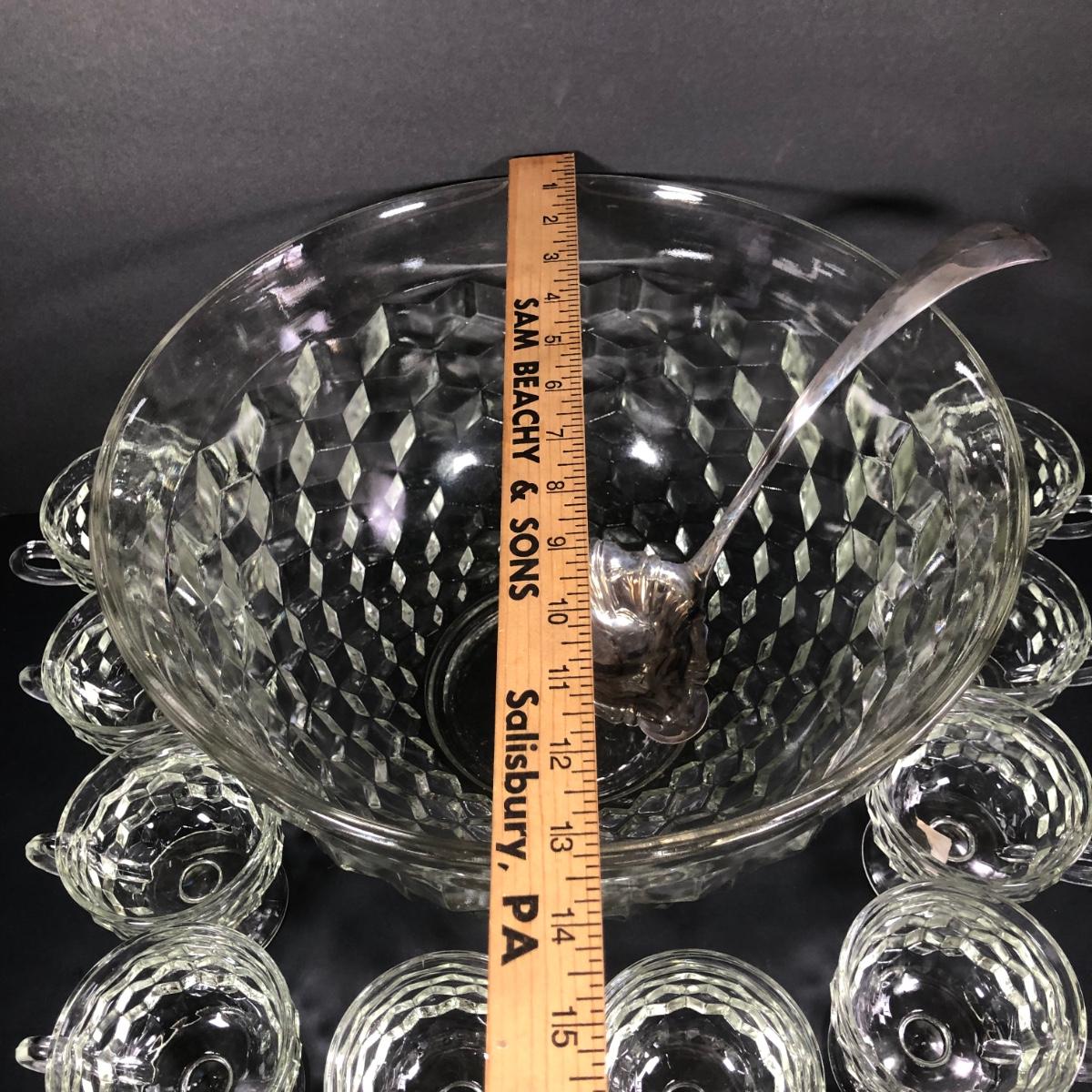 LOT 42D: Vintage American Fostoria Cube Pattern Glass Punch Bowl w/ 11 Matching Cups & Silver Plated Serving Spoon