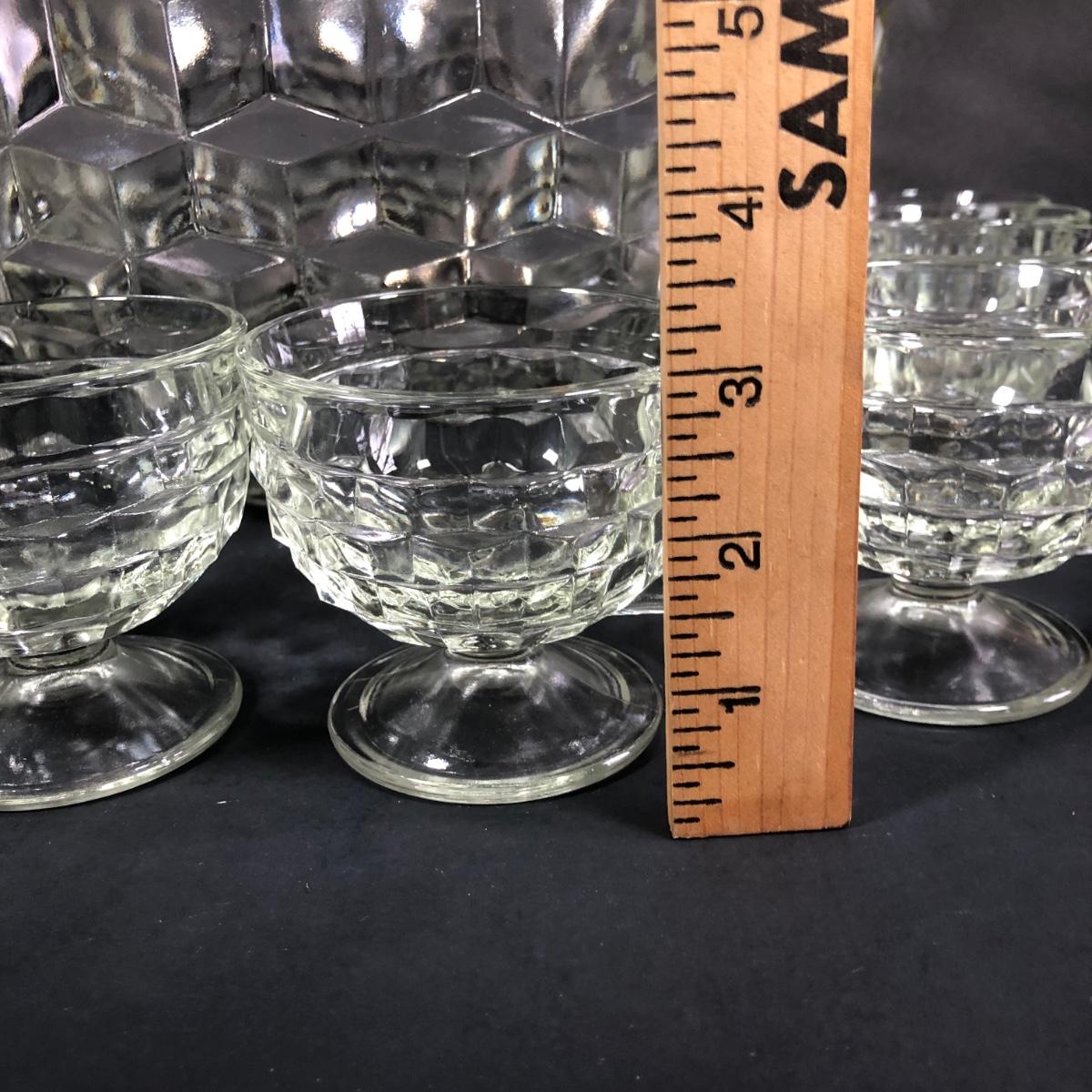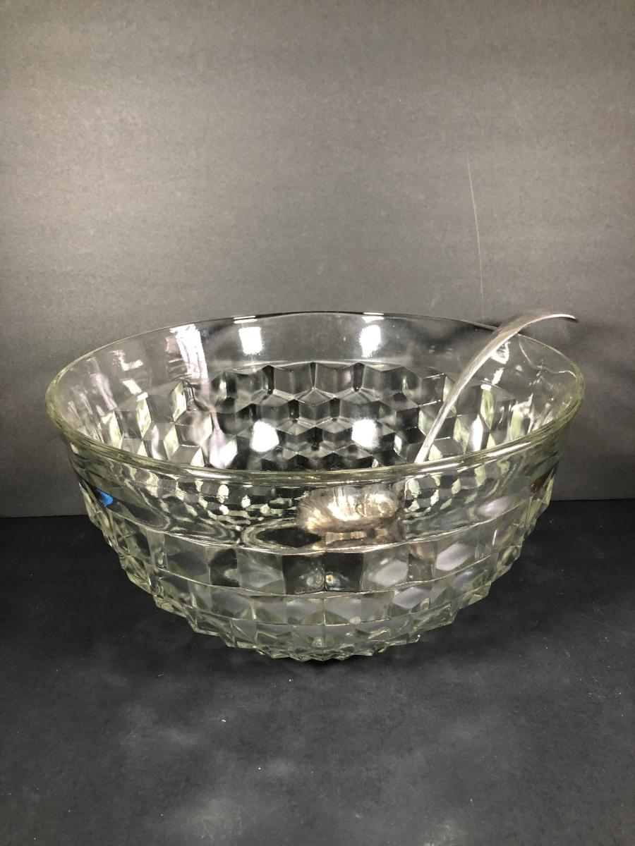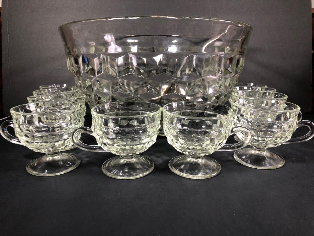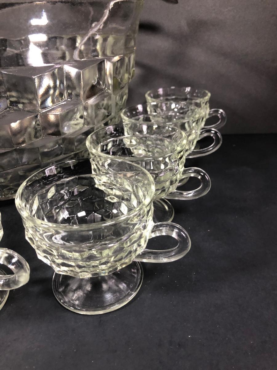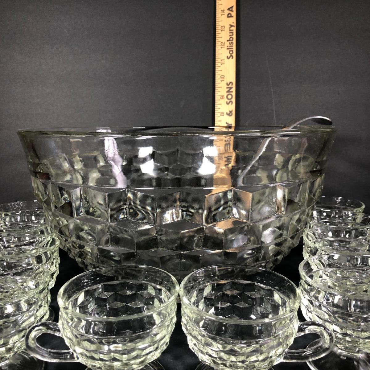 LOT 42D: Vintage American Fostoria Cube Pattern Glass Punch Bowl w/ 11 Matching Cups & Silver Plated Serving Spoon