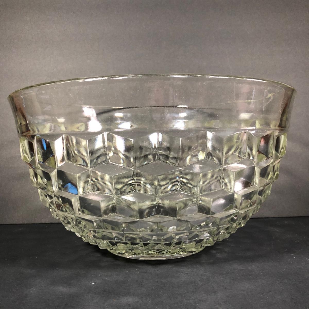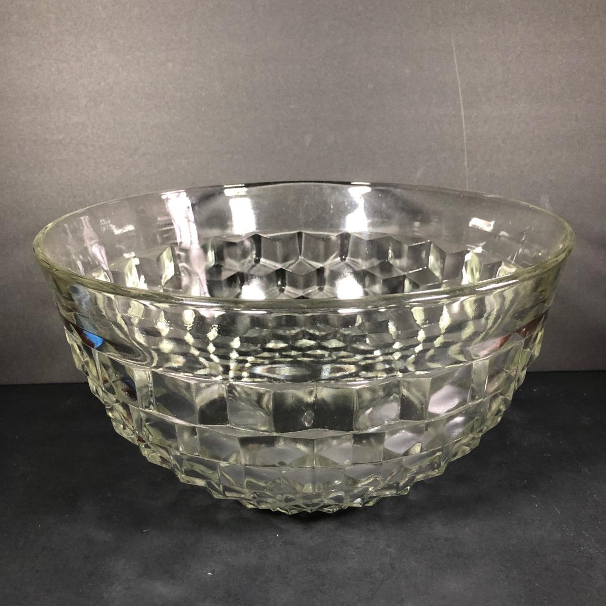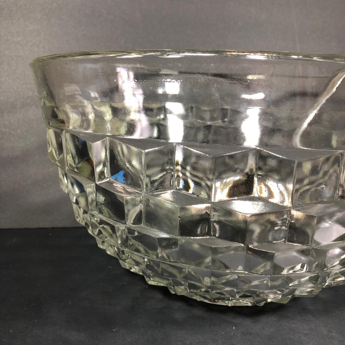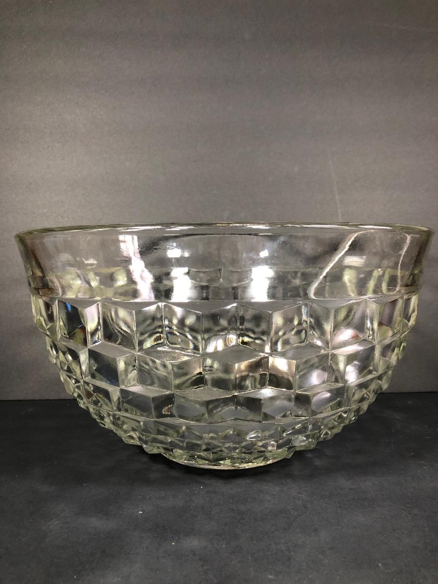 LOT 42D: Vintage American Fostoria Cube Pattern Glass Punch Bowl w/ 11 Matching Cups & Silver Plated Serving Spoon