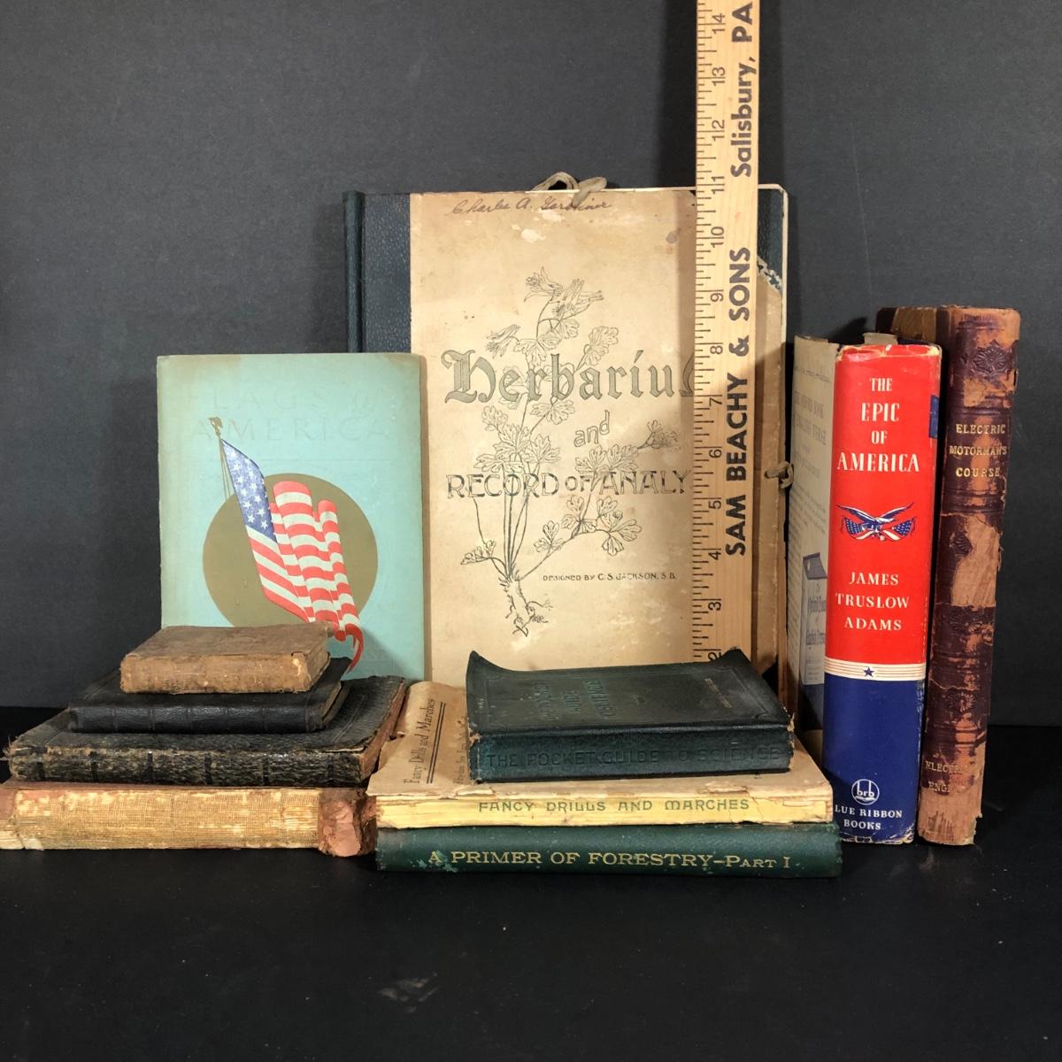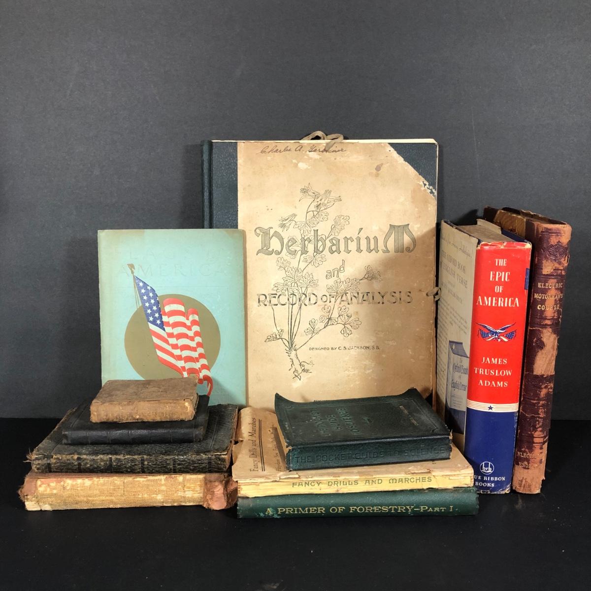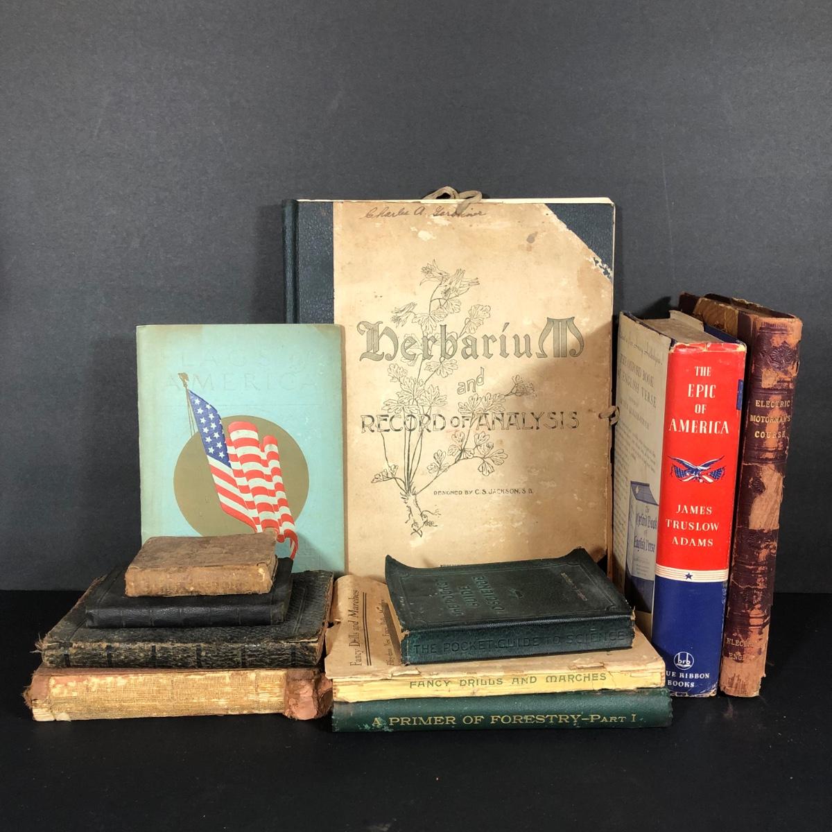 LOT 68C: Antique & Vintage Books - 1922 Herbarium and Record of Analysis (Filled Out), 1924 Pocket Guide to Science, 1915 Fancy Drills and Marches, 1900 Primer of Forestry & More