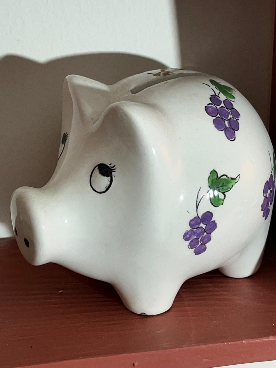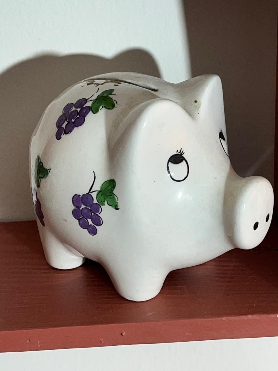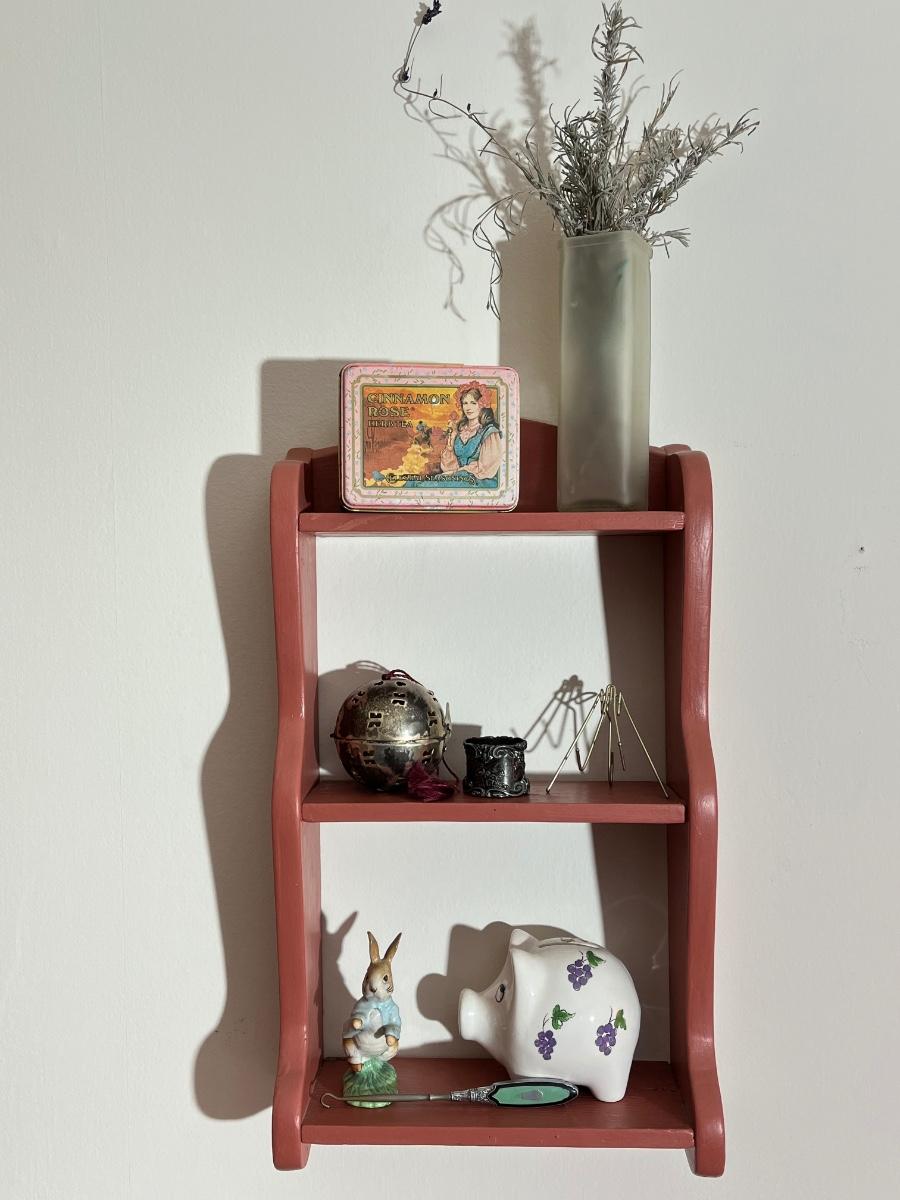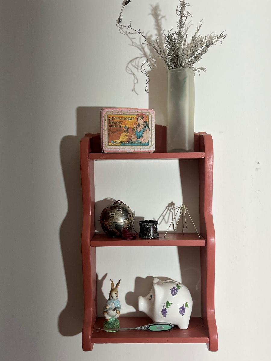 LOT 93X: Hanging Wall Shelf with Home Decor Pieces - Weiss Piggy Bank & More