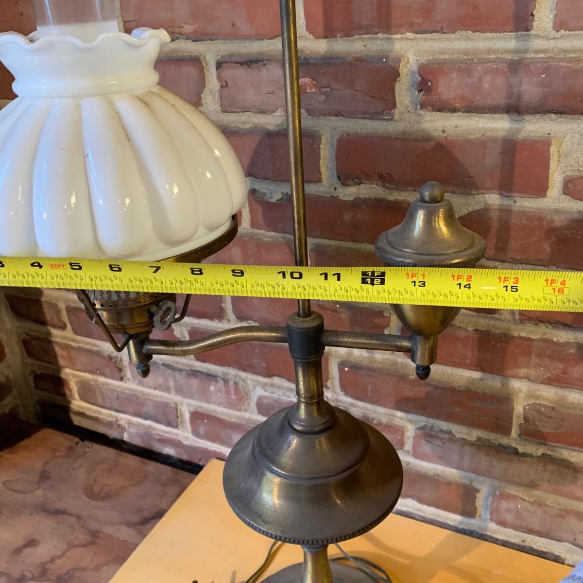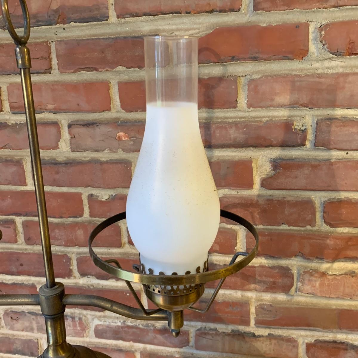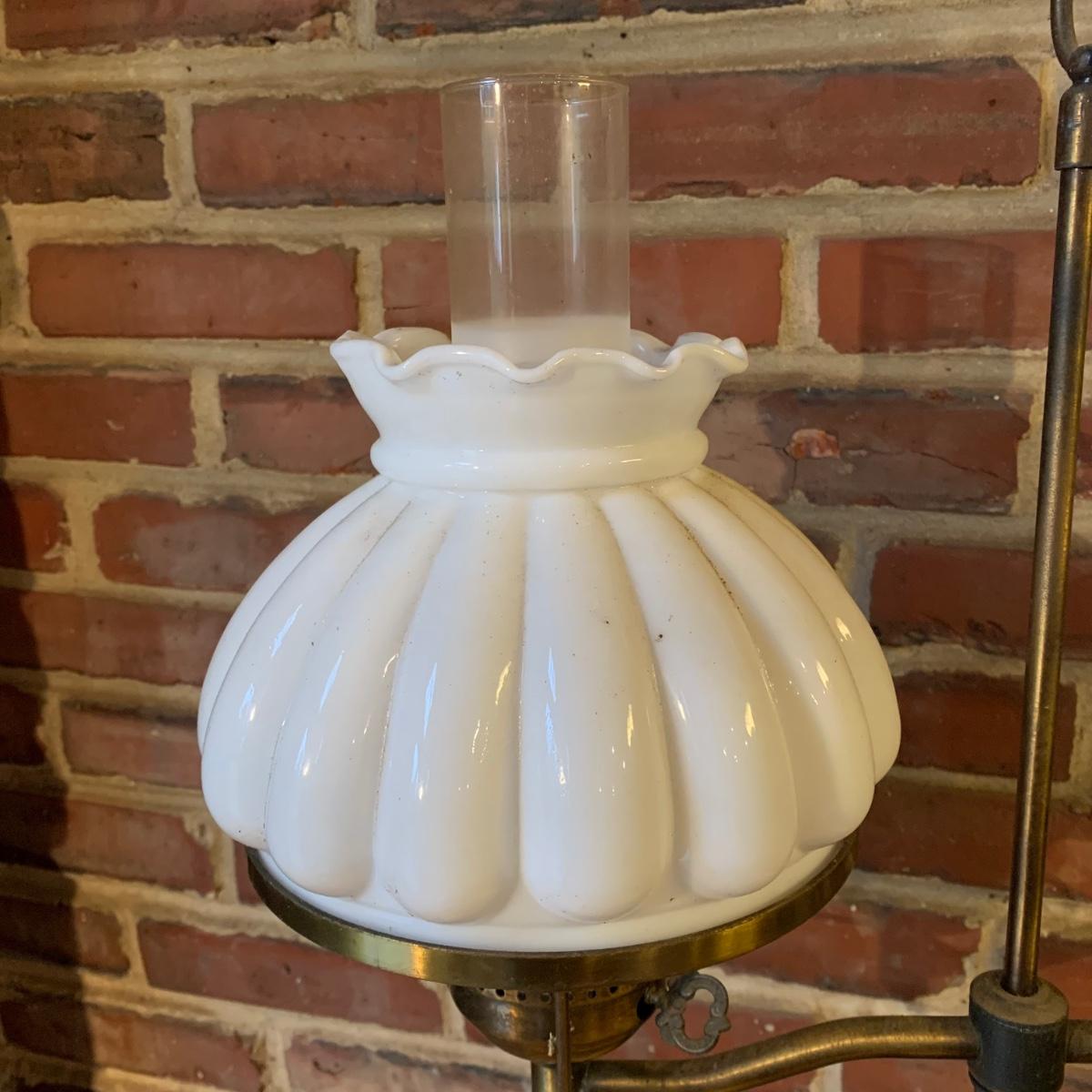 LOT 114 Q: Vintage Brass "Student Lamp" W/ Milk Glass Shade & Painted Glass Chimney