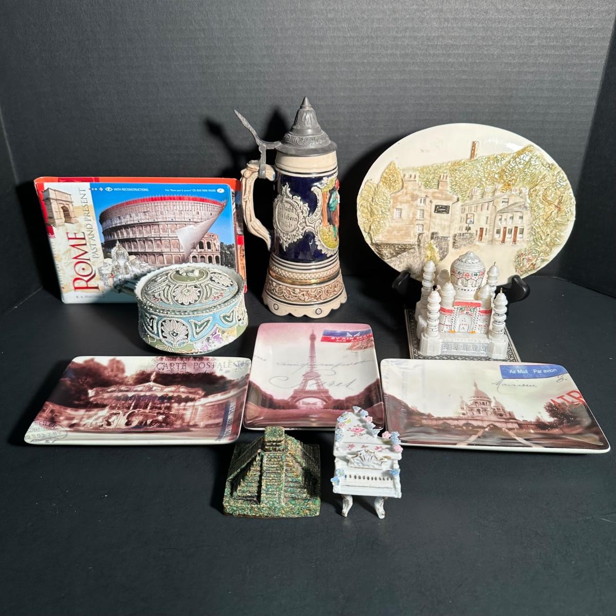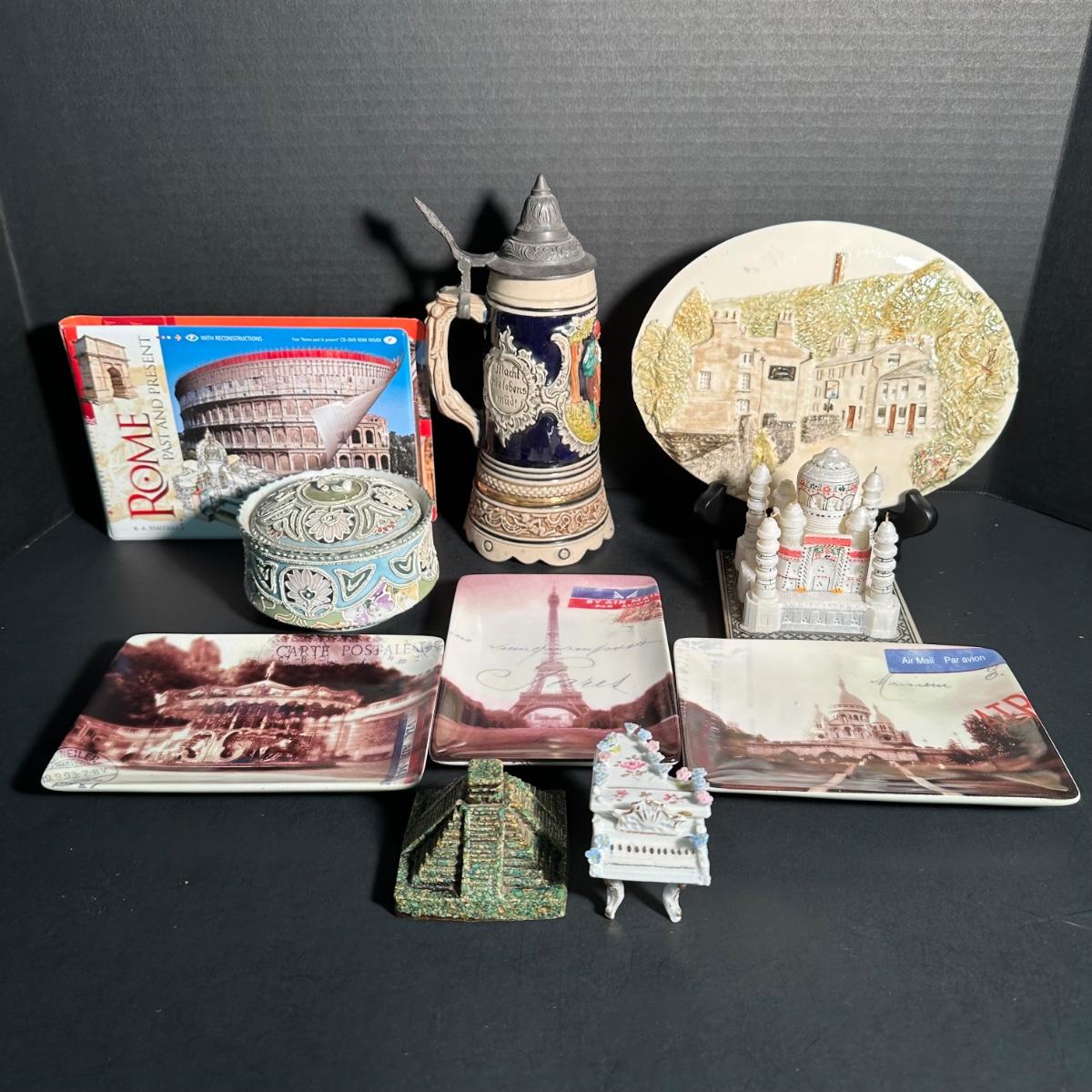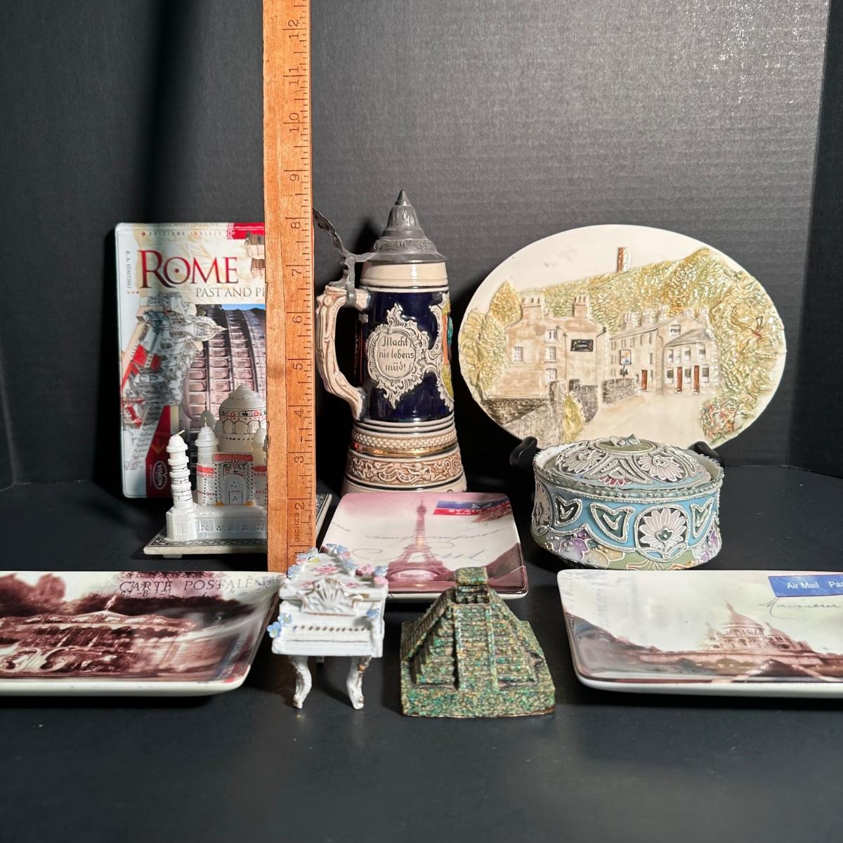 LOT 134D: Collection Of Foreign Souvenirs - German Musical Stein, Post Card Plates & More