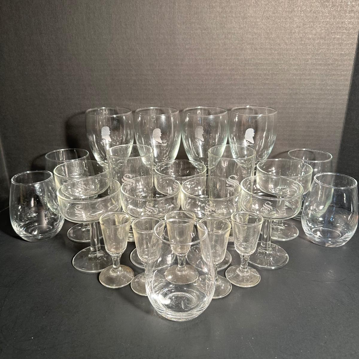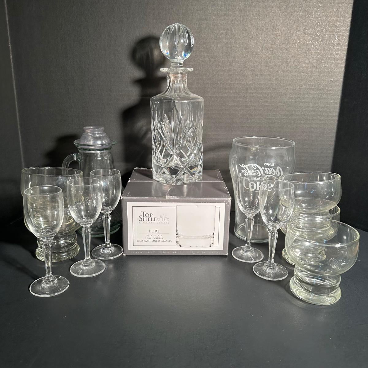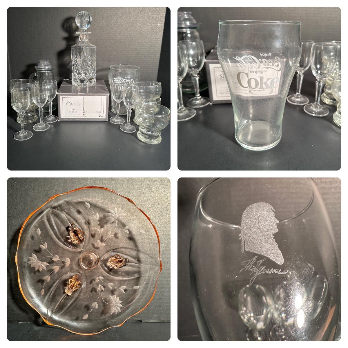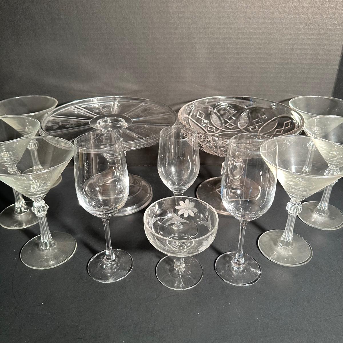 LOT 154D: Bar Collection - Top Shelf Old Fashion Glasses, Lancaster Glass 3 Footed Rose Petal Pink Scalloped Bow, & More