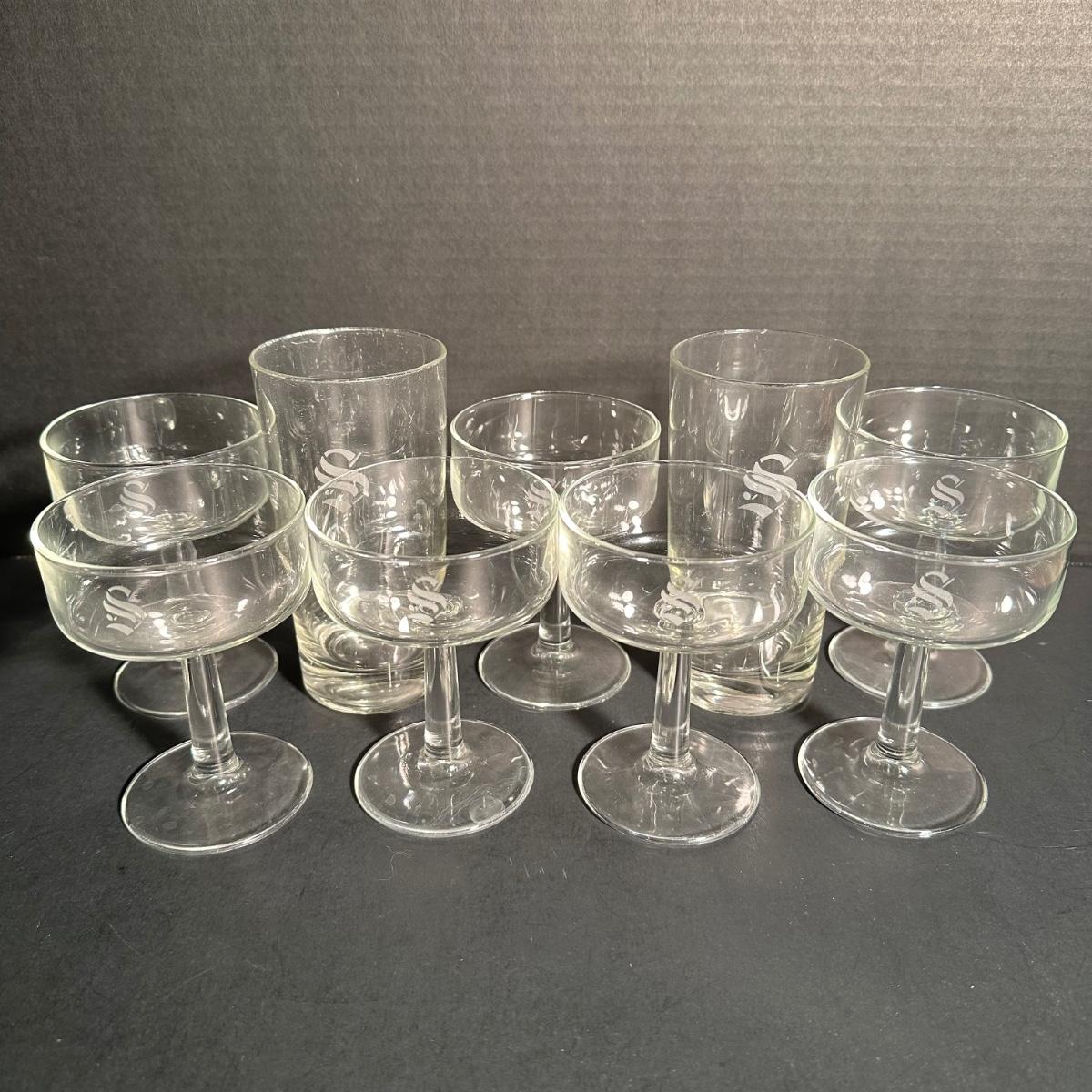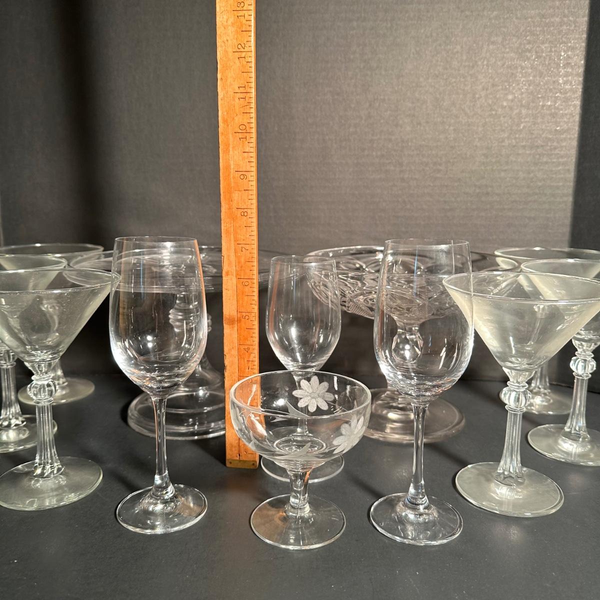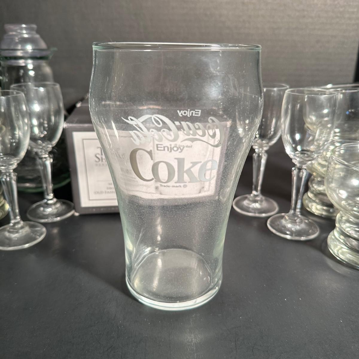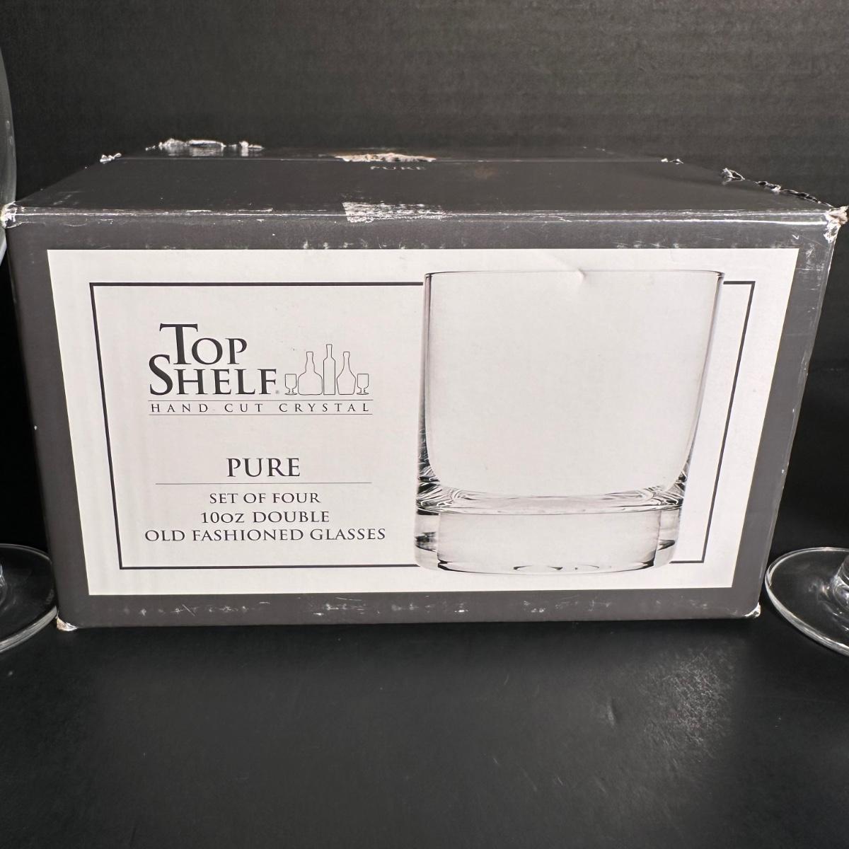 LOT 154D: Bar Collection - Top Shelf Old Fashion Glasses, Lancaster Glass 3 Footed Rose Petal Pink Scalloped Bow, & More