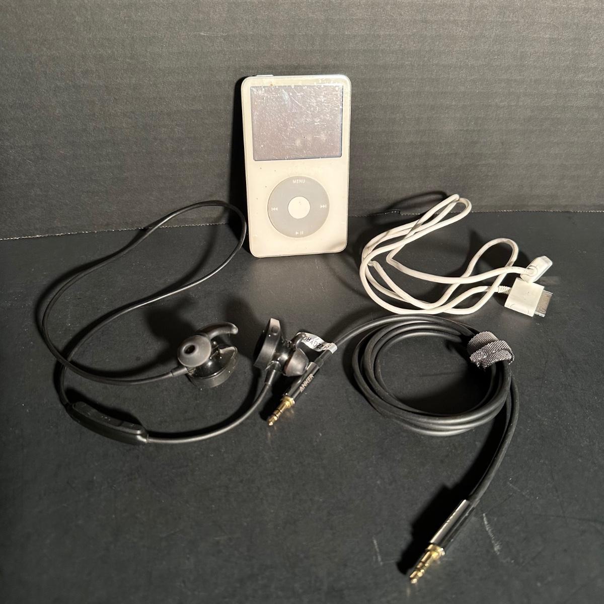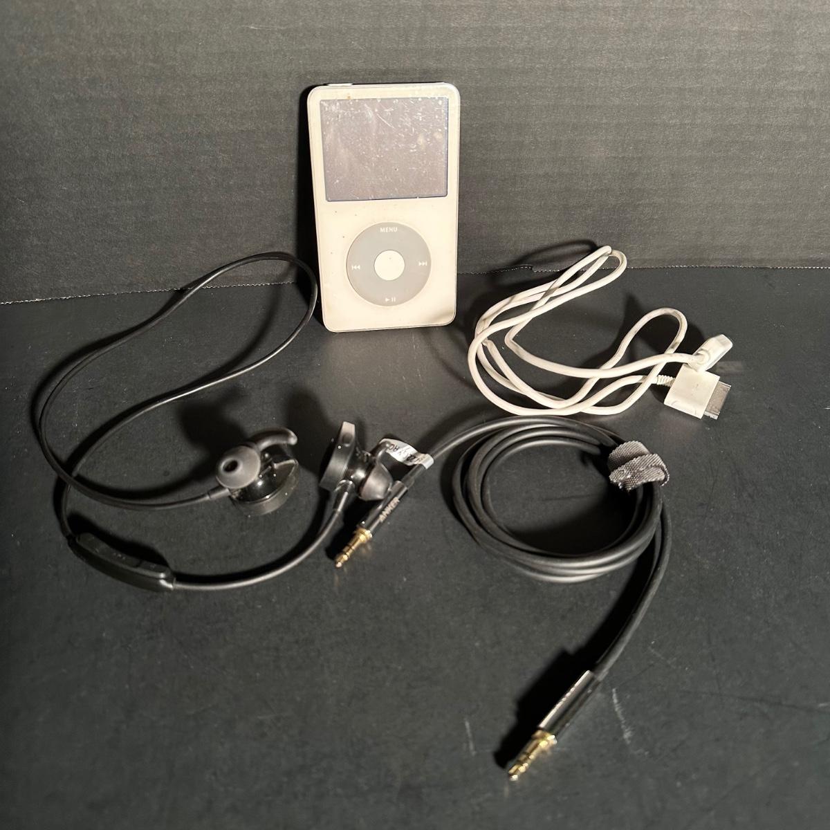 LOT 158D: Apple IPod 5th Generation Model A1136 w/ Charging Cable, Auxiliary Cord & Bose Wireless Bluetooth Headphones