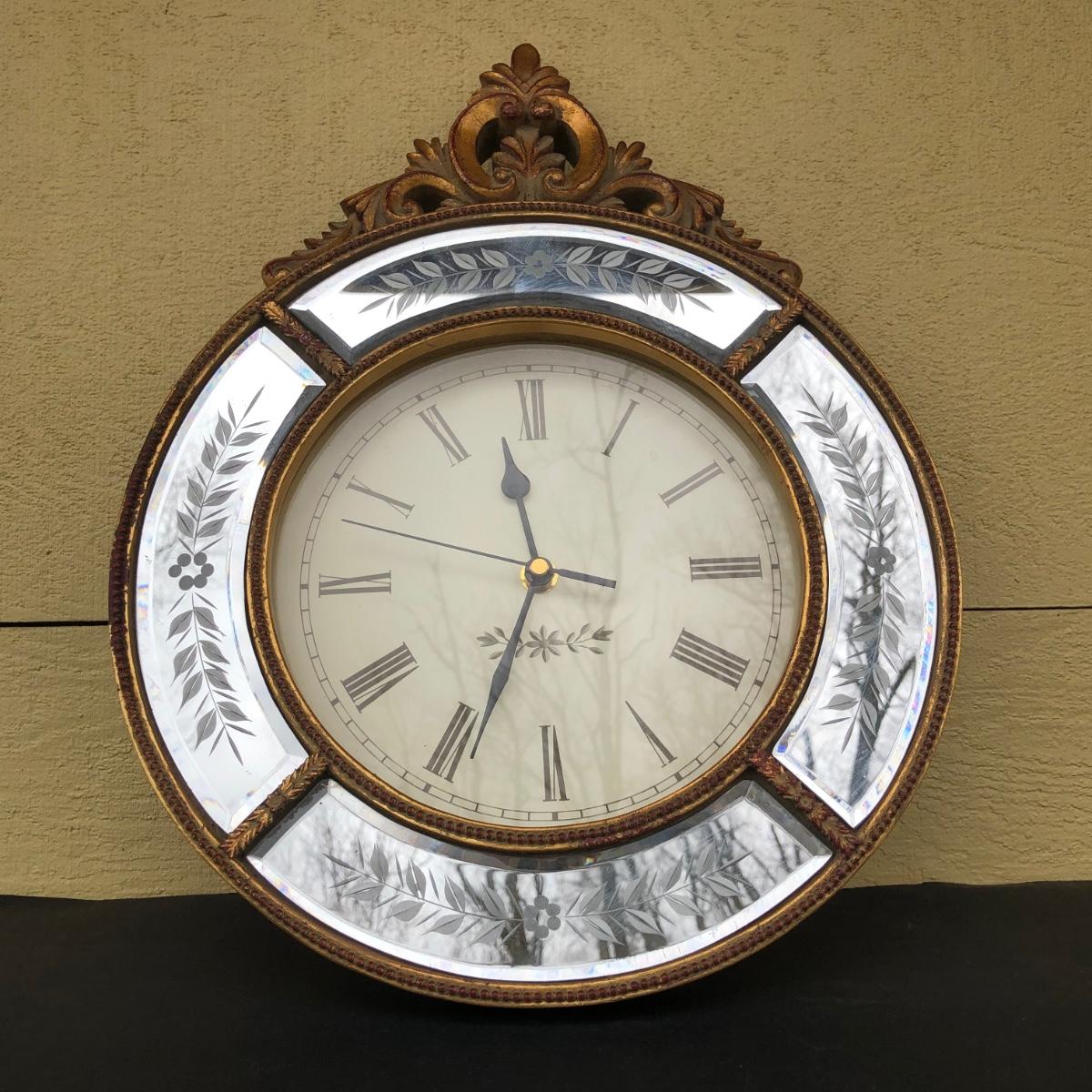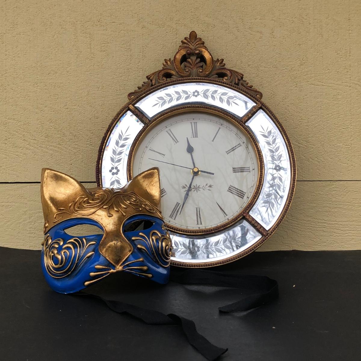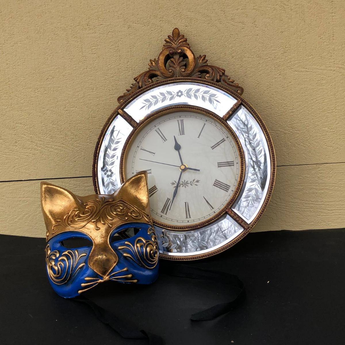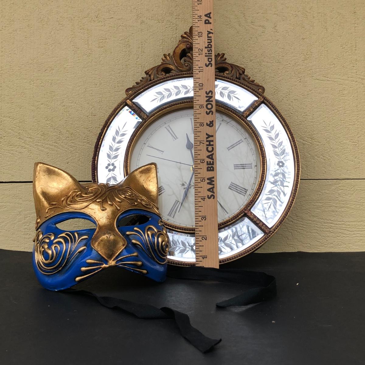 LOT 198G: Vintage Etched Mirror Wall Clock & Atelier Marega Gold & Blue Cat Mask