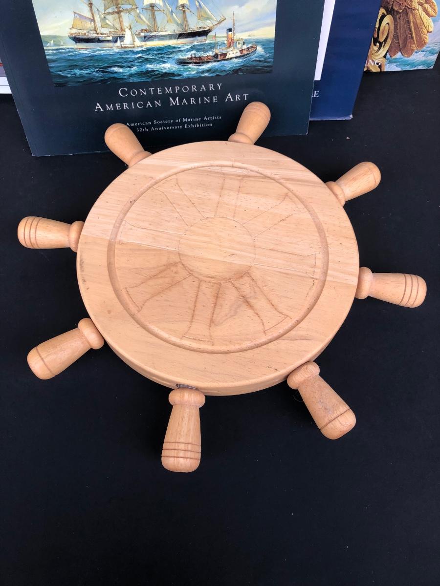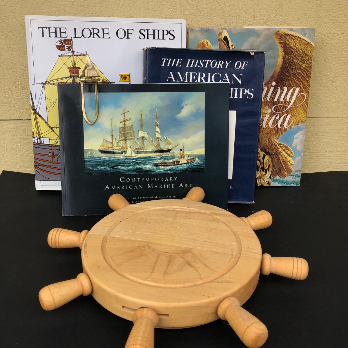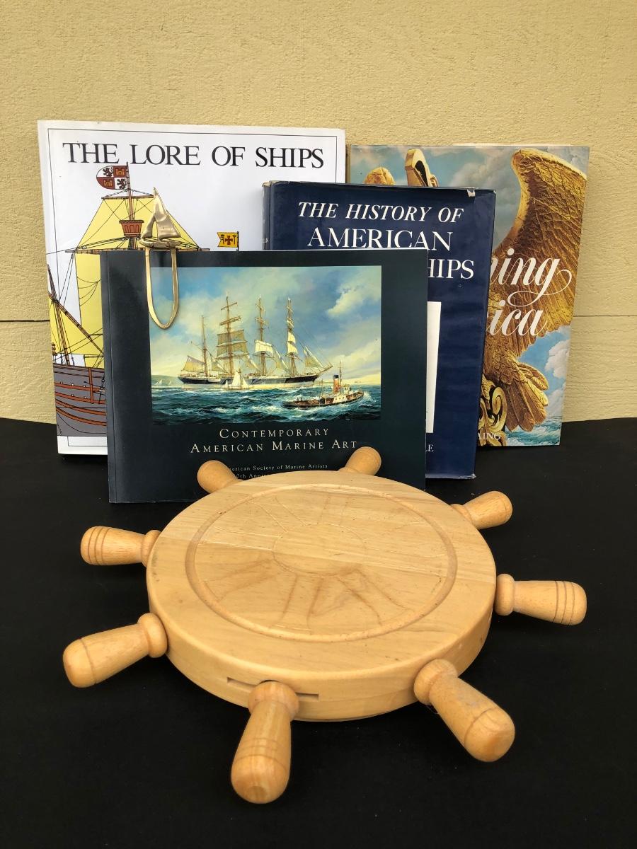 LOT 199G: Ships Wheel Lazy Susan Legacy by Picnic Time Cheese Board & Variety of Nautical History Books