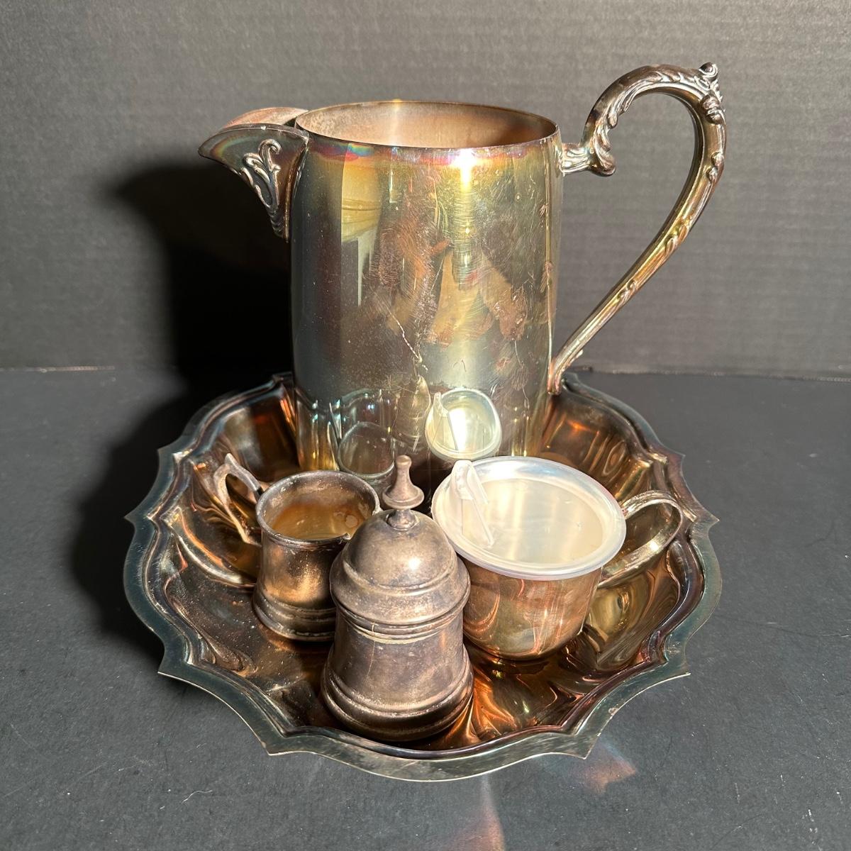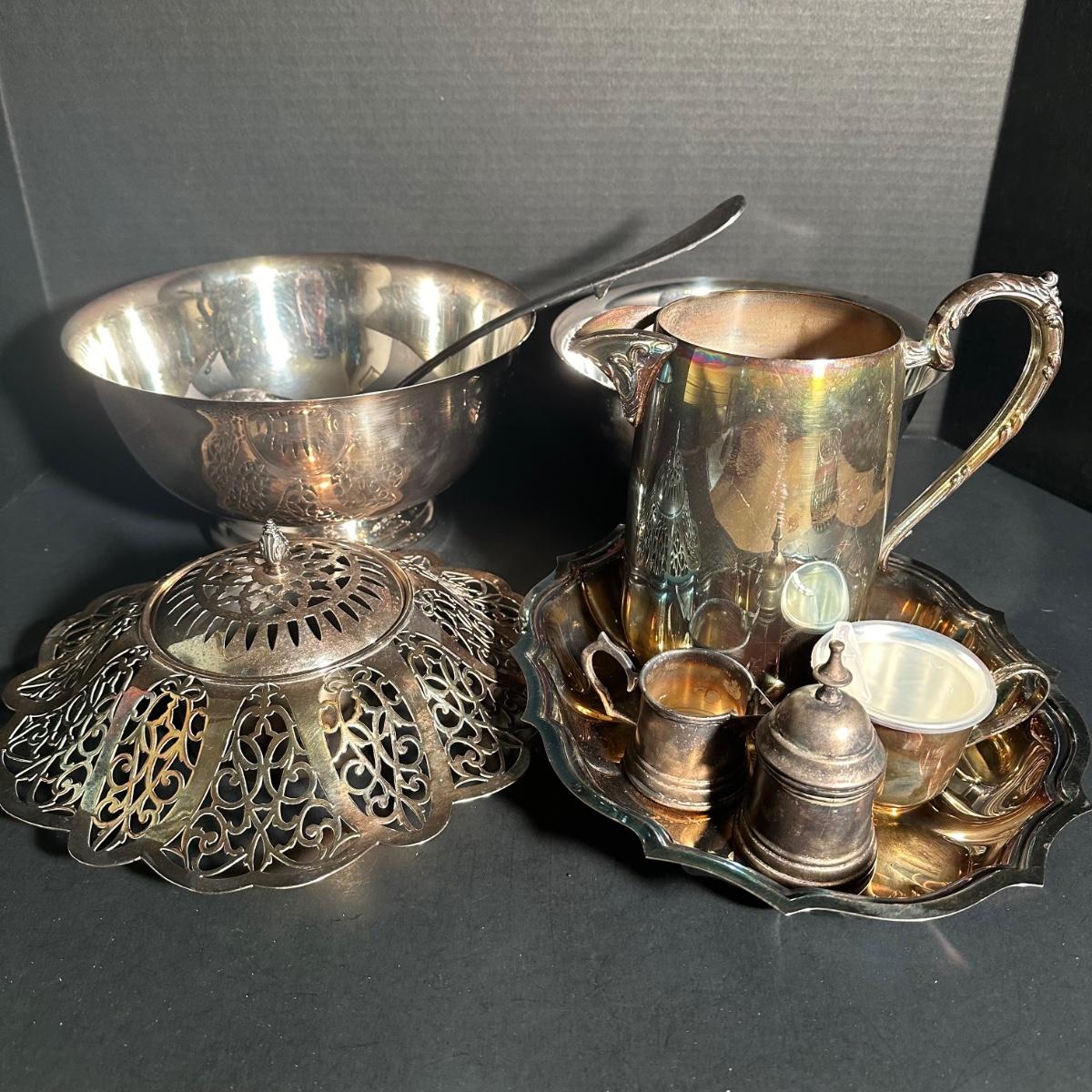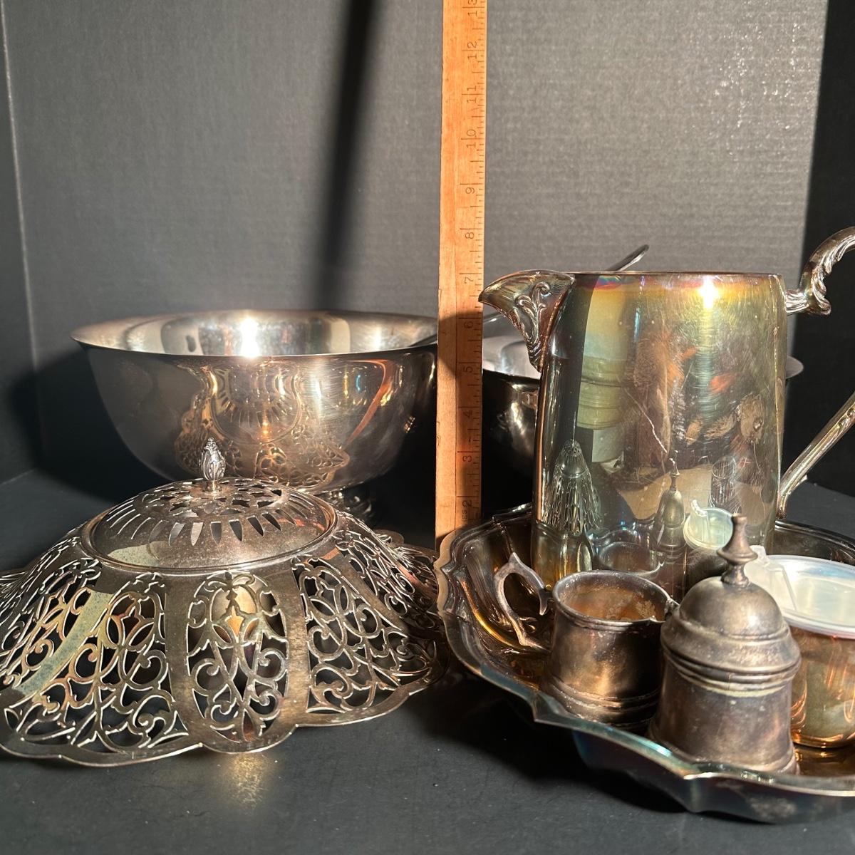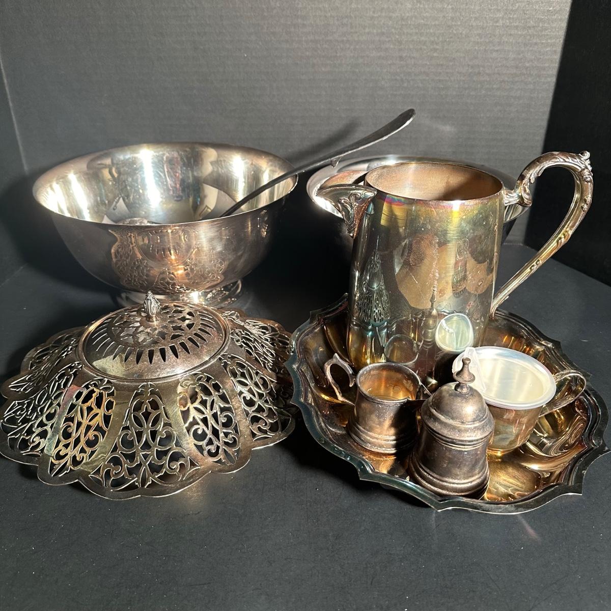LOT 202D: Silver Plated Pitcher, Serving Tray, Mixing Bowl, Candy Bowl & More
