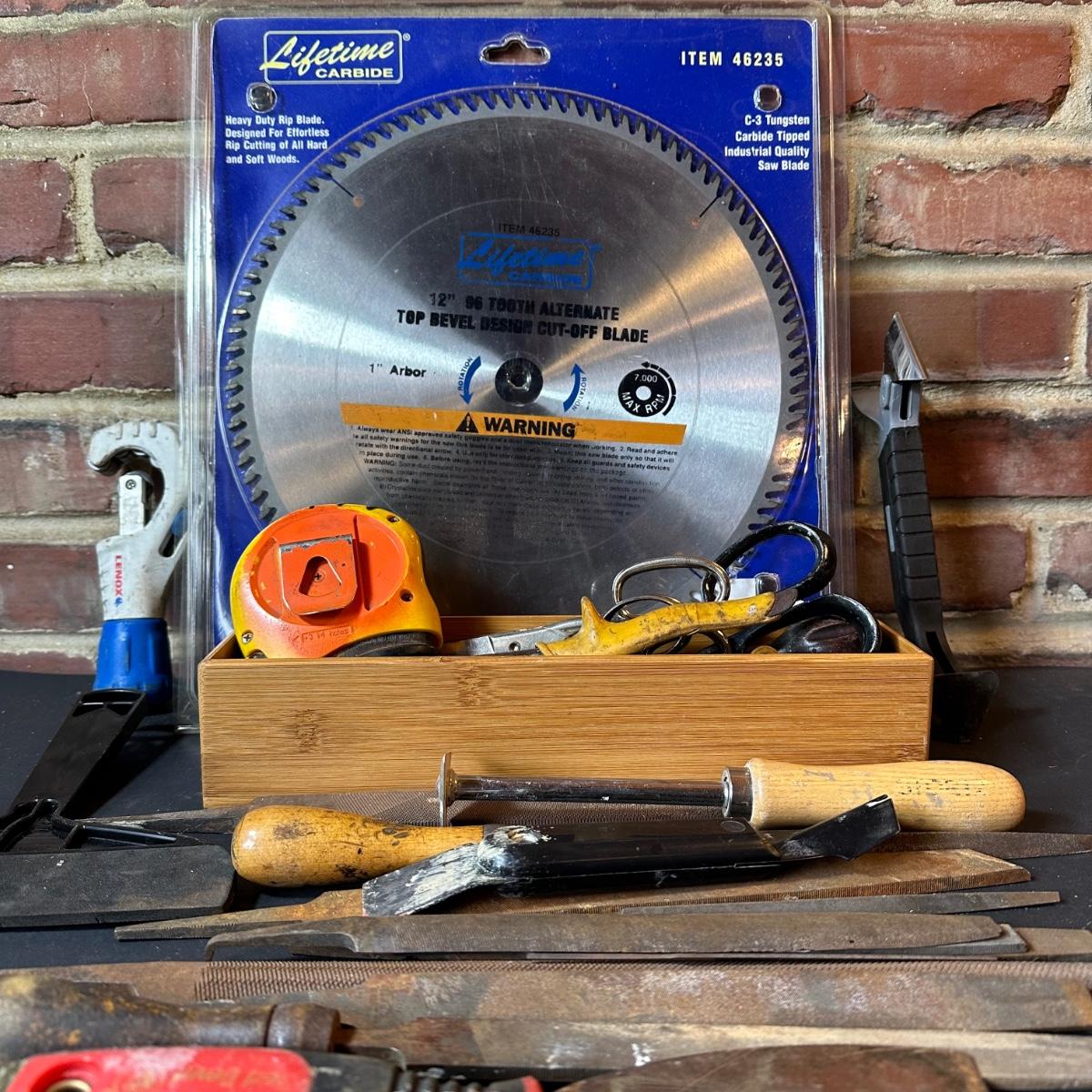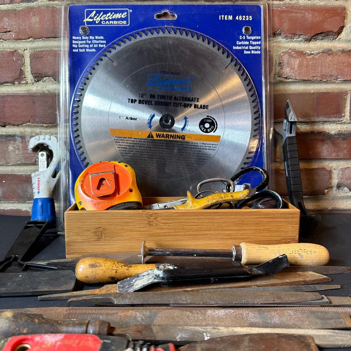LOT 230S: Assorted Tools - Tape Measure, Pipe Cutters, Saw Blade & More