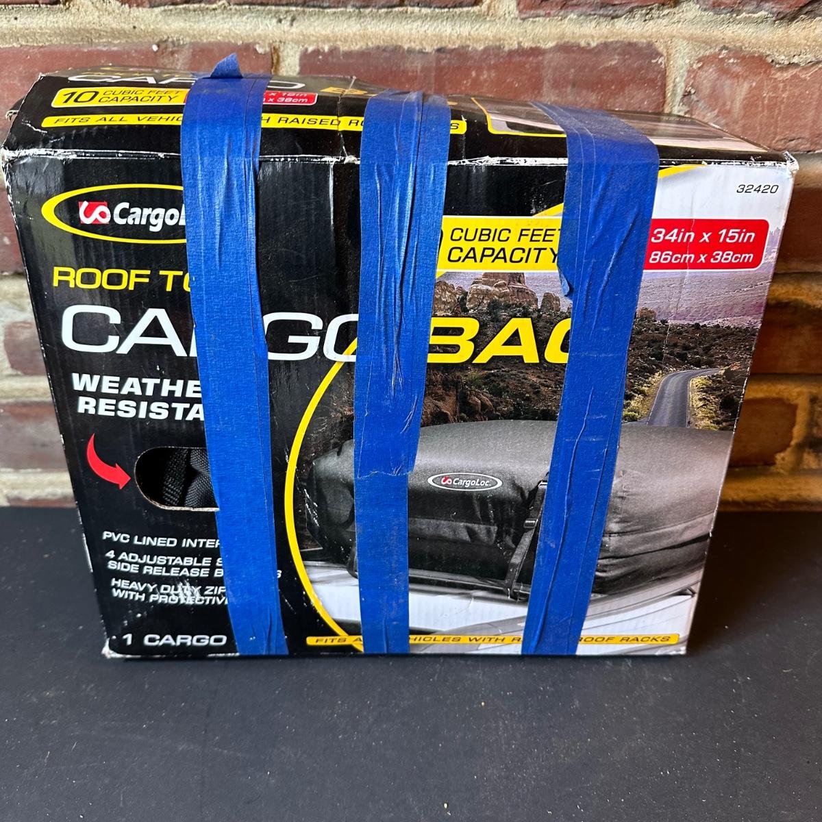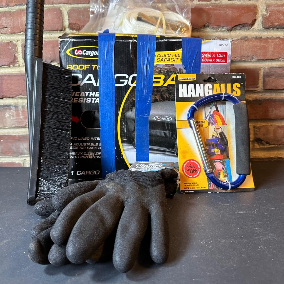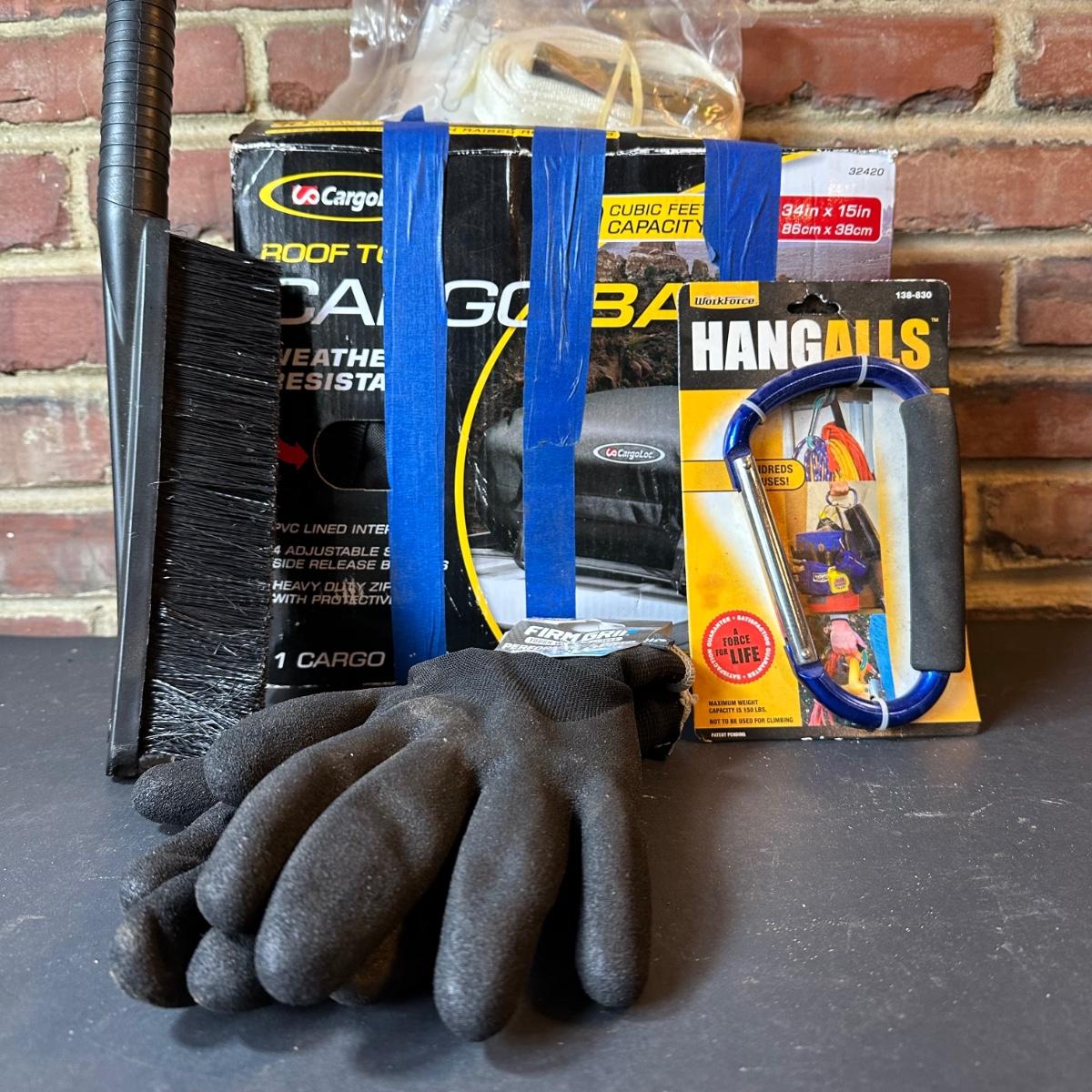 LOT 231S: Car Essentials- Rooftop Cargo Bag, Ratchet Strap, Ice Scrapper & More