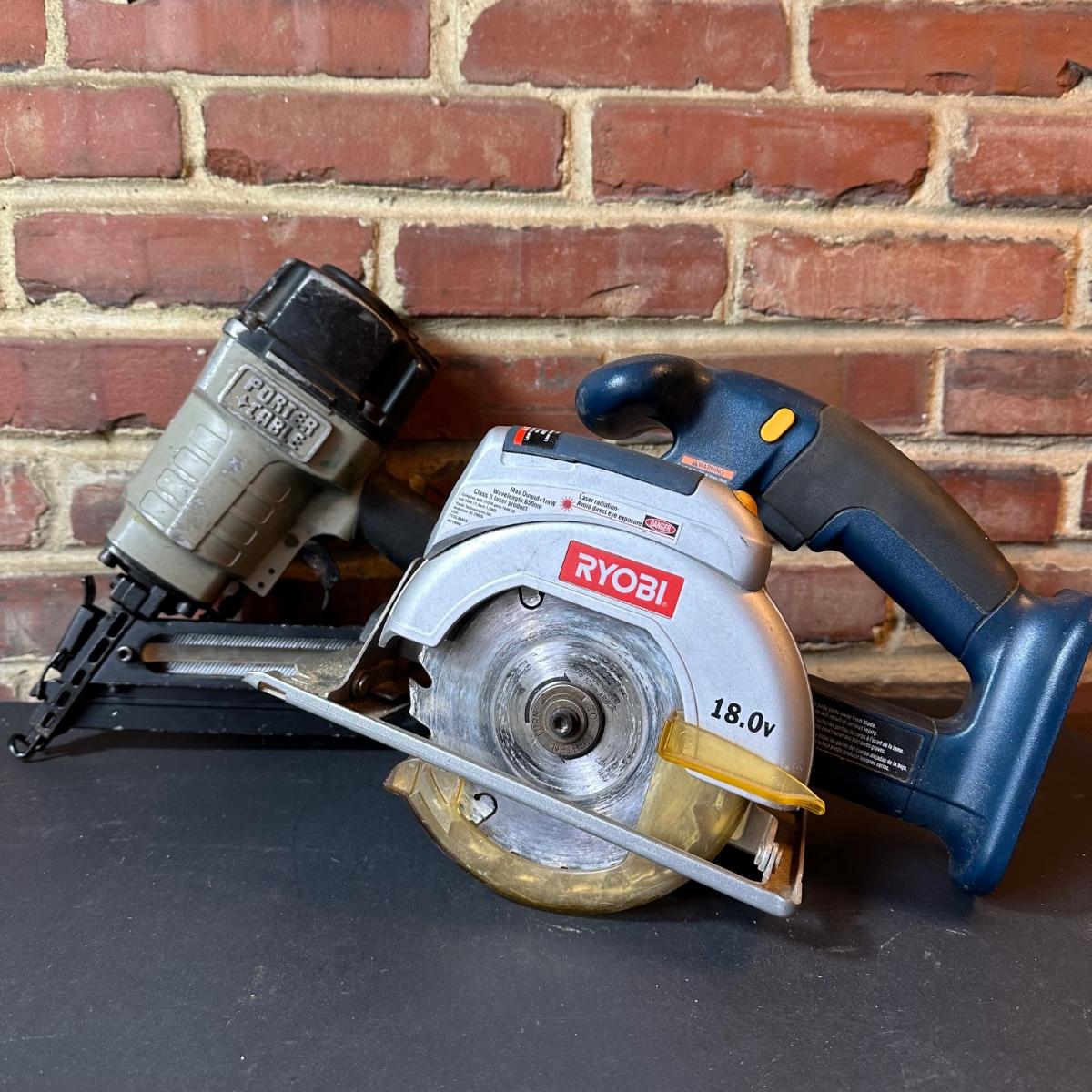 LOT 234S: Ryobi Laser Circular Saw P500 w/ Porter Cable Finish Nailer
