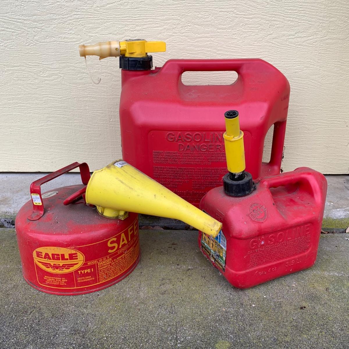 LOT 253 G: Eagle & Blitz 1 Gallon Gas Cans & No Spill 5 Gallon Gas Can