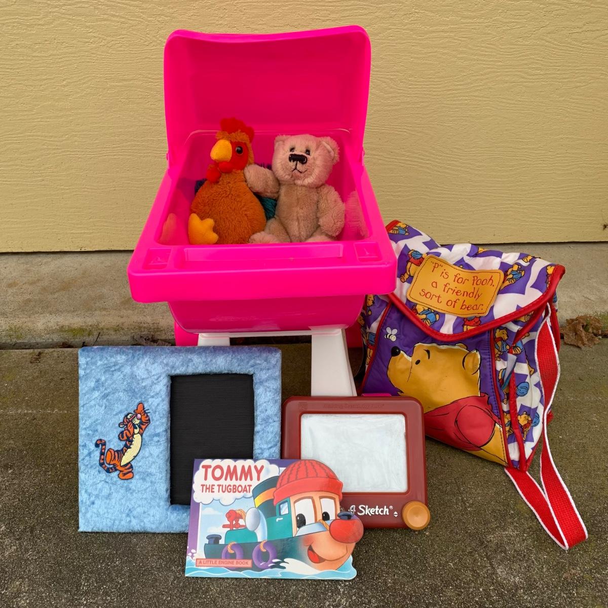 LOT 258 G: Come Play Baby Stroller, Winnie The Pooh Mini Tote, Tigger Plush Picture Frame, Travel Etch A Sketch & More