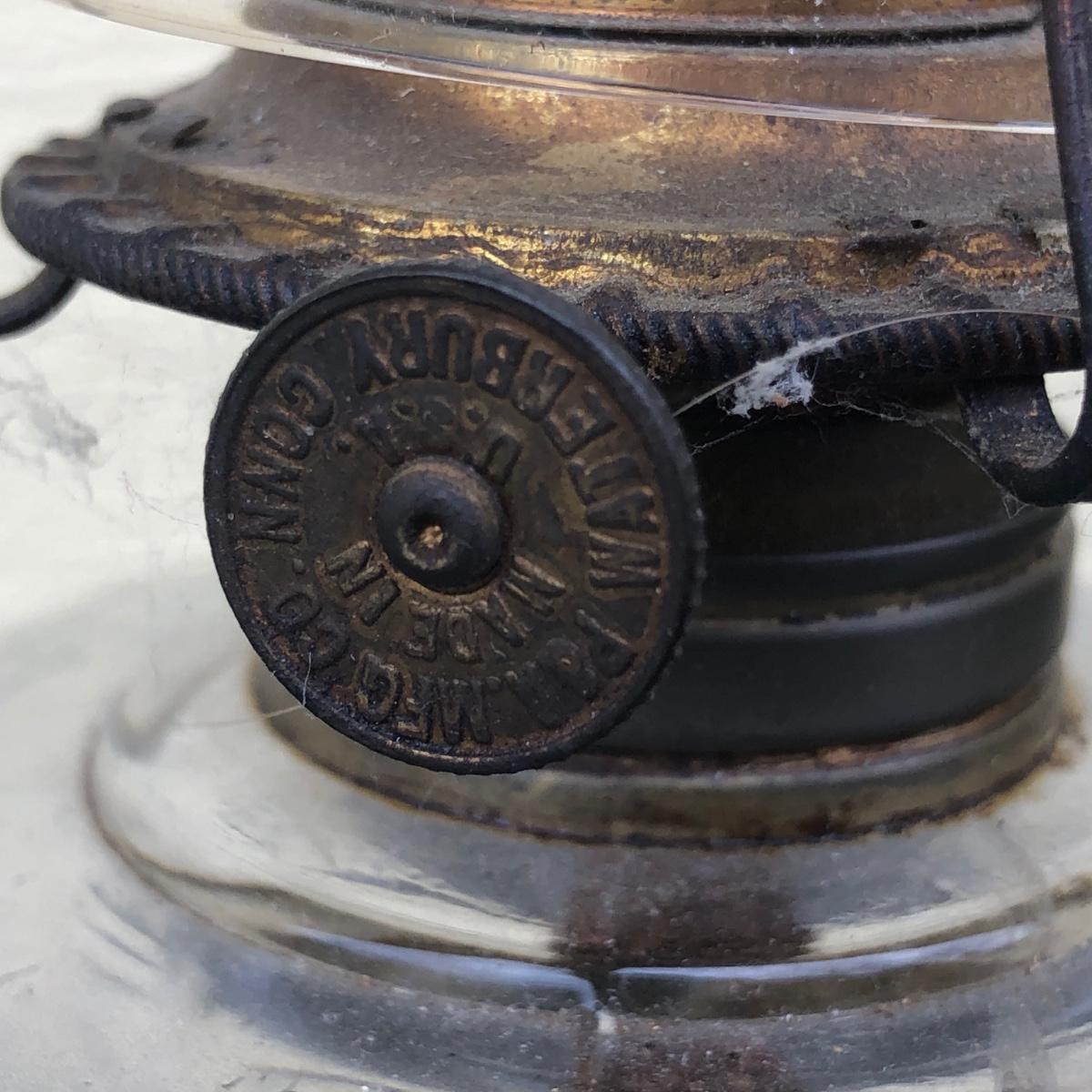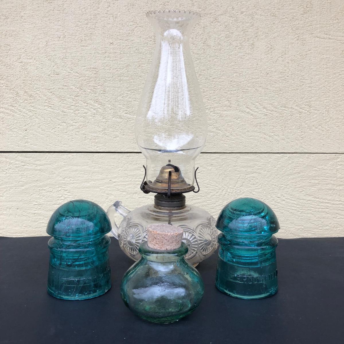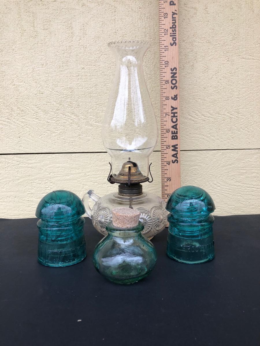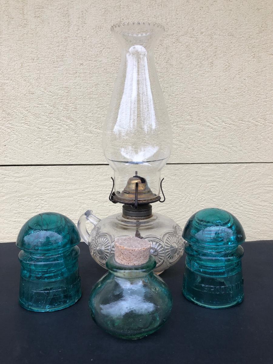LOT 301G: Vintage Glass Collection - P&R Mfg Co Waterbury, CT Oil Lamp, Hand Blown Corked Jar & Brookfield Insulators
