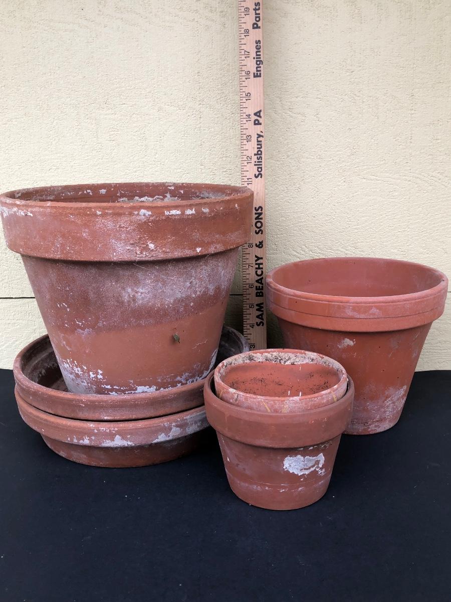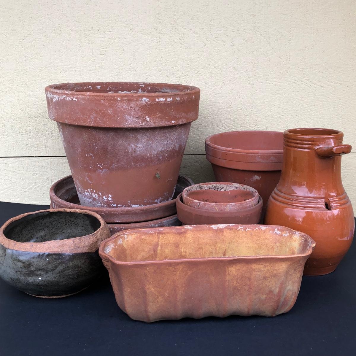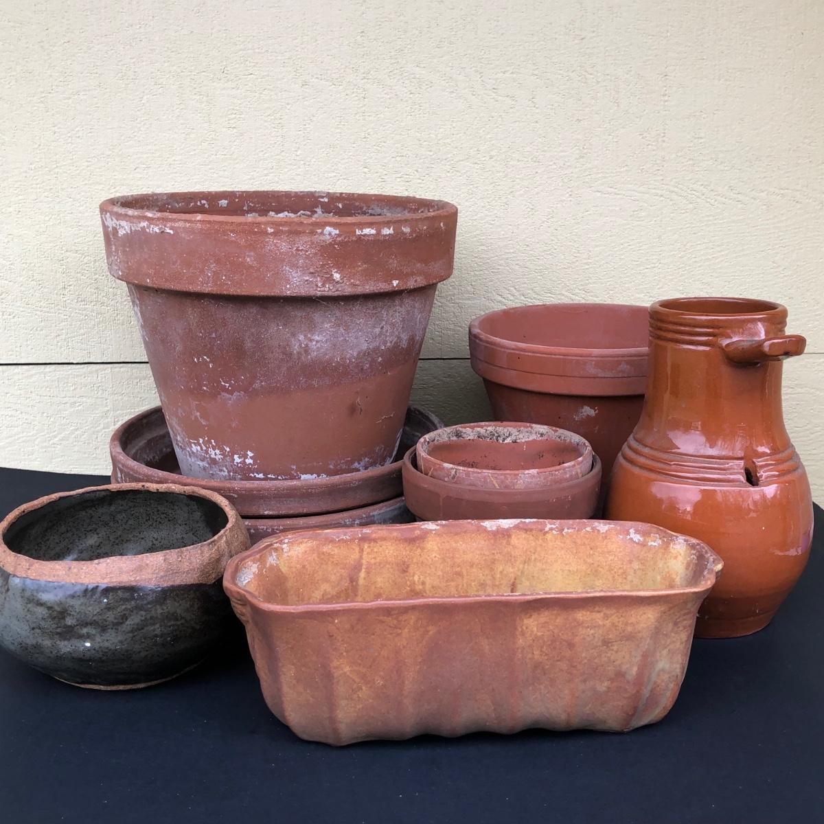 LOT 309G: Terra Cotta Pots, Stoneware Pottery Planters & Colonial Williamsburg Restoration Redware Pottery Bird Bottle House