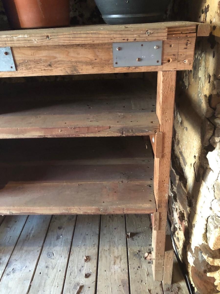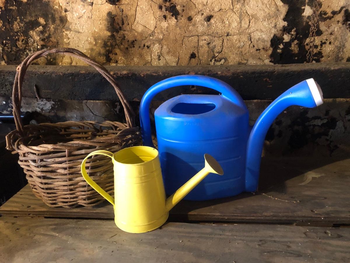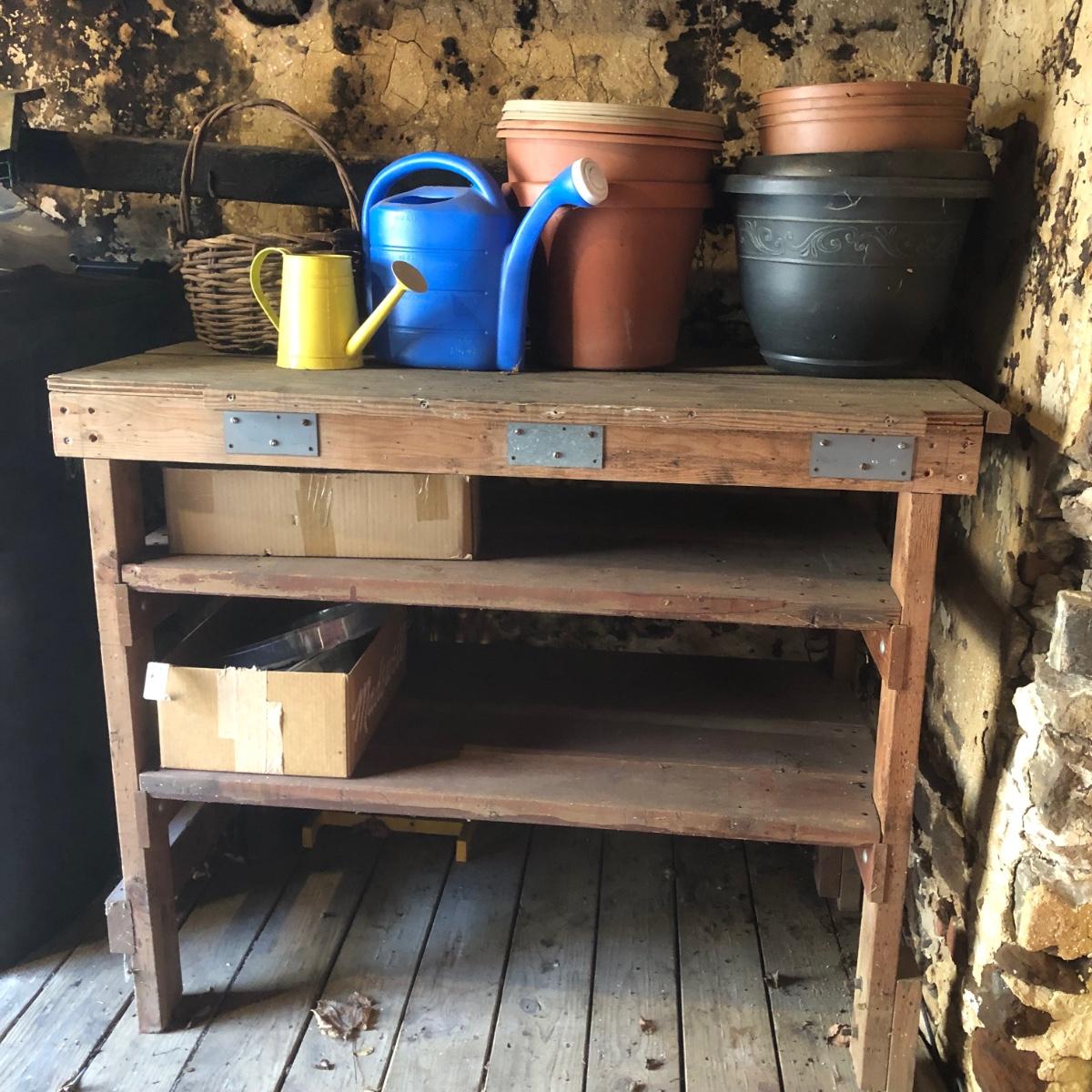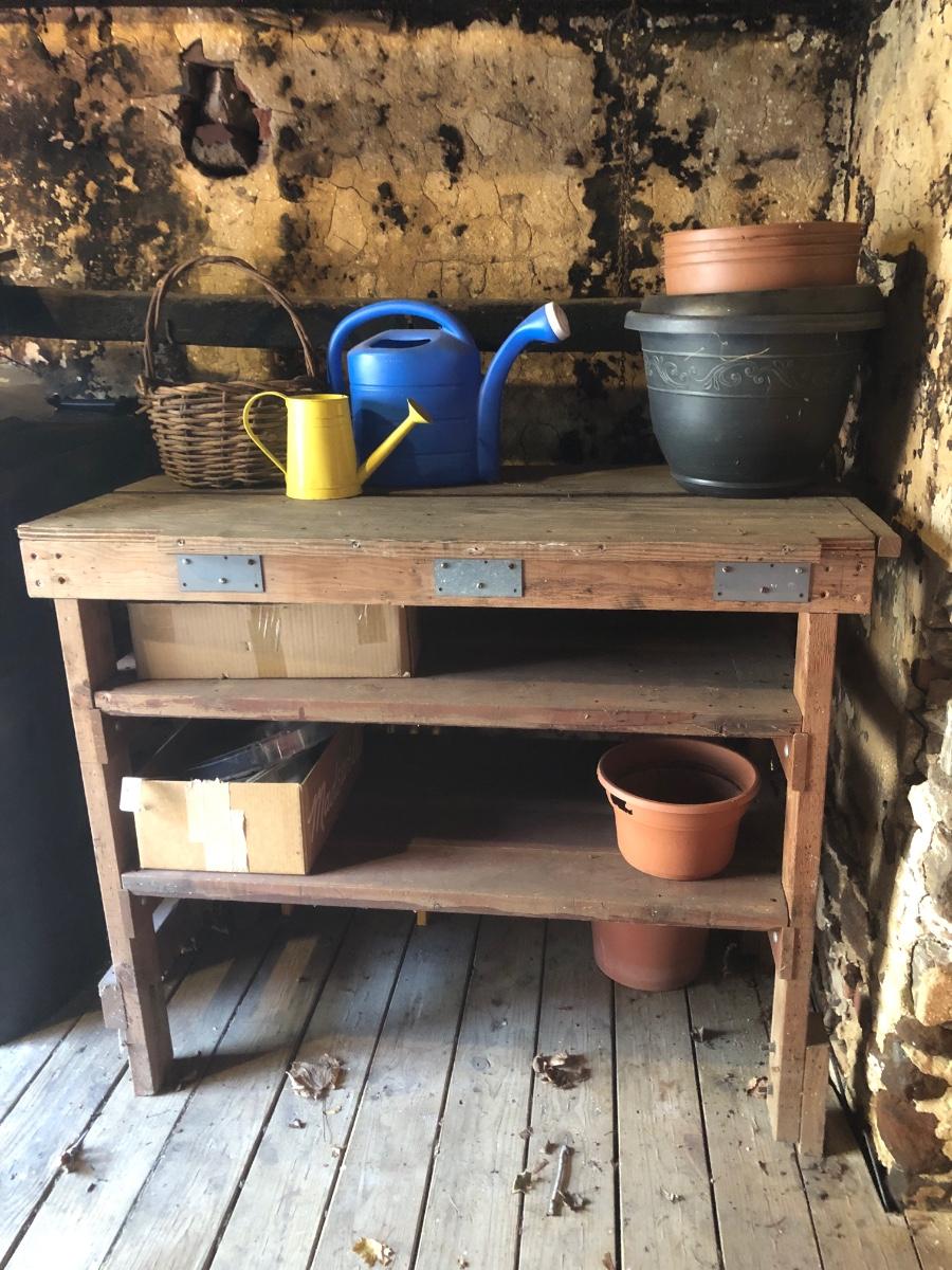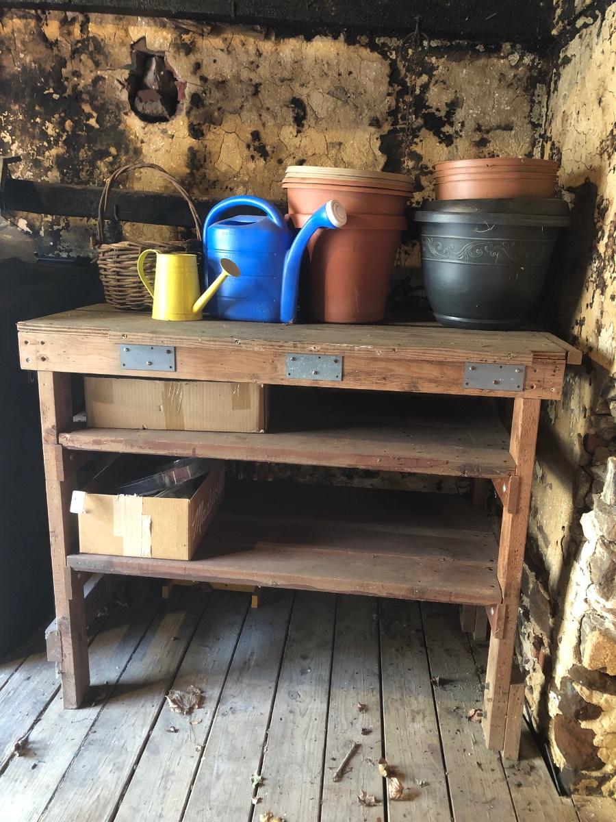 LOT 318S: Wooden Garden Bench w/ Planter Pots, Watering Cans & More