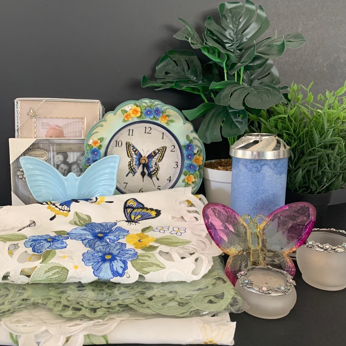 LOT 190: Butterfly Home Decor Collection: Embroider Table Runners, Faux Plants, Picture Frames (NIP) & More