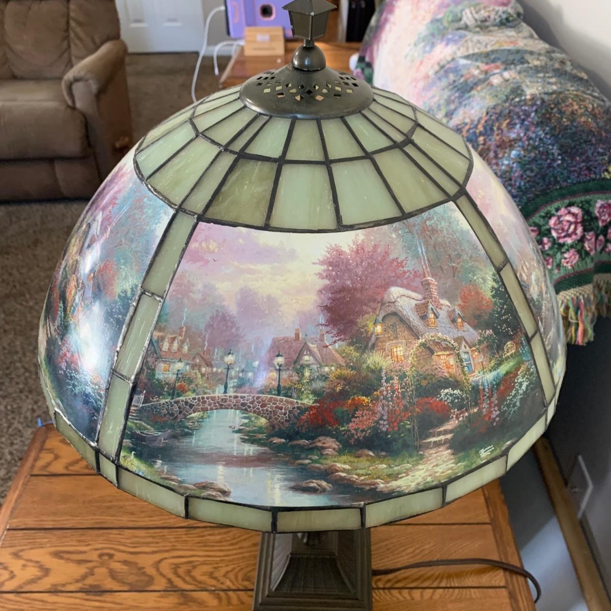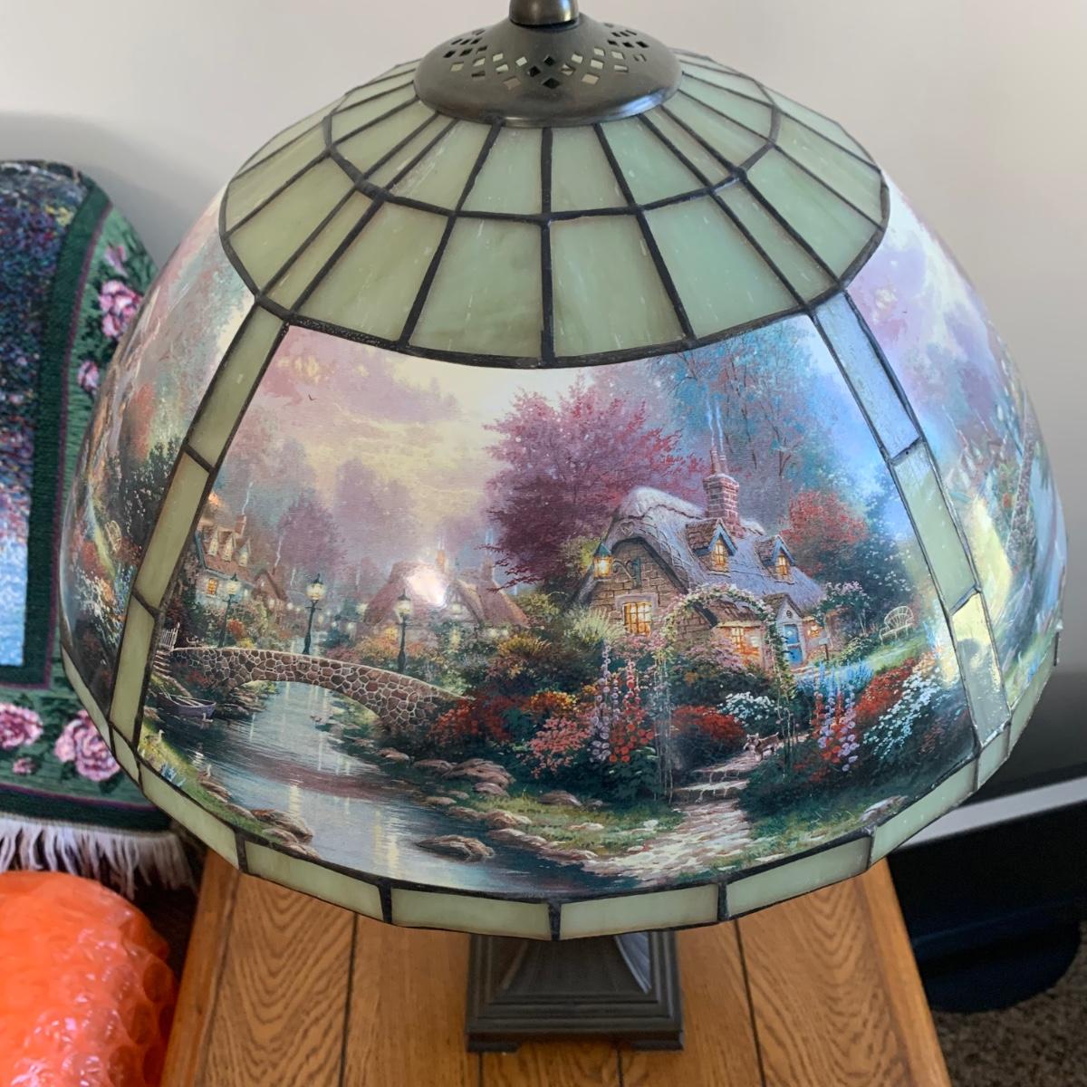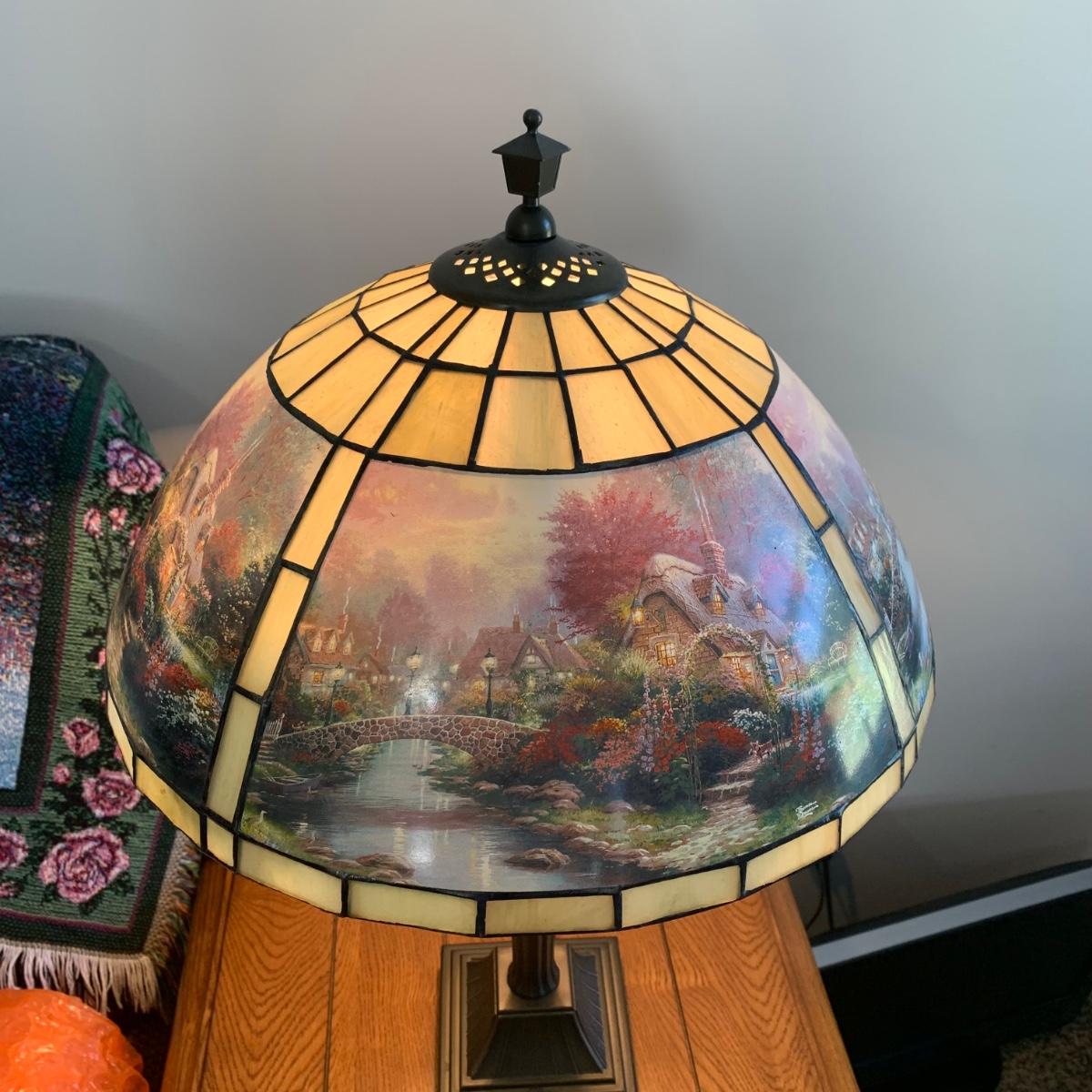 LOT 196: Thomas Kinkade Lamplight Bridge-Stained Glass Table Lamp