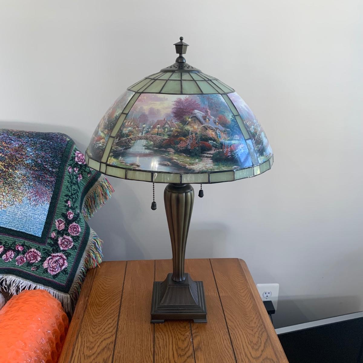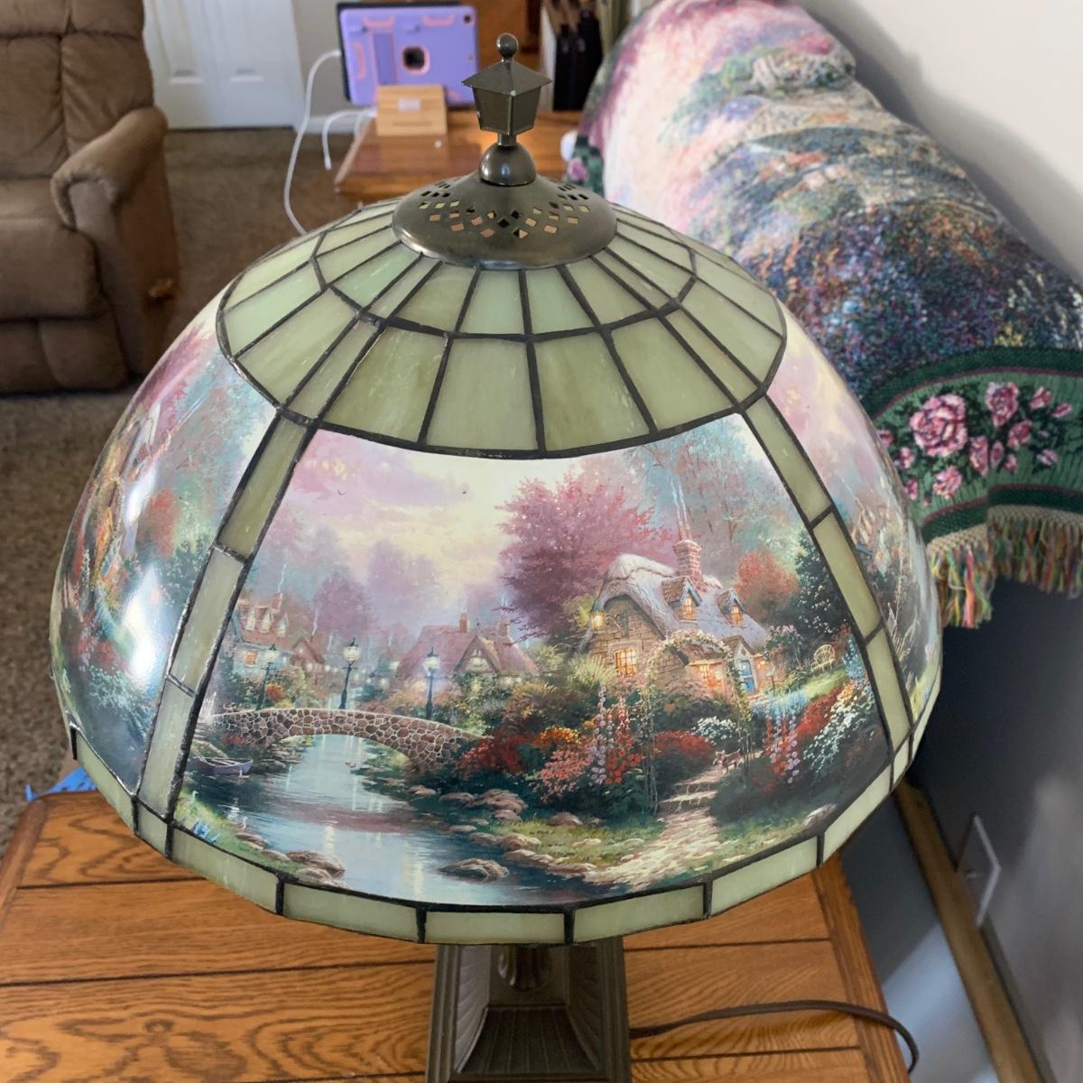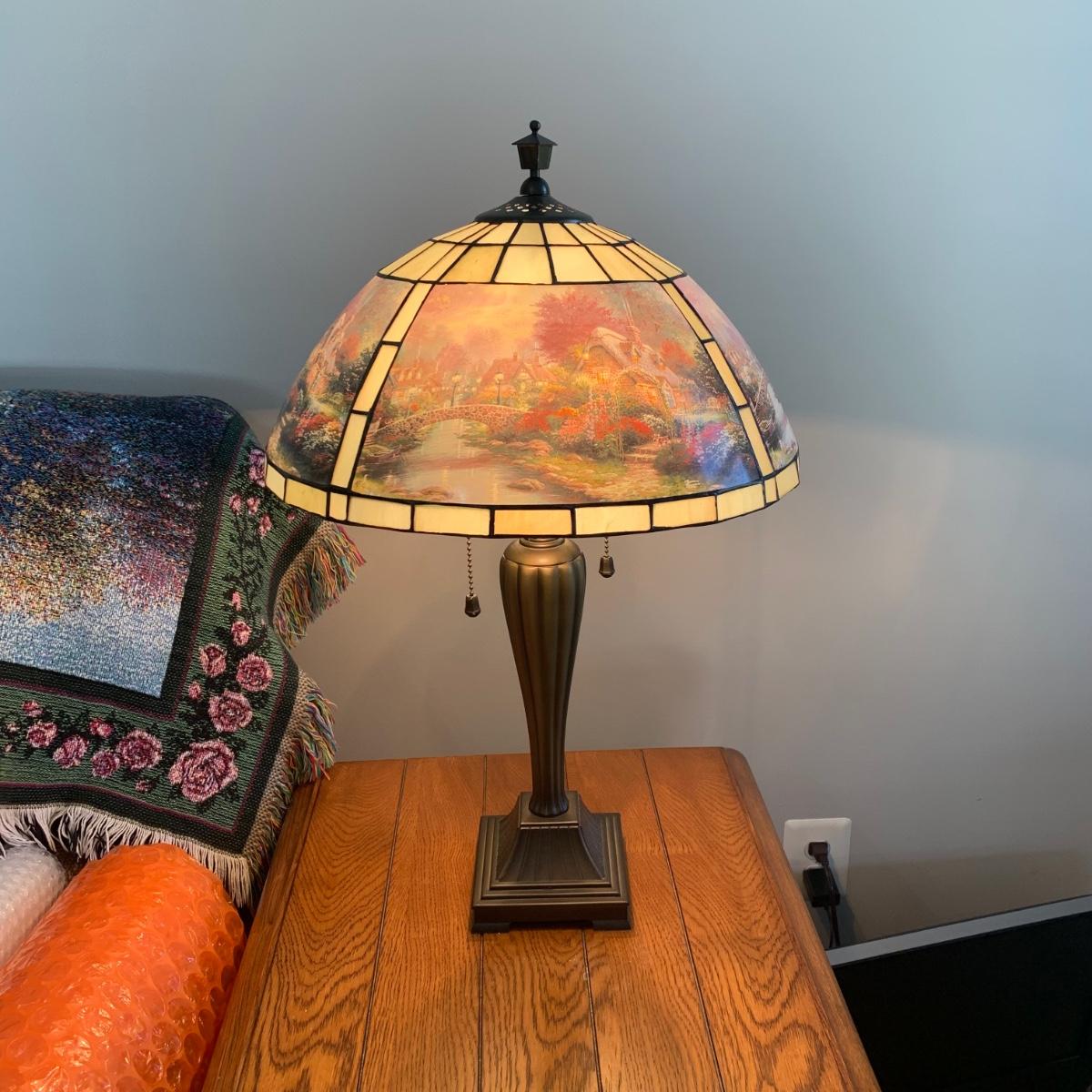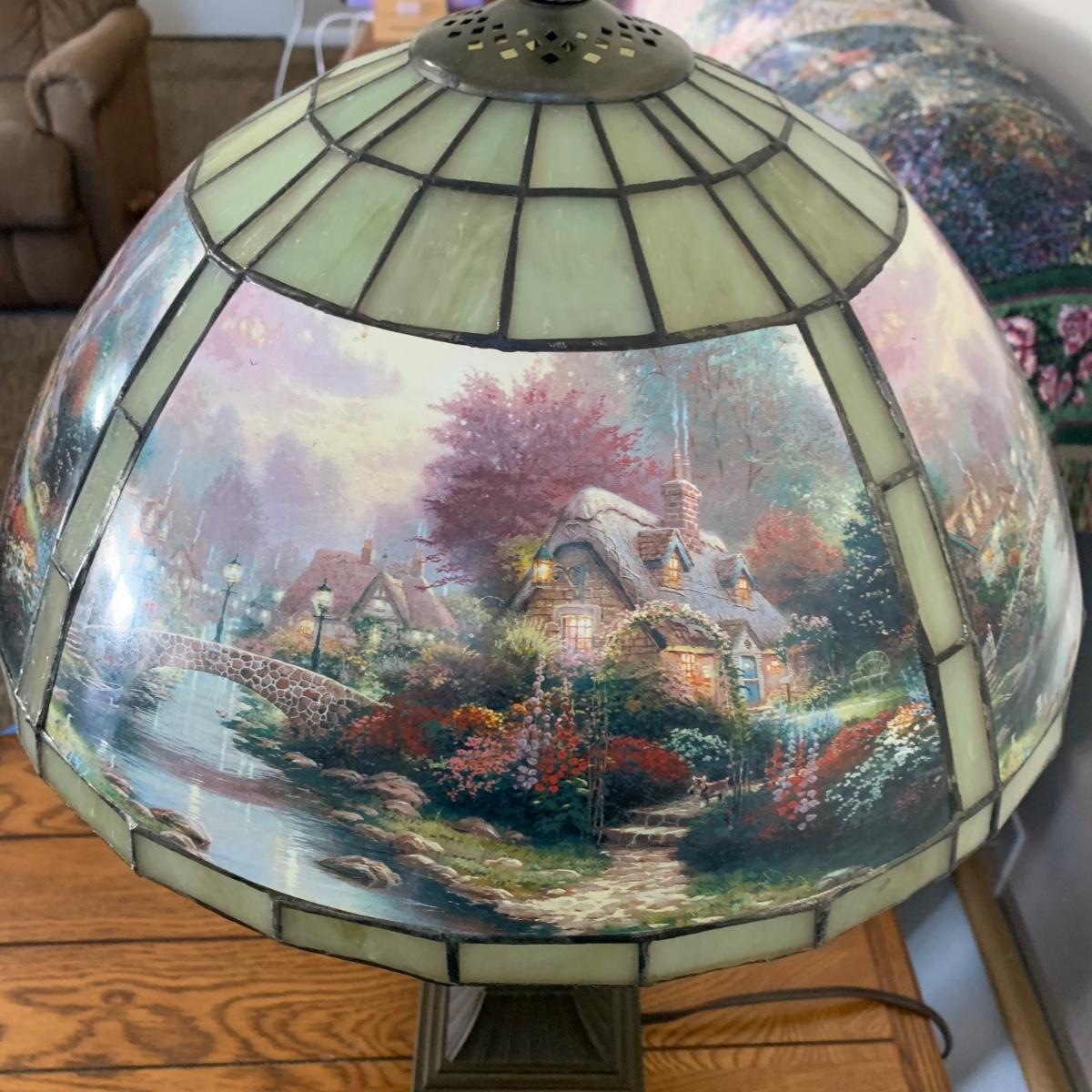 LOT 196: Thomas Kinkade Lamplight Bridge-Stained Glass Table Lamp