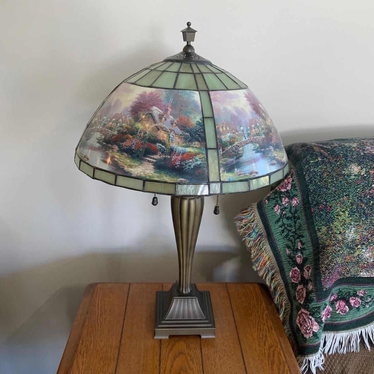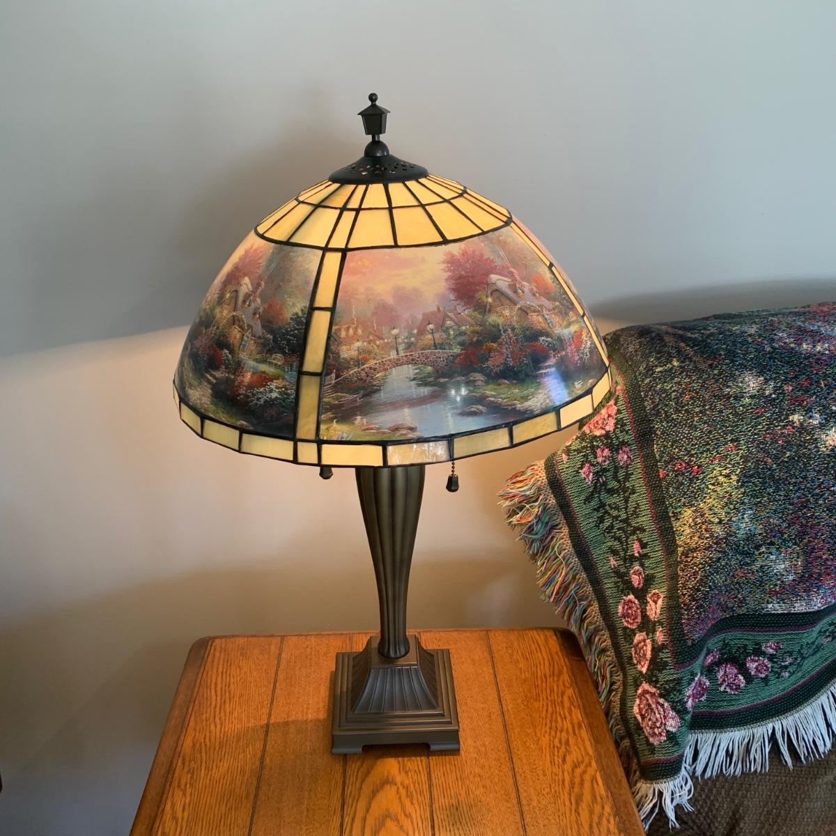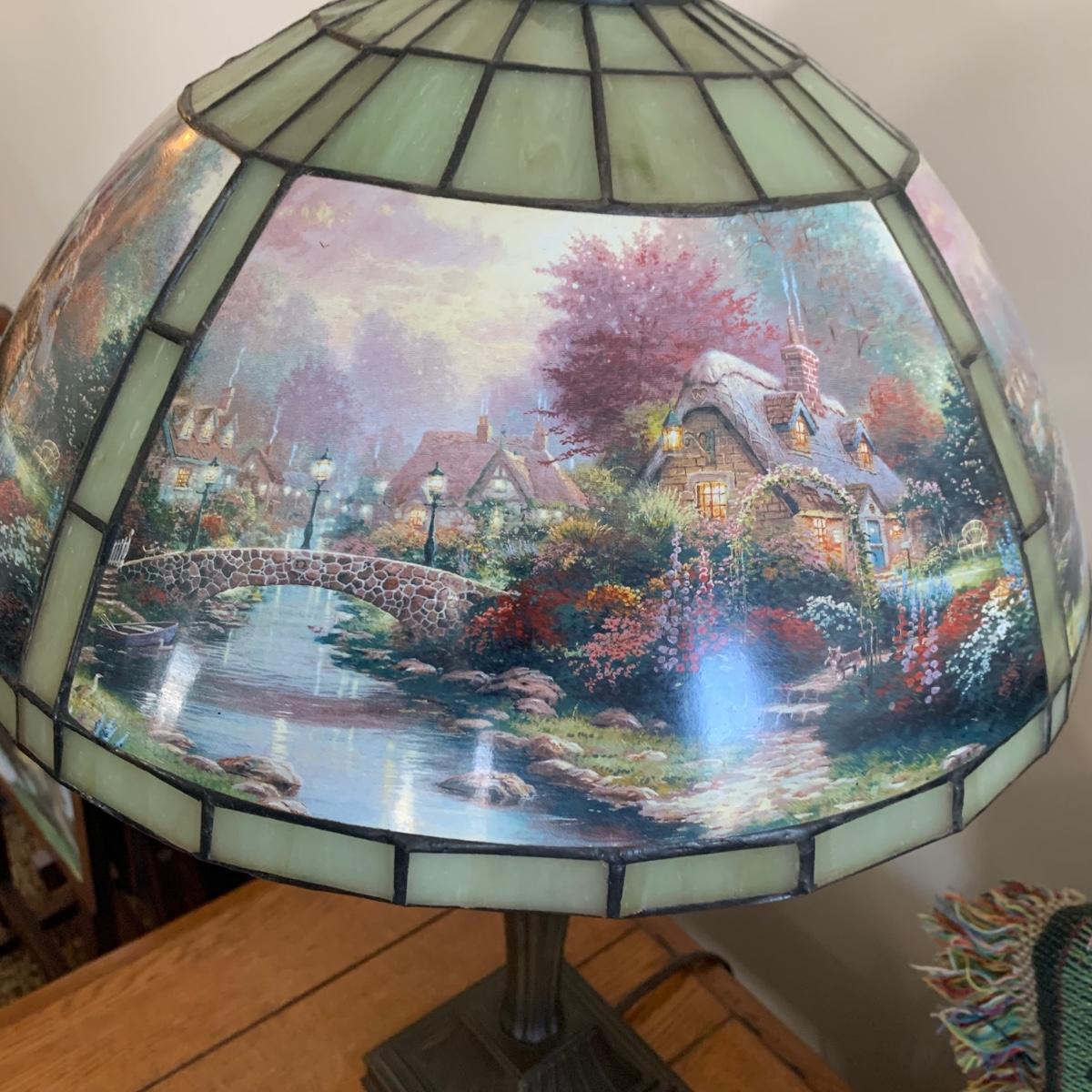 LOT 197: Thomas Kinkade Lamplight Bridge-Stained Glass Table Lamp