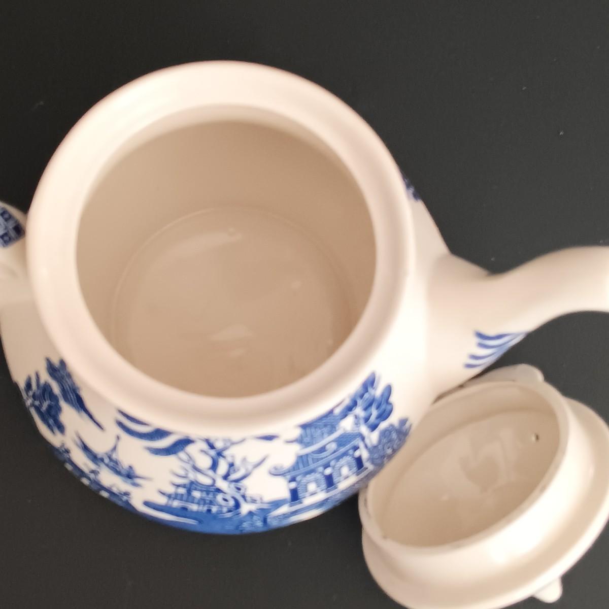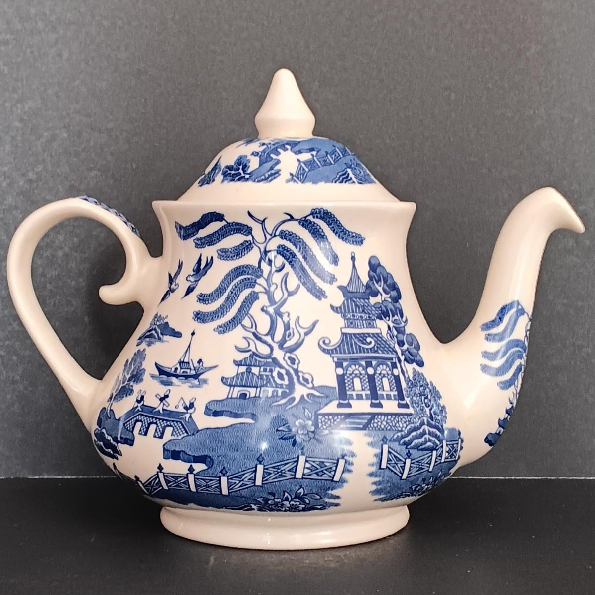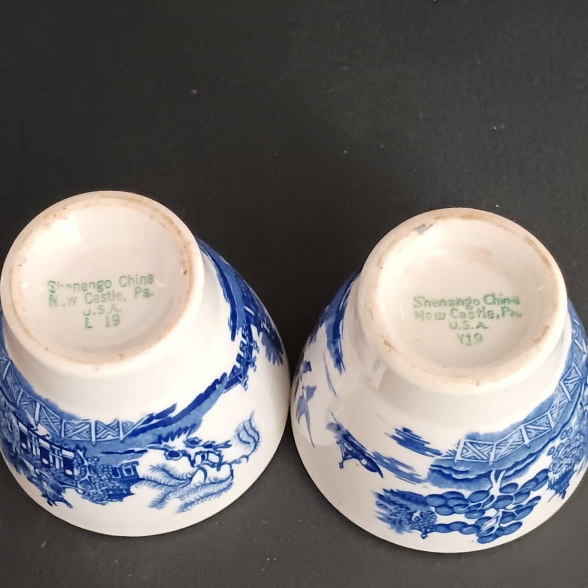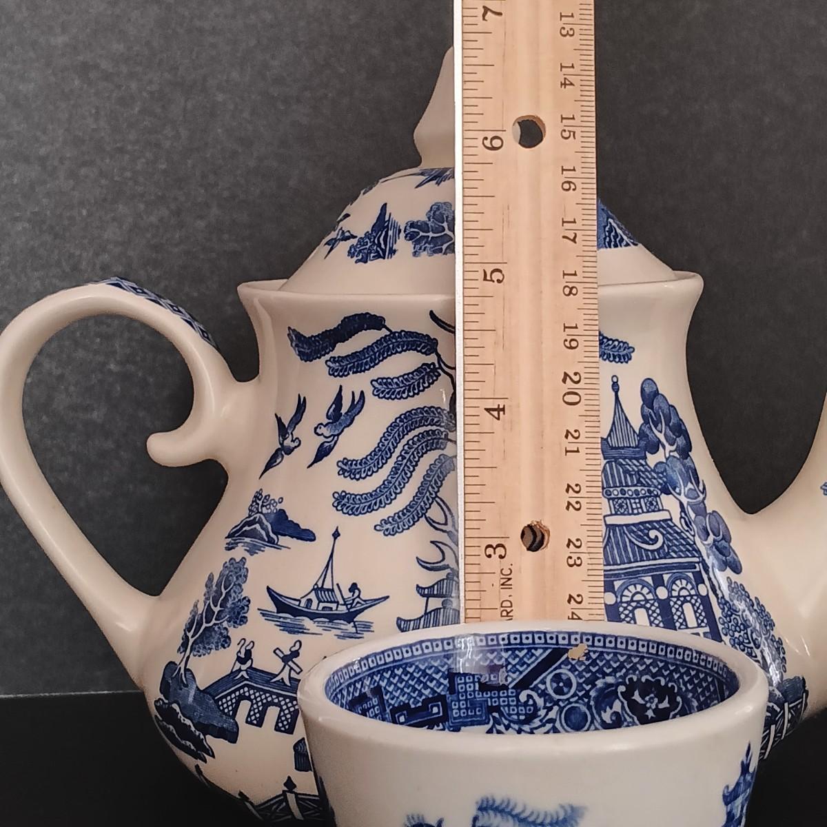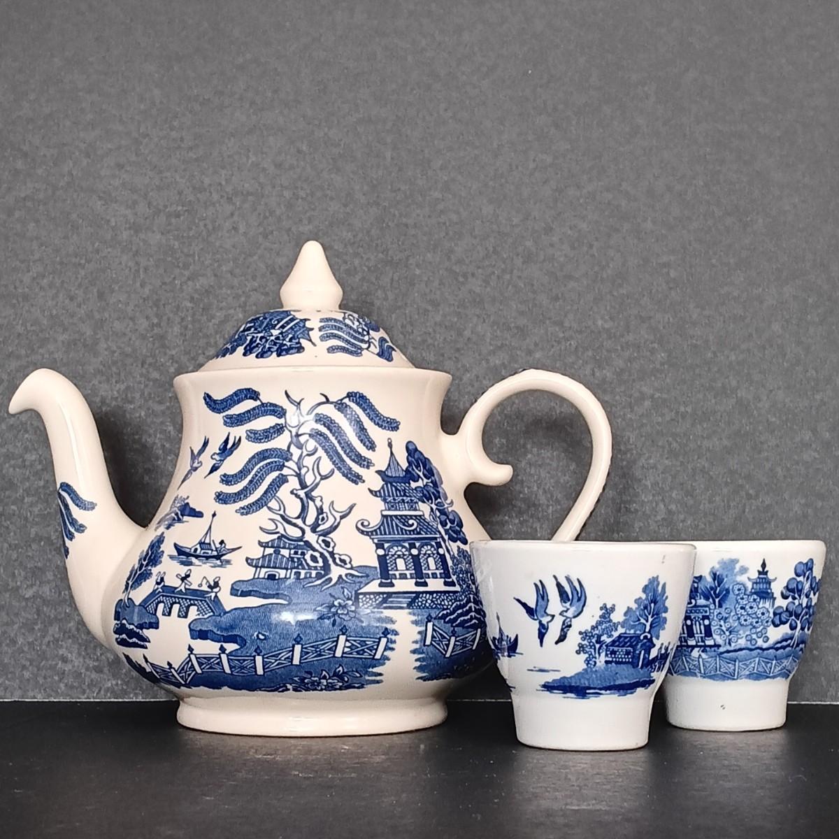 LOT 8: Vintage Blue Willow Pattern Tea Pot w/ Pair of Shenango China Cups