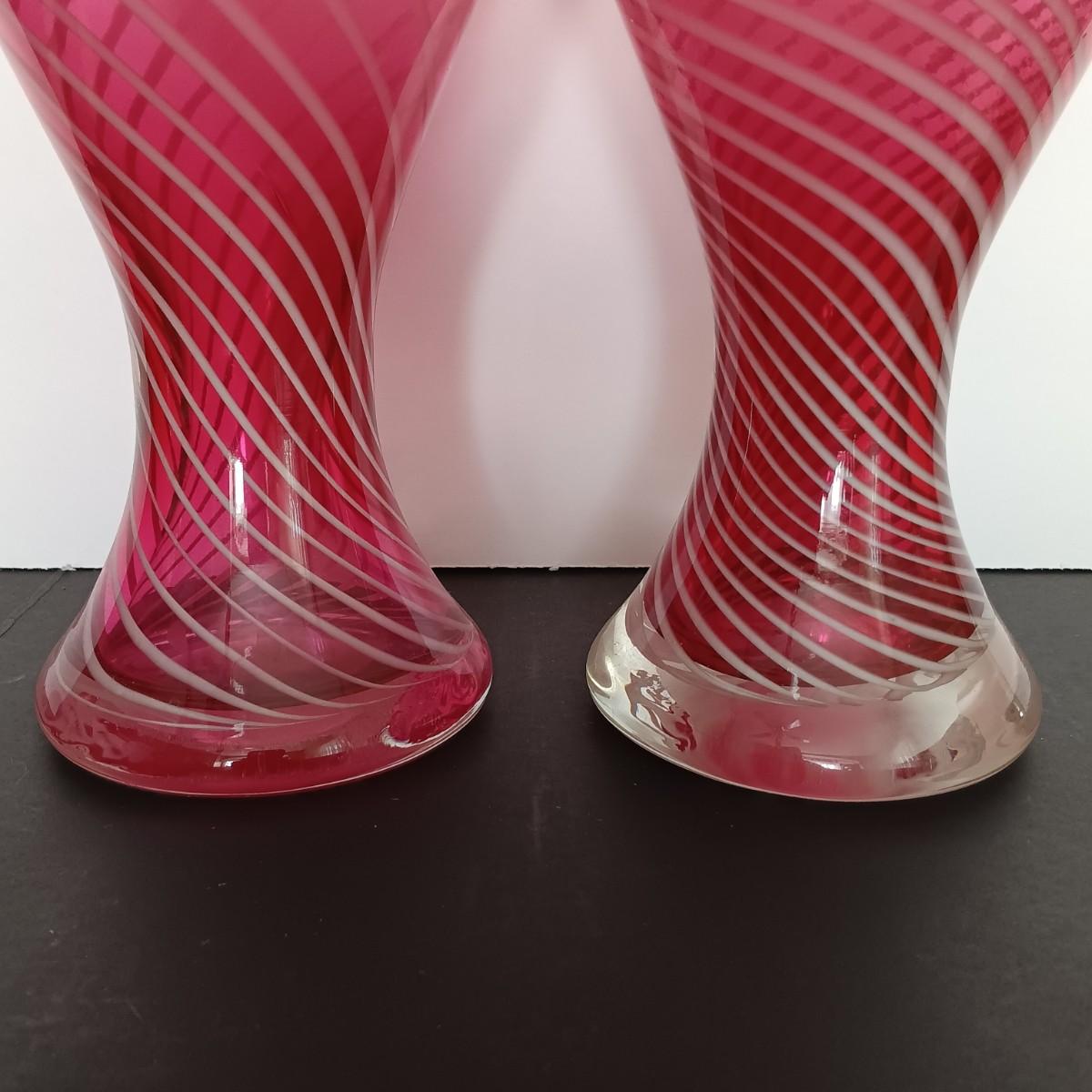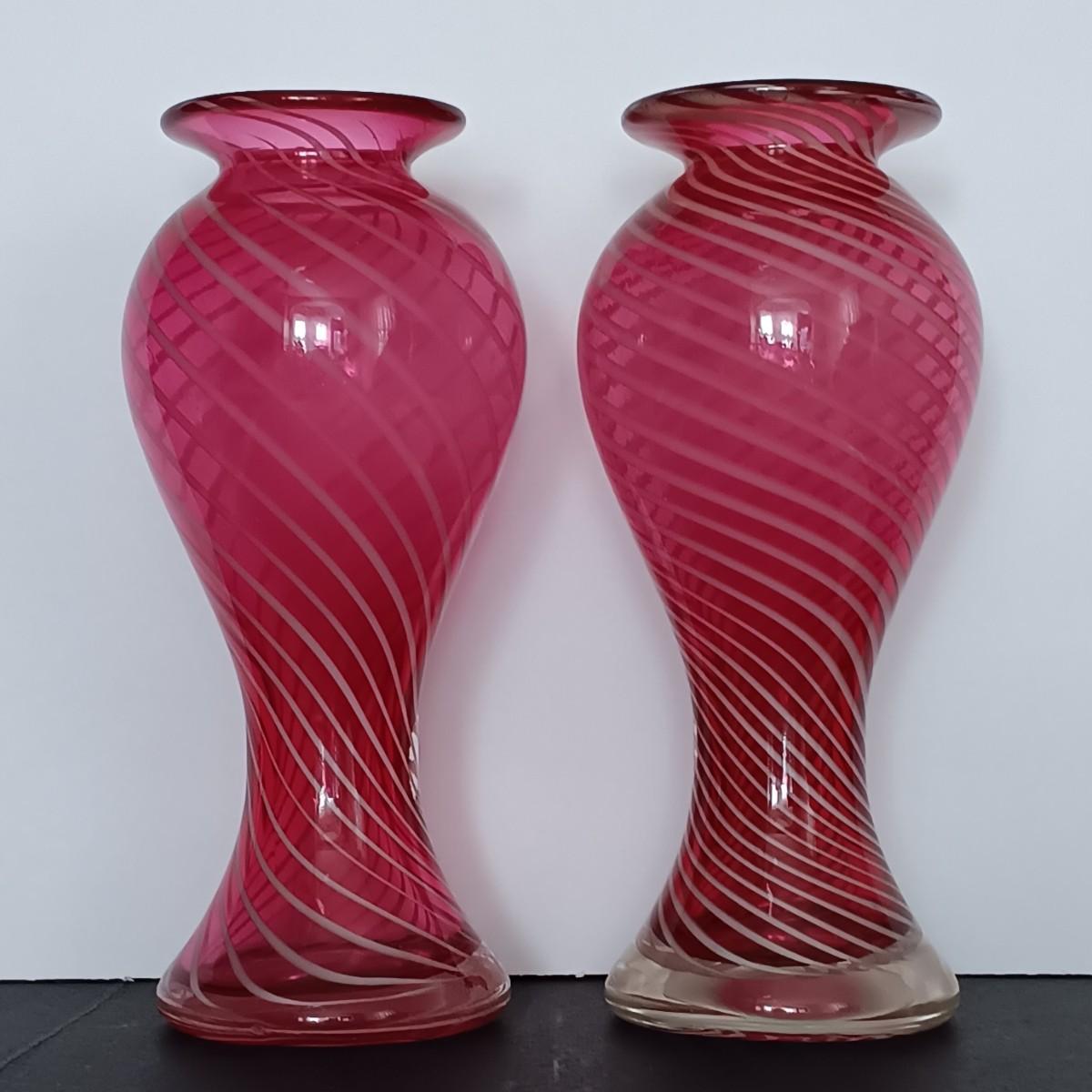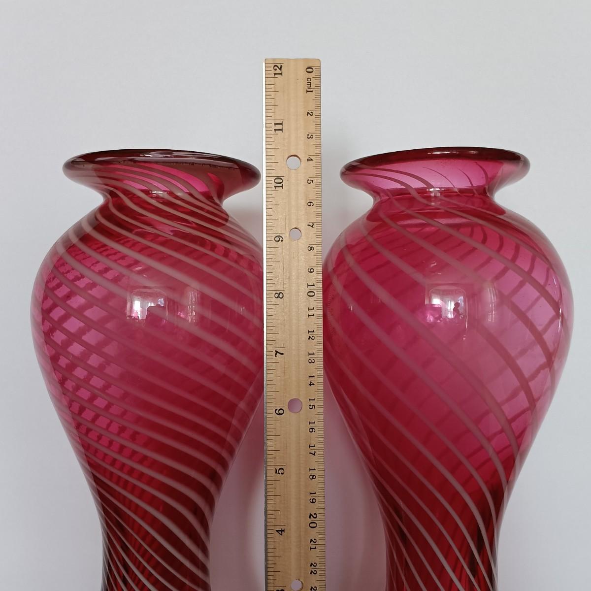 LOT 11: Pair of Cranberry Glass Vases with White Swirl Pattern