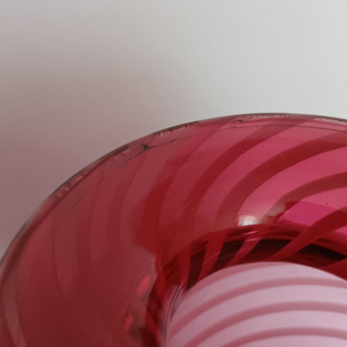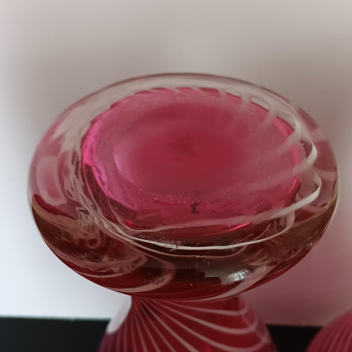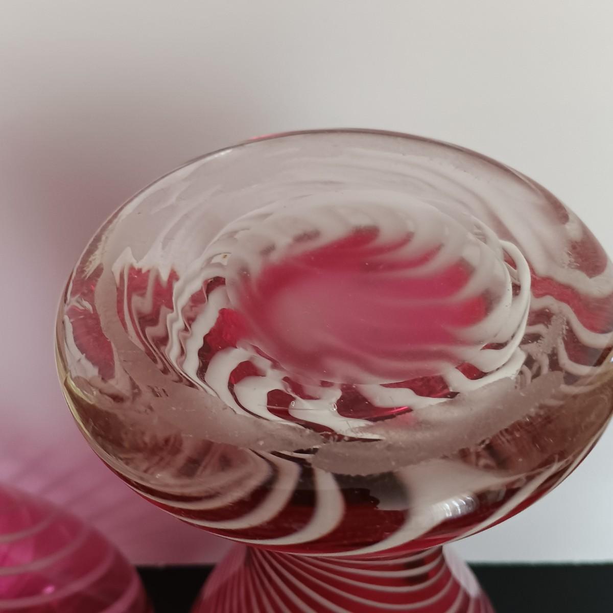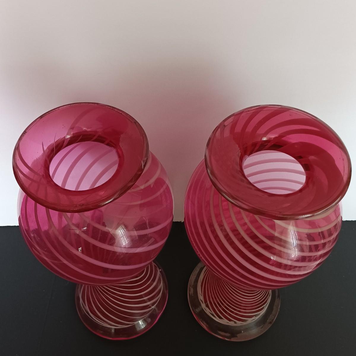 LOT 11: Pair of Cranberry Glass Vases with White Swirl Pattern
