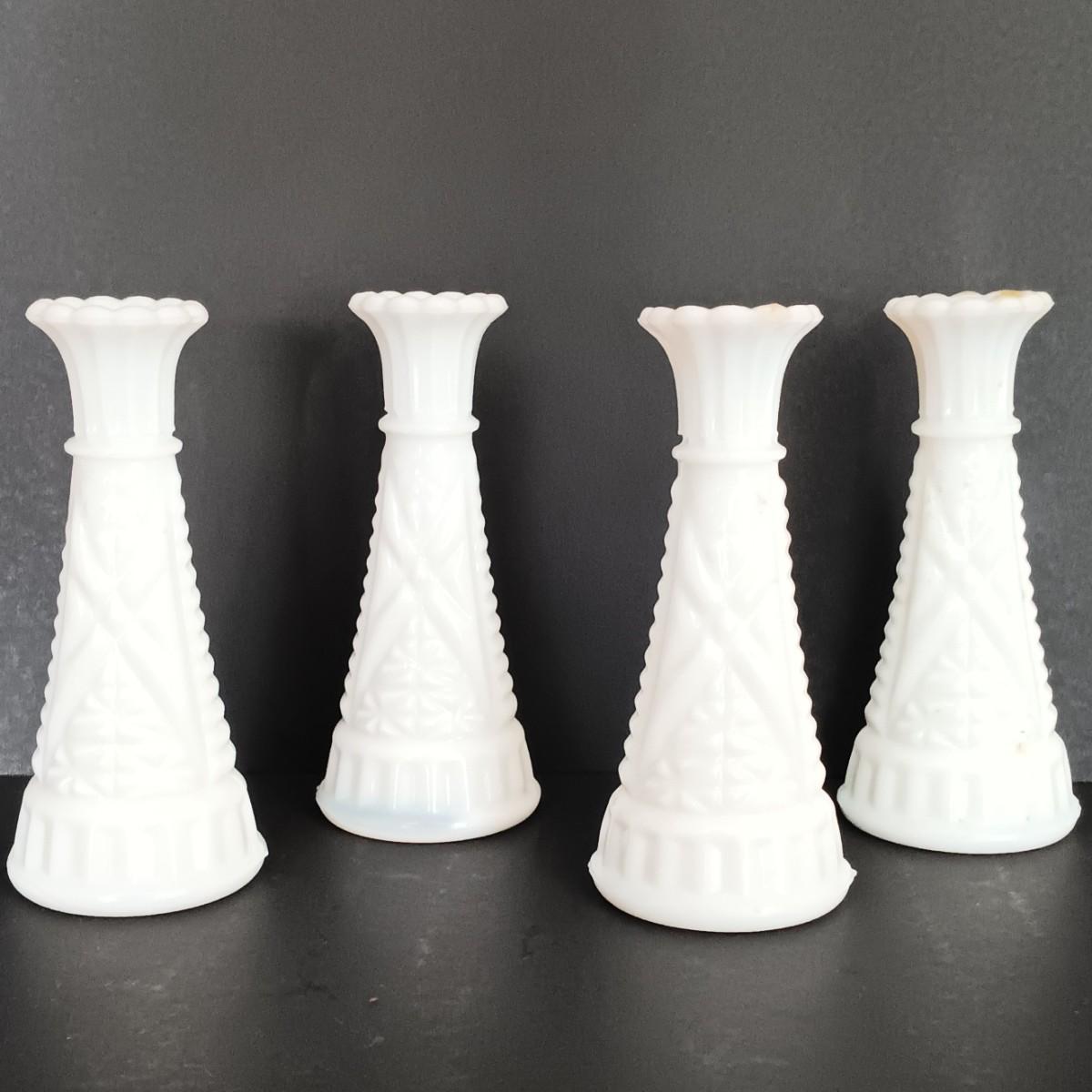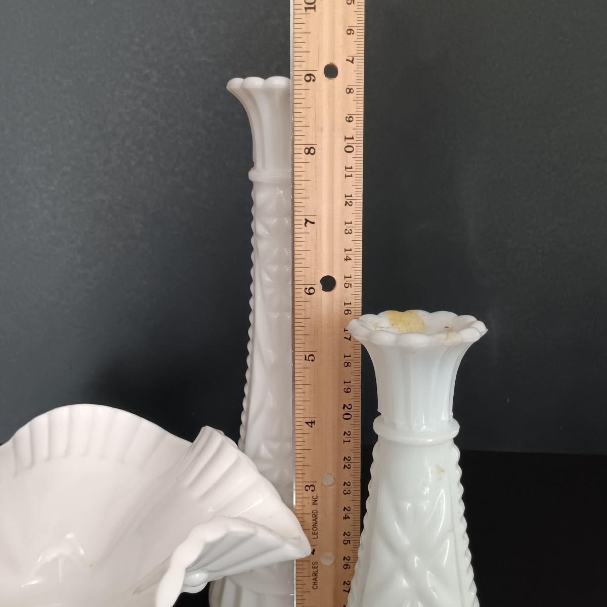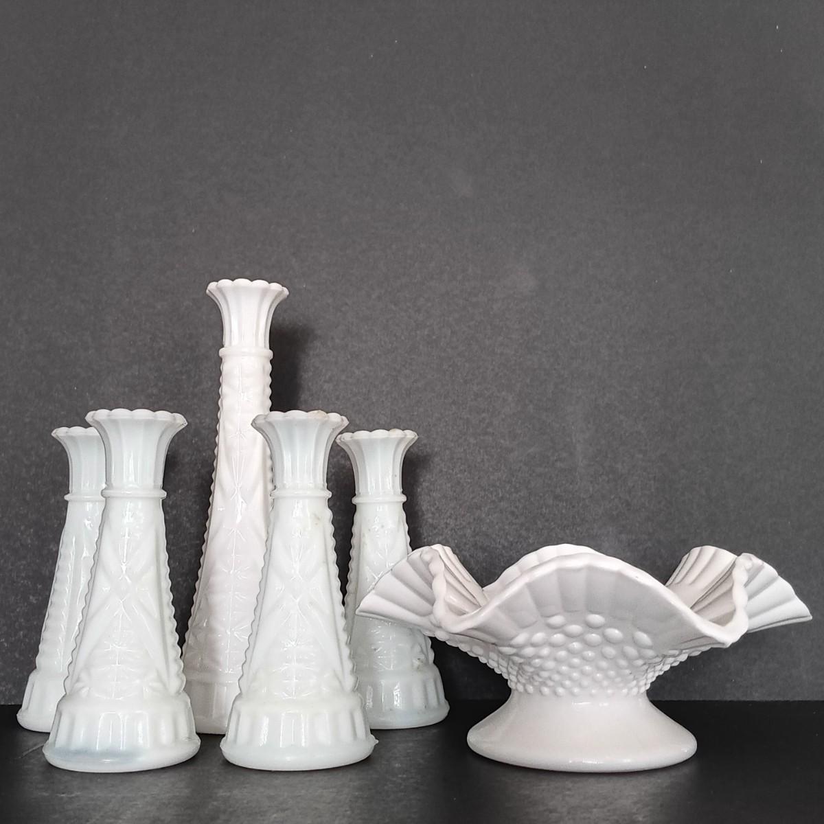 LOT 18: Milk Glass Collection- Set of 4 Candleholders w/ Bud Vase and Ruffled Bowl