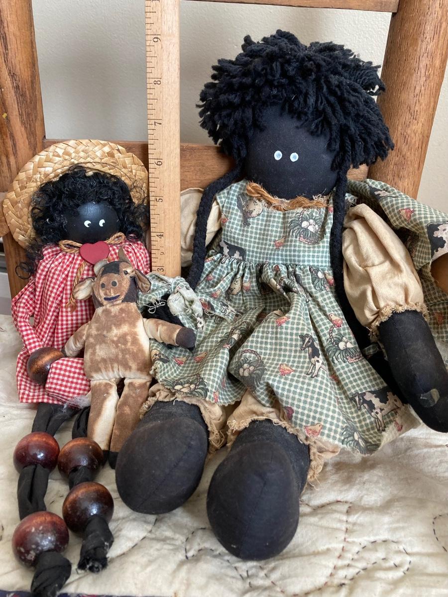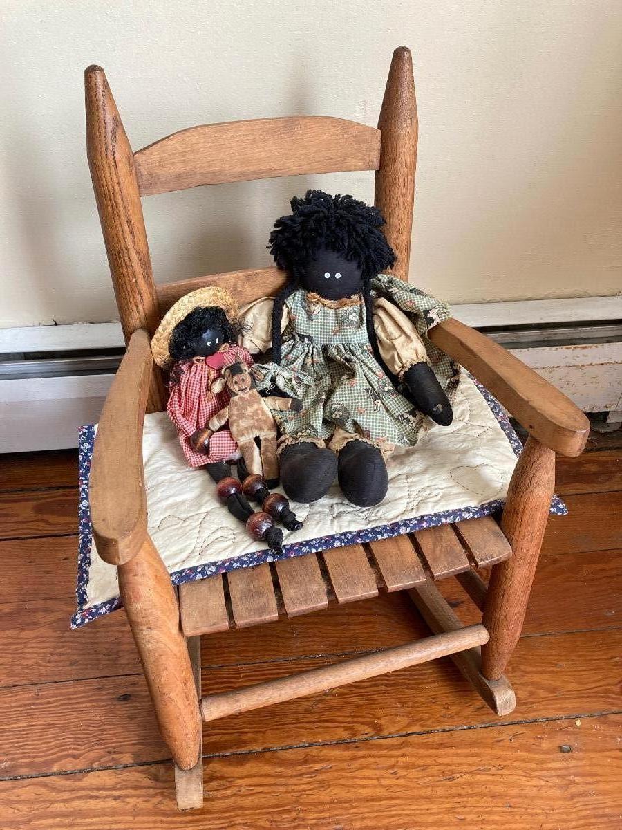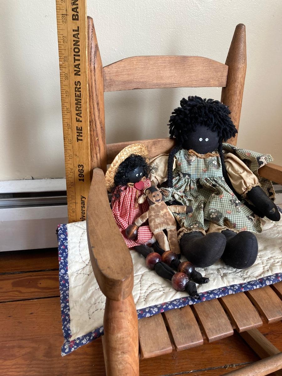 LOT 34: Vintage Children's Wooden Rocking Chair with Black Americana Folk Art Dolls