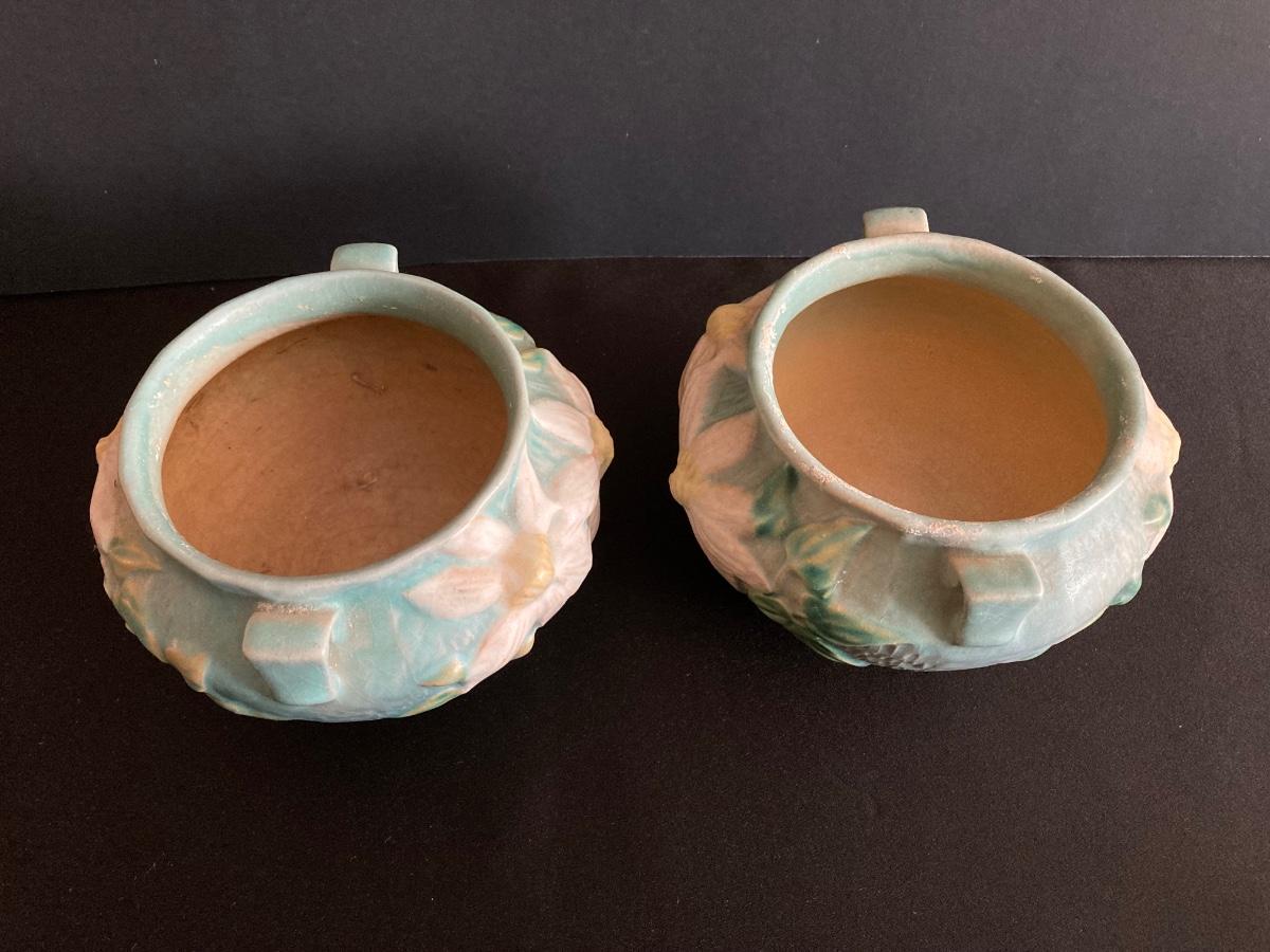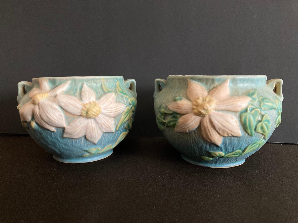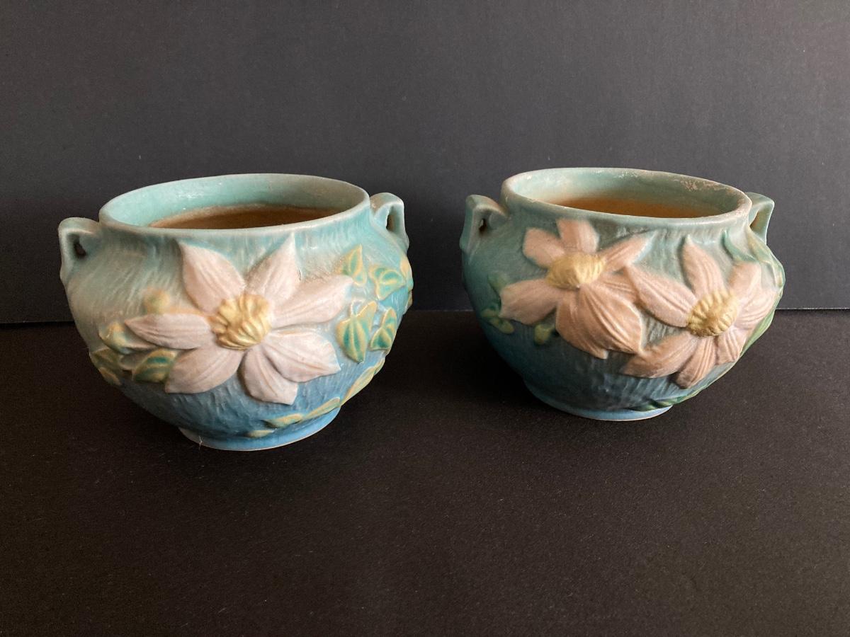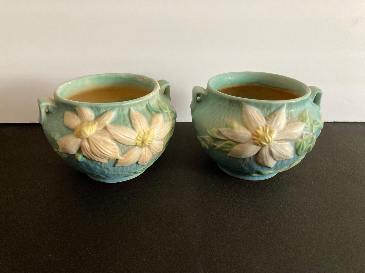 LOT 36: Two Vintage Roseville Clematis Green Ceramic Jardiniere Planter Vases, Double Handled 667-4"