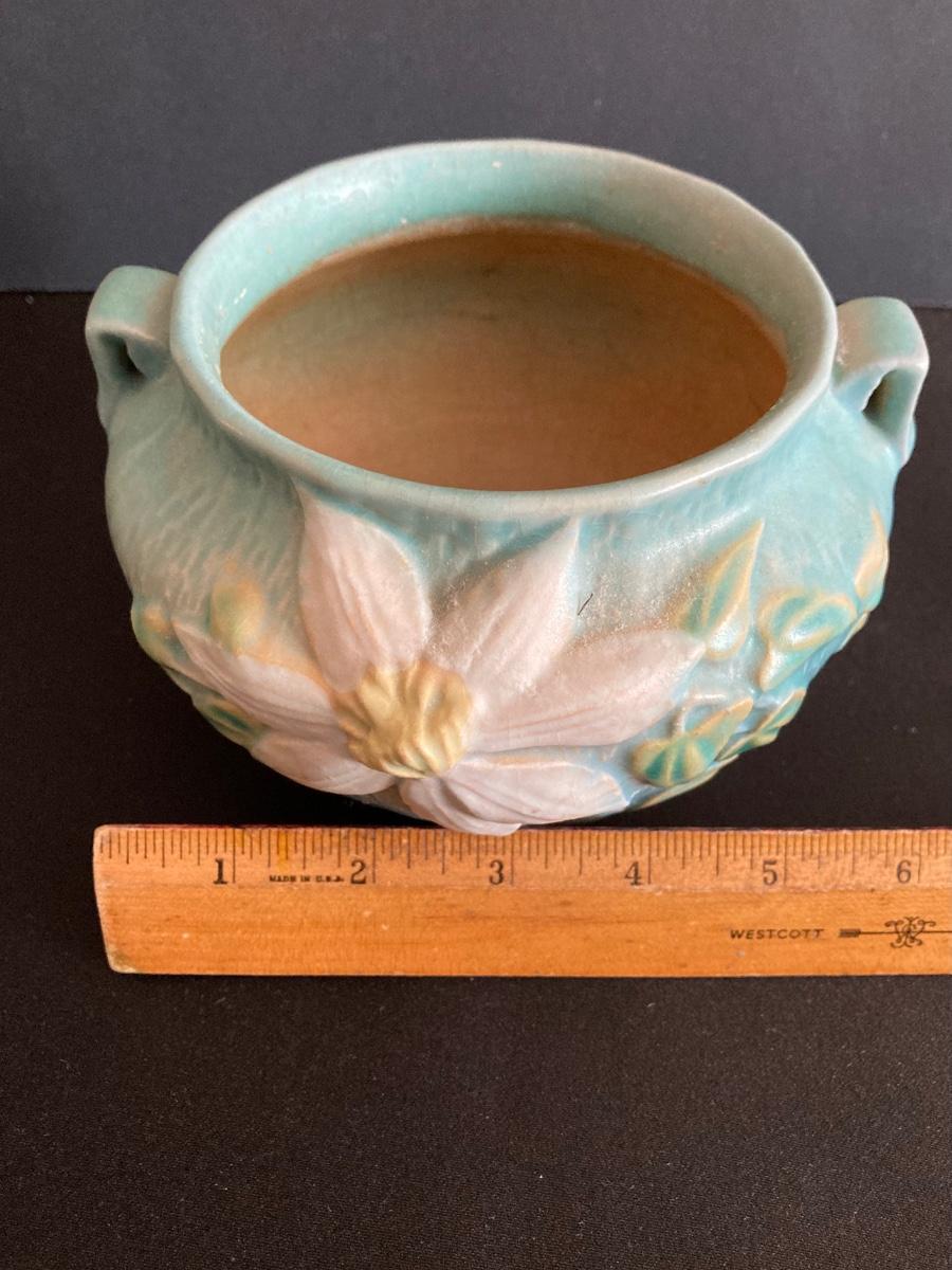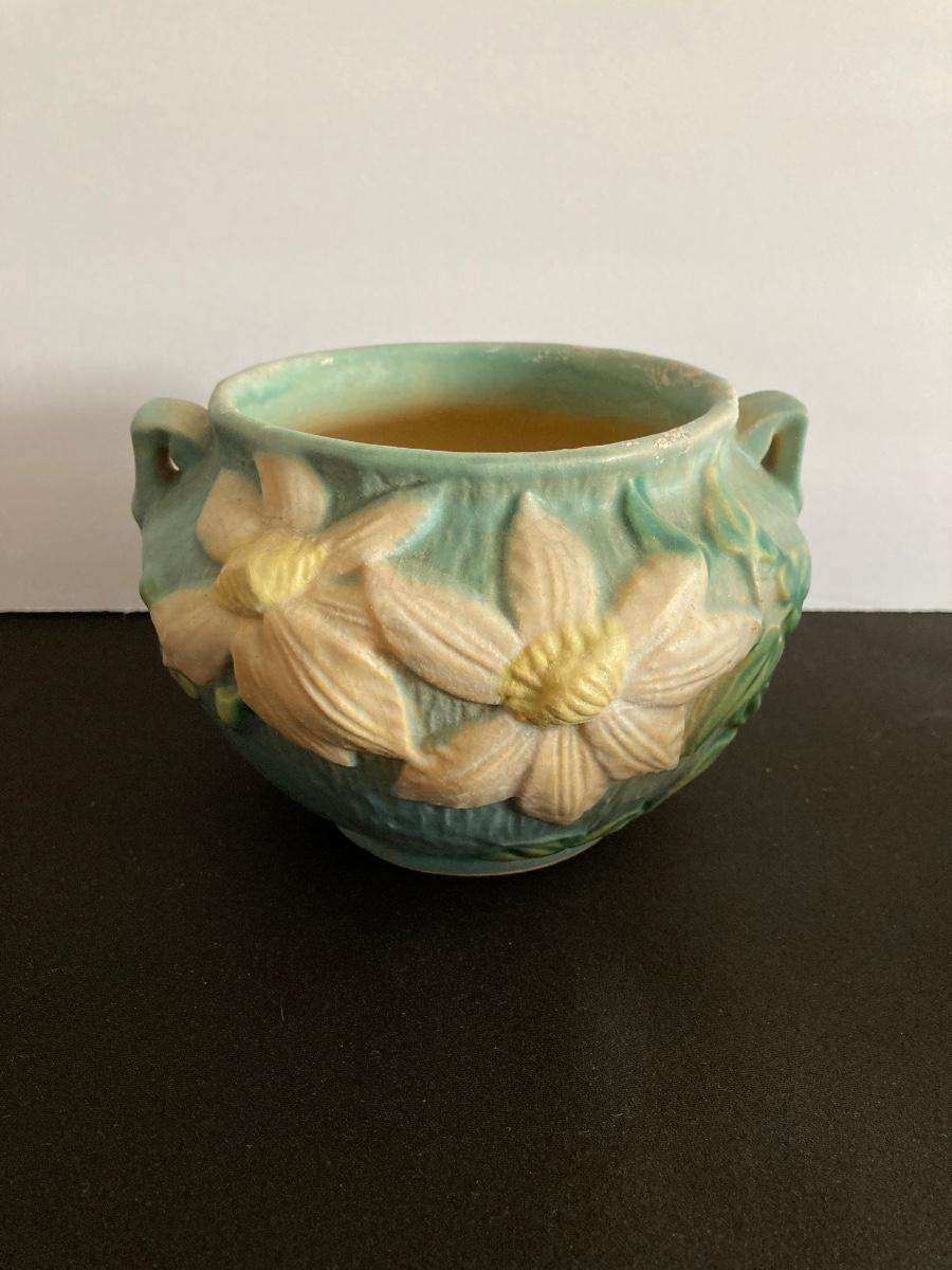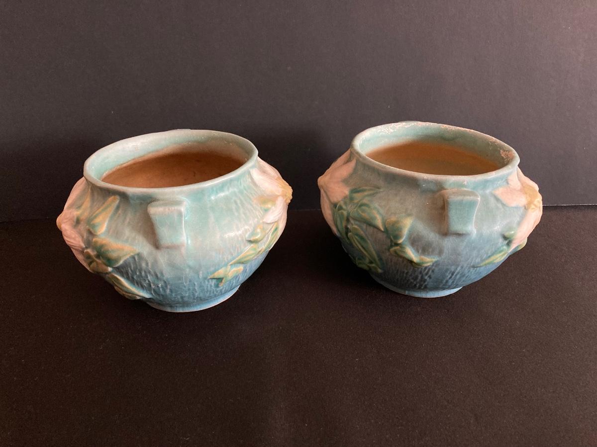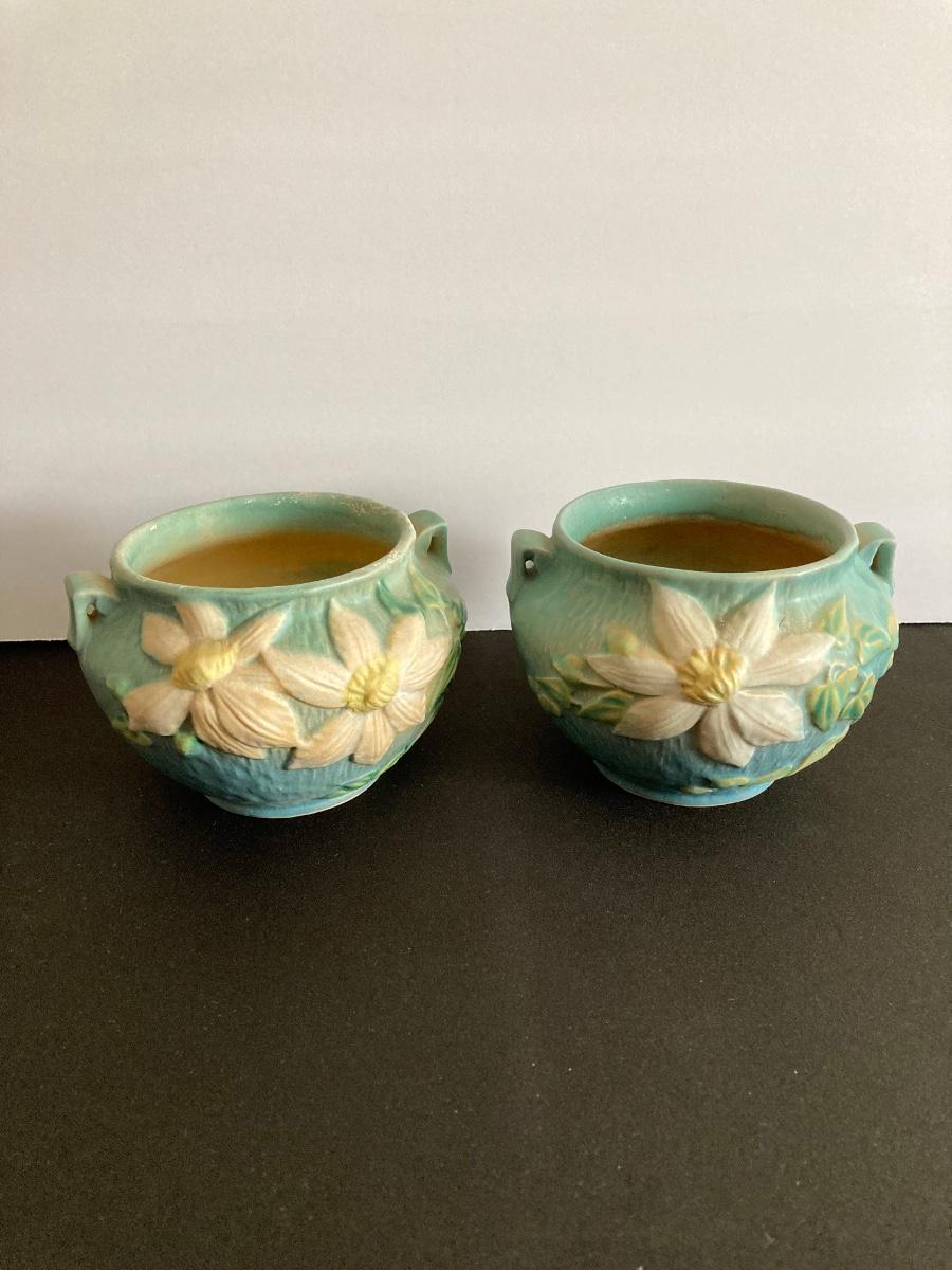 LOT 36: Two Vintage Roseville Clematis Green Ceramic Jardiniere Planter Vases, Double Handled 667-4"