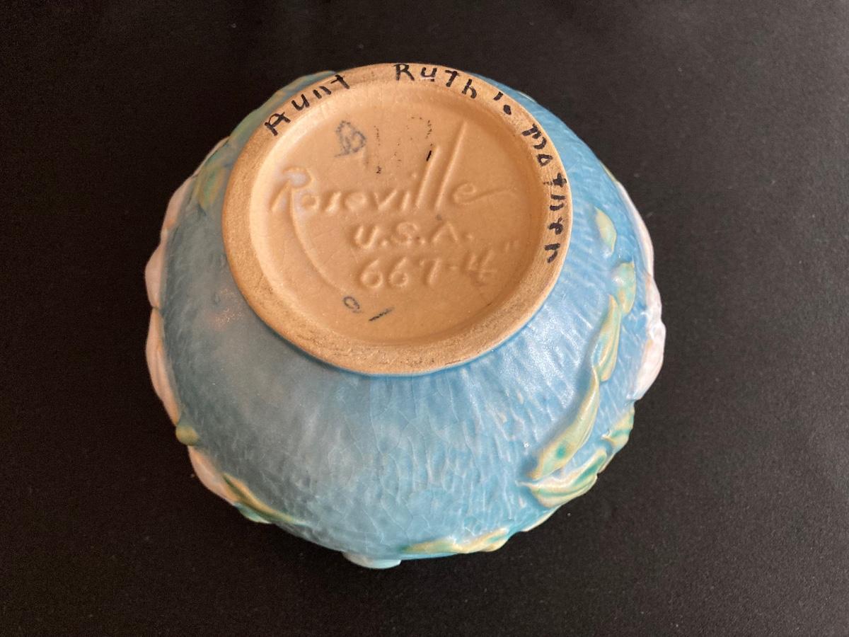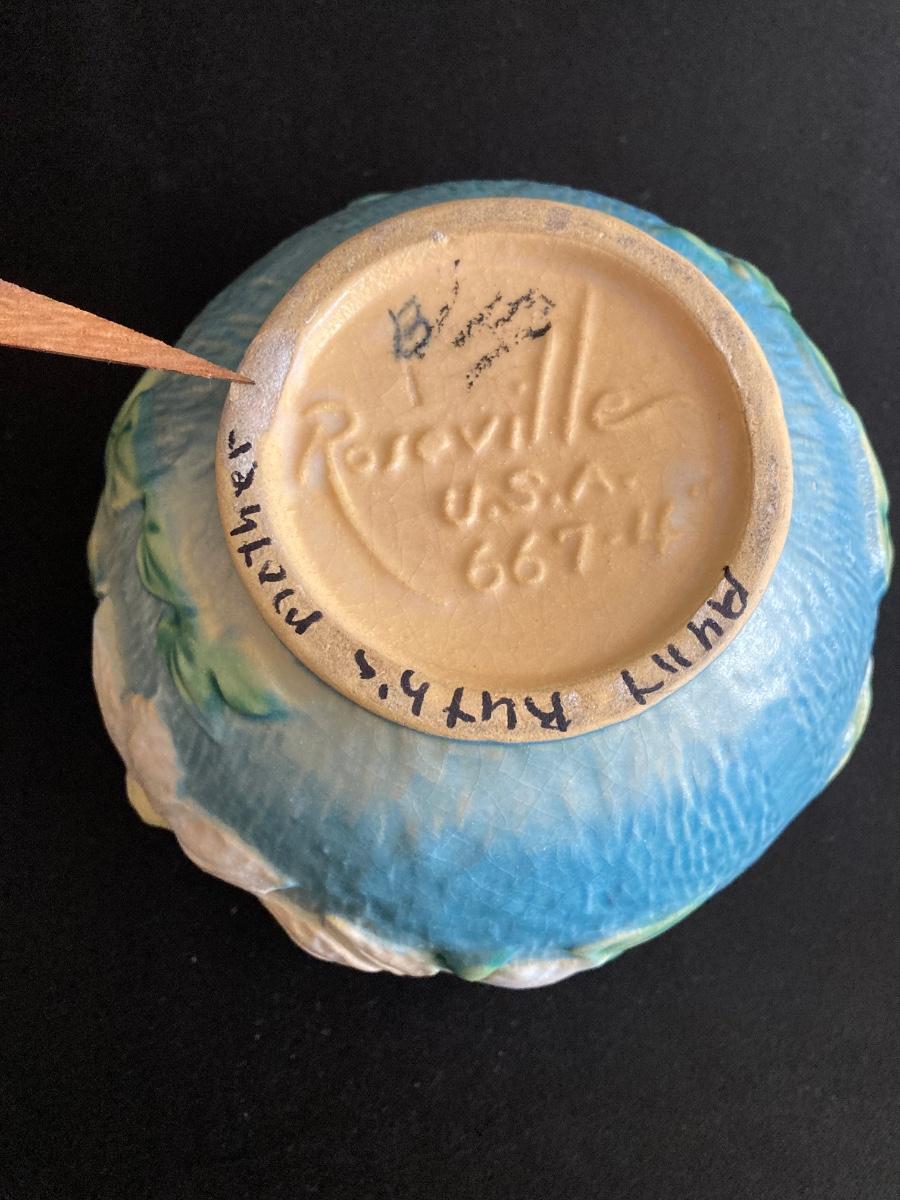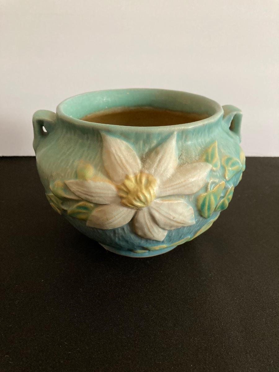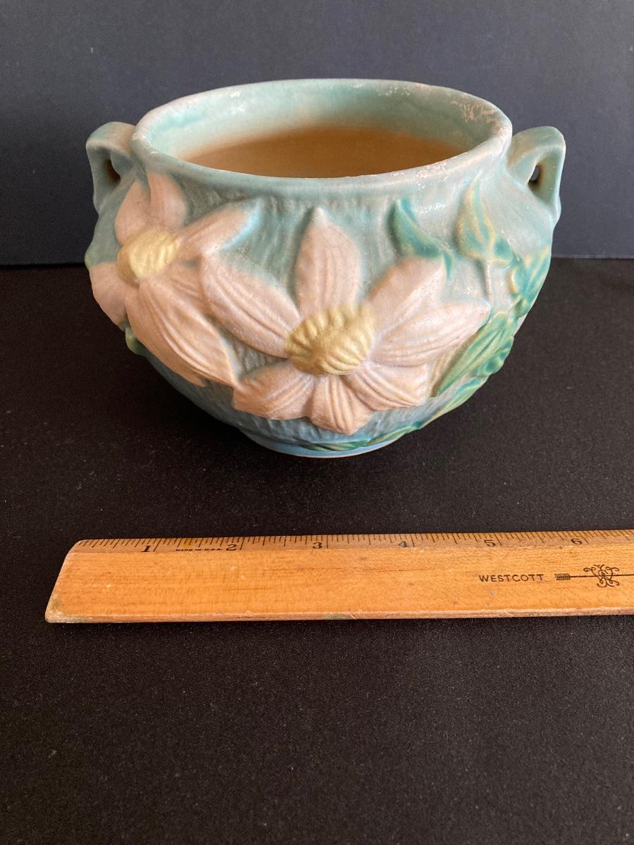 LOT 36: Two Vintage Roseville Clematis Green Ceramic Jardiniere Planter Vases, Double Handled 667-4"
