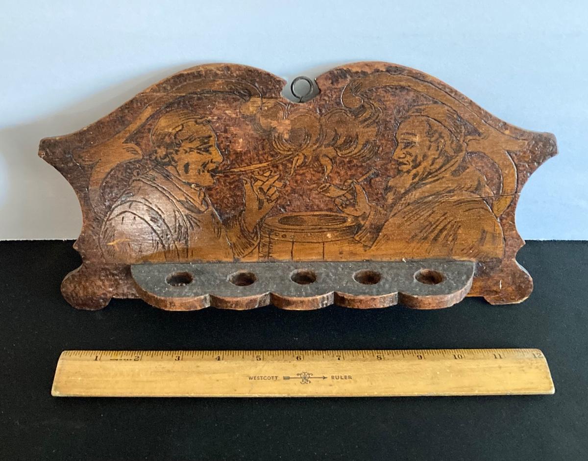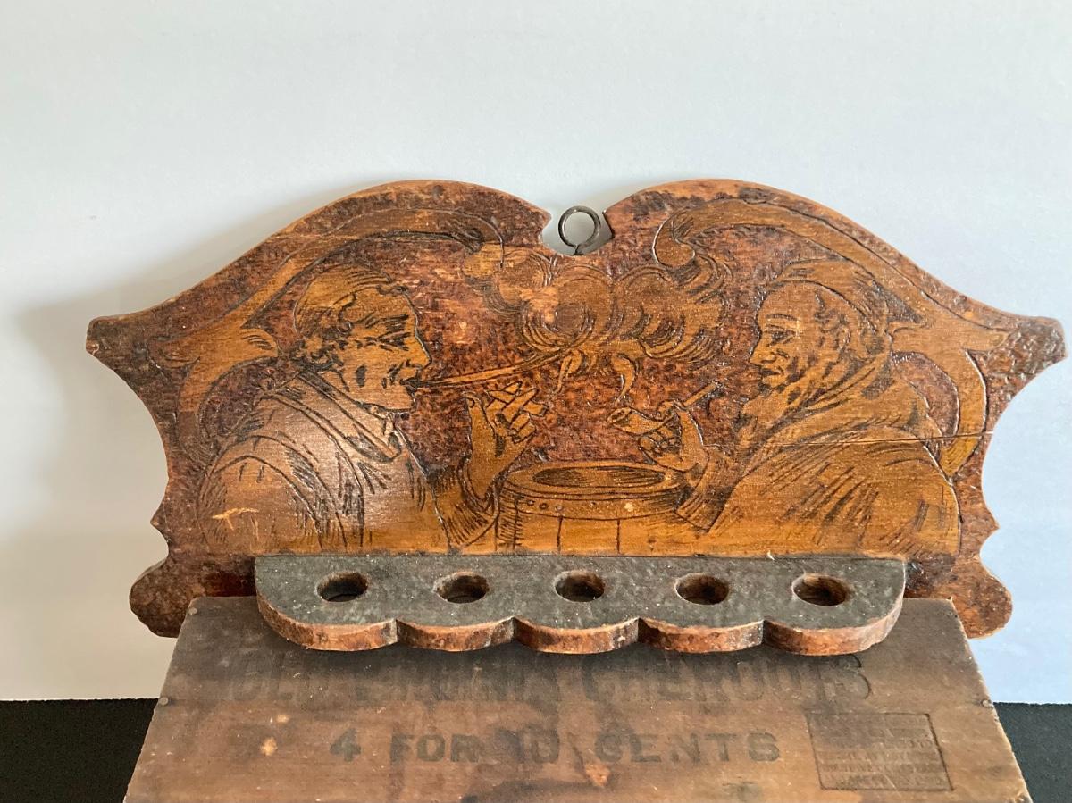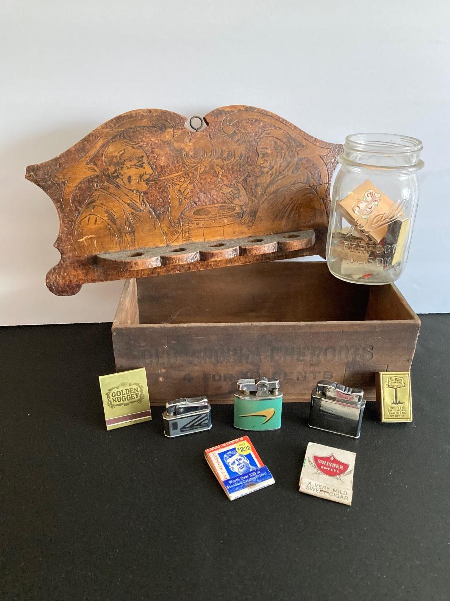 LOT 43: Antique / Vintage Flemish Art Co Pipe Holder, Old Virginia Cheroots Wooden Box, with Vintage Lighters and Matches