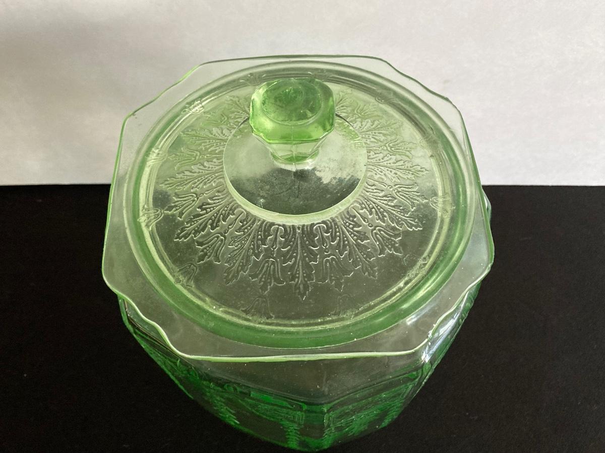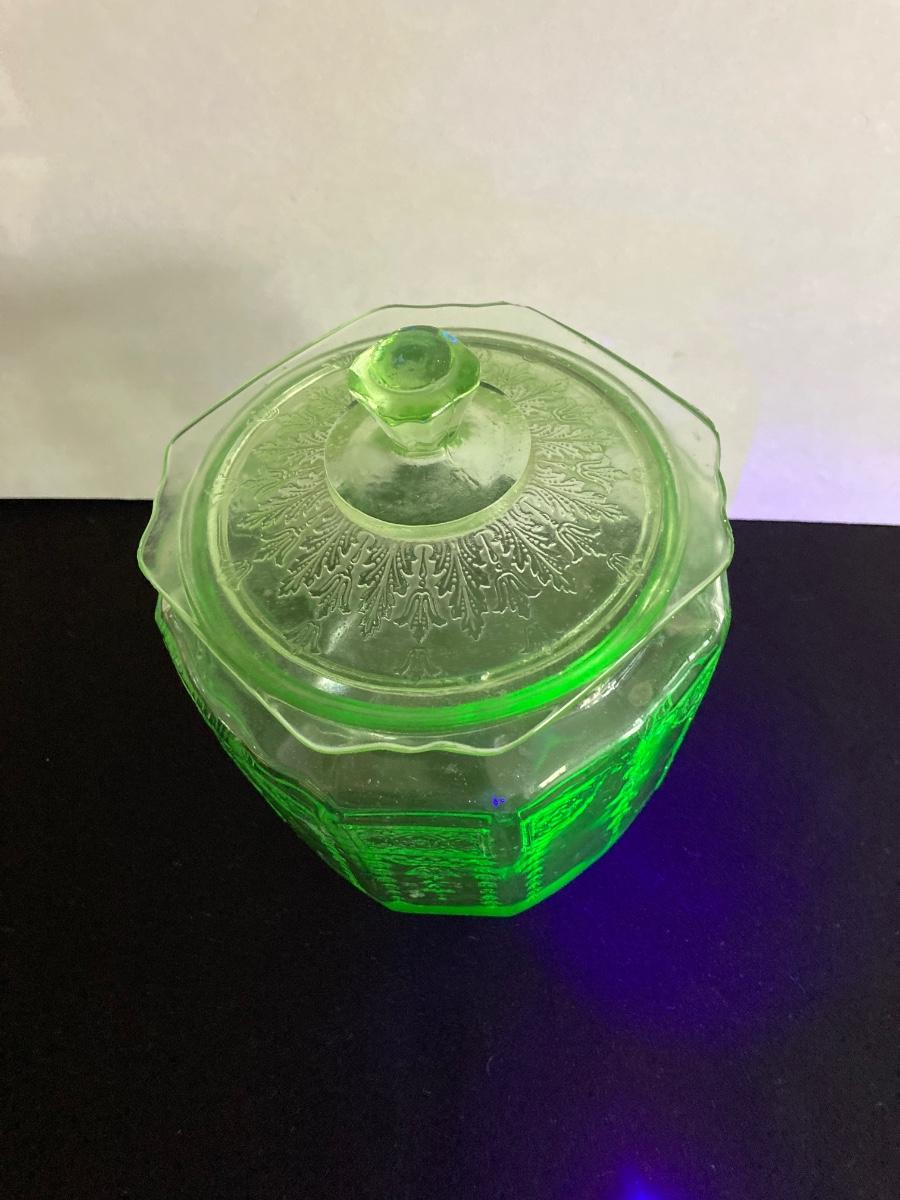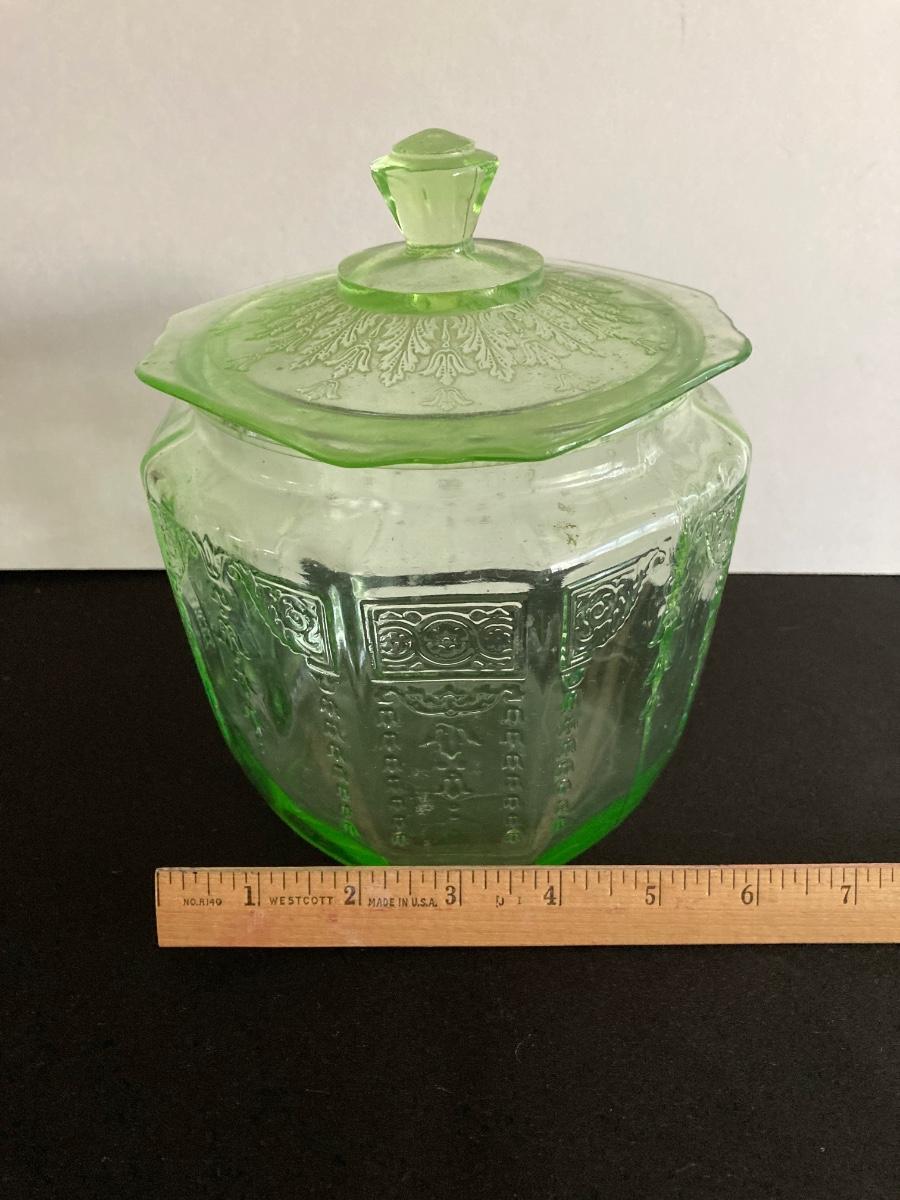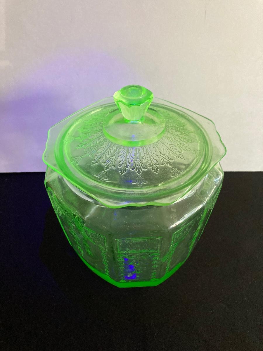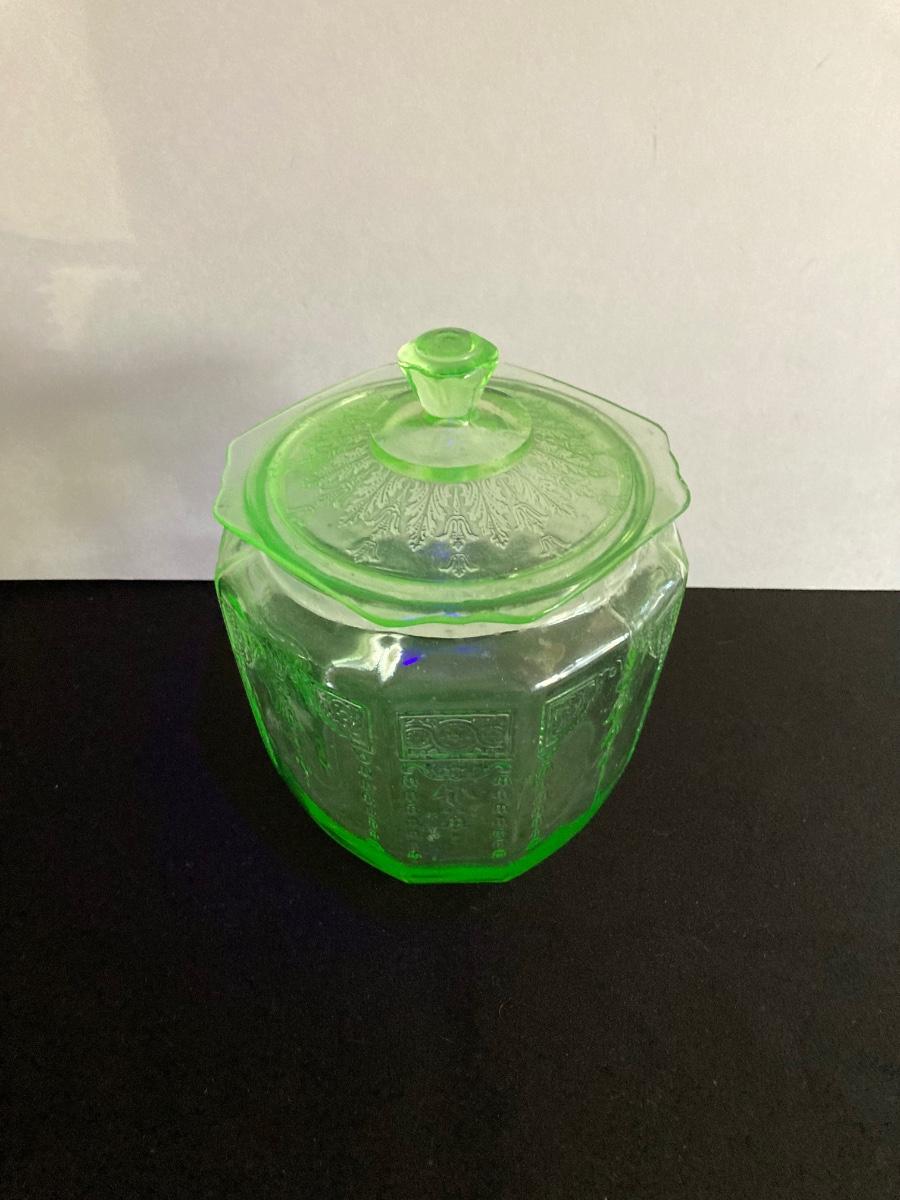 LOT 49: Green Depression Uranium Glass Jar with Lid