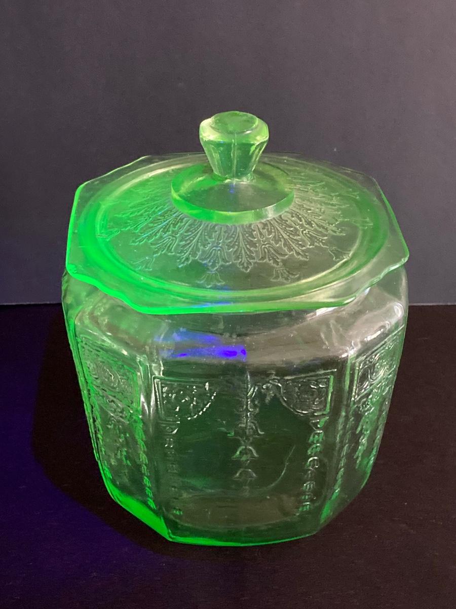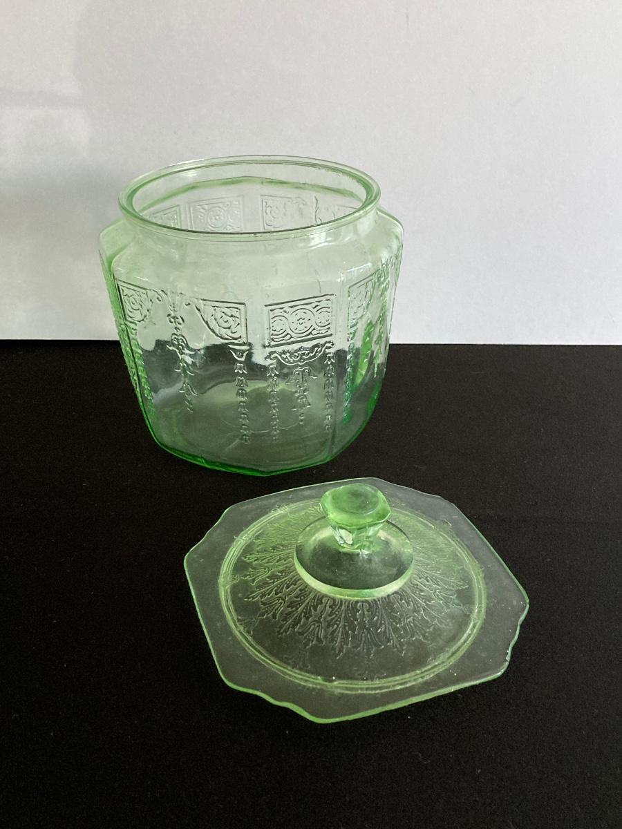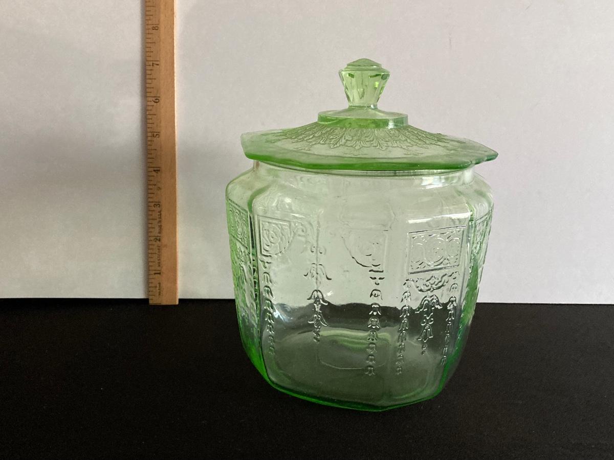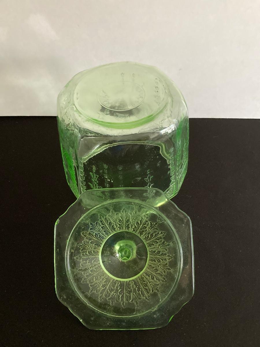 LOT 49: Green Depression Uranium Glass Jar with Lid