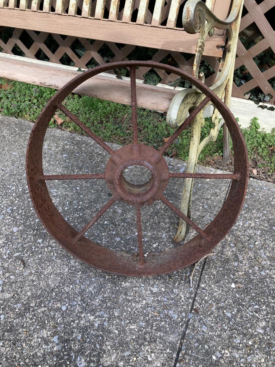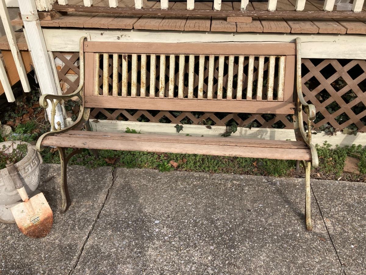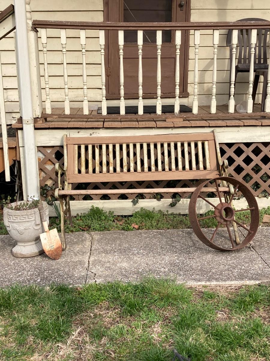 LOT 52: Vintage Wooden Bench, Wagon Wheel, Concrete Planter and More