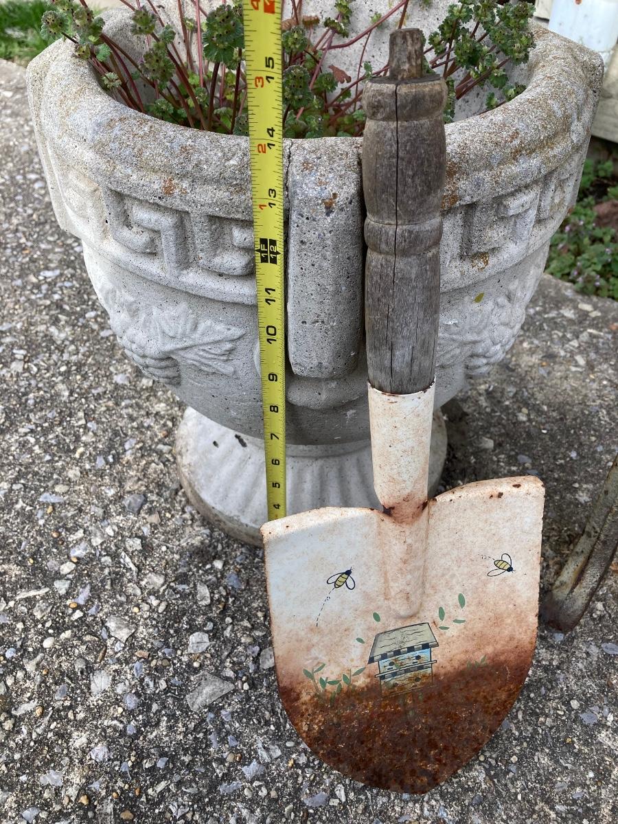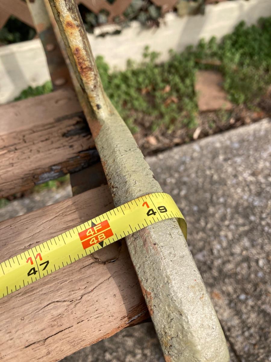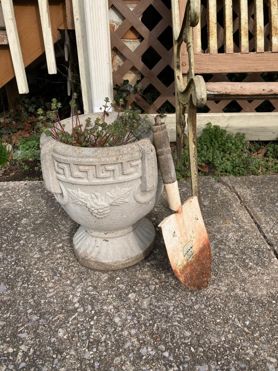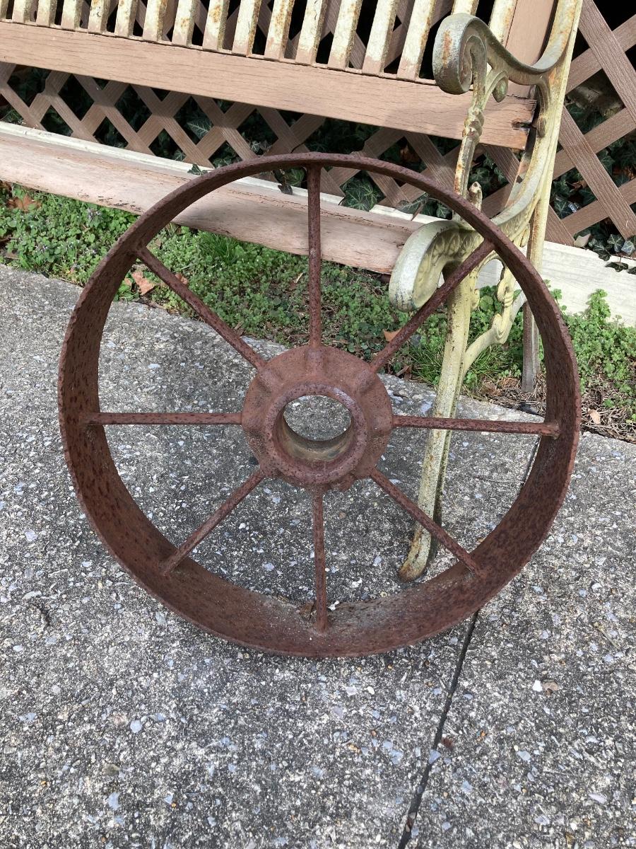 LOT 52: Vintage Wooden Bench, Wagon Wheel, Concrete Planter and More