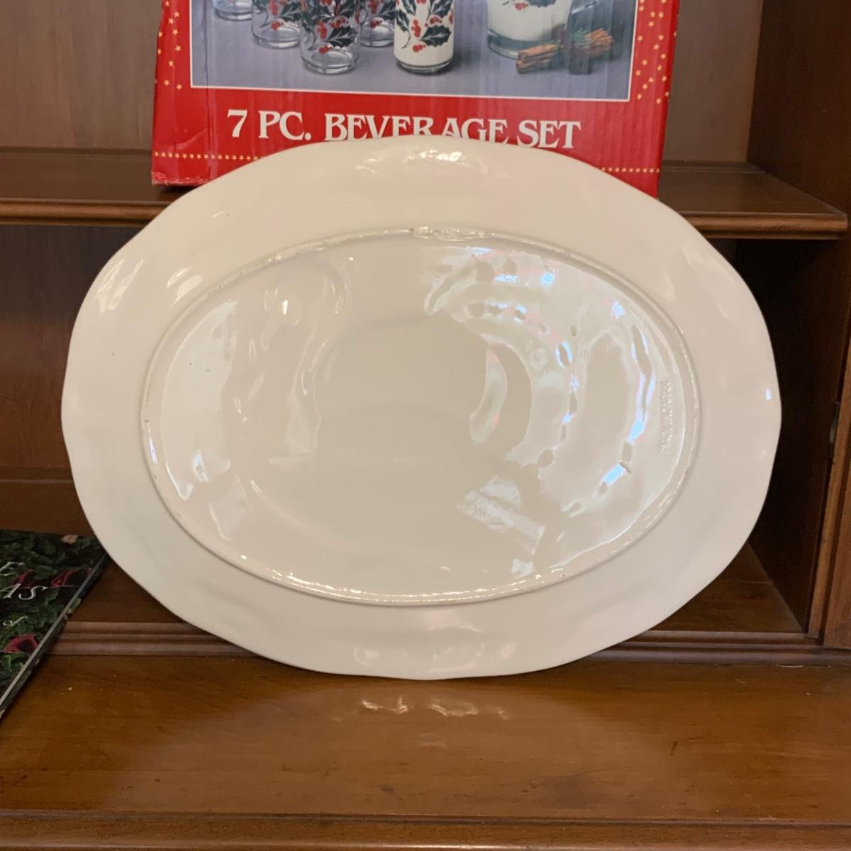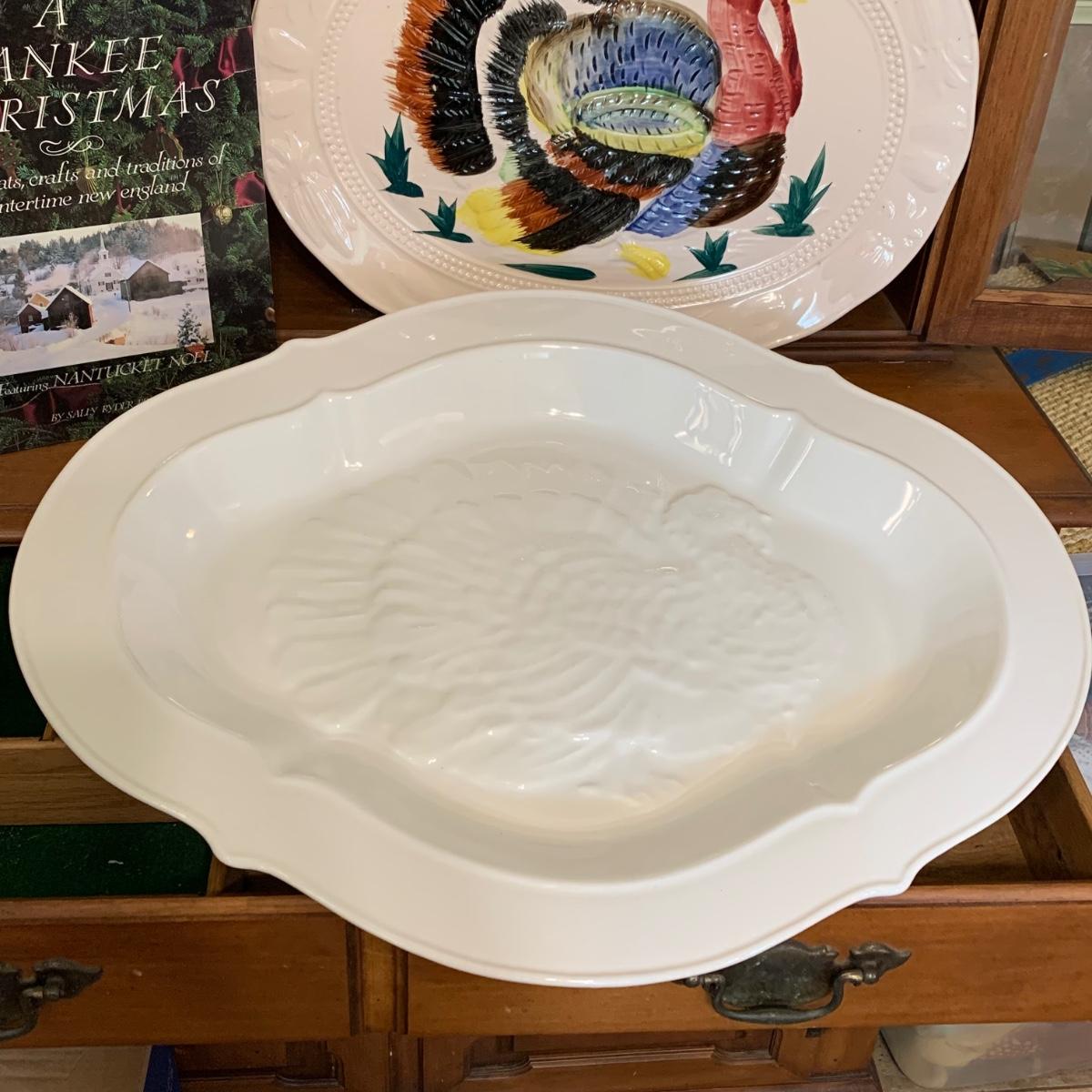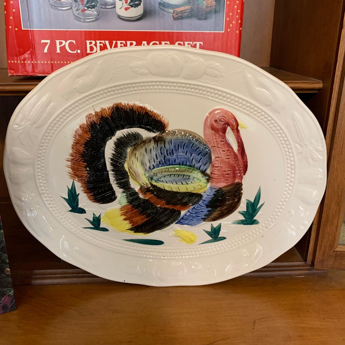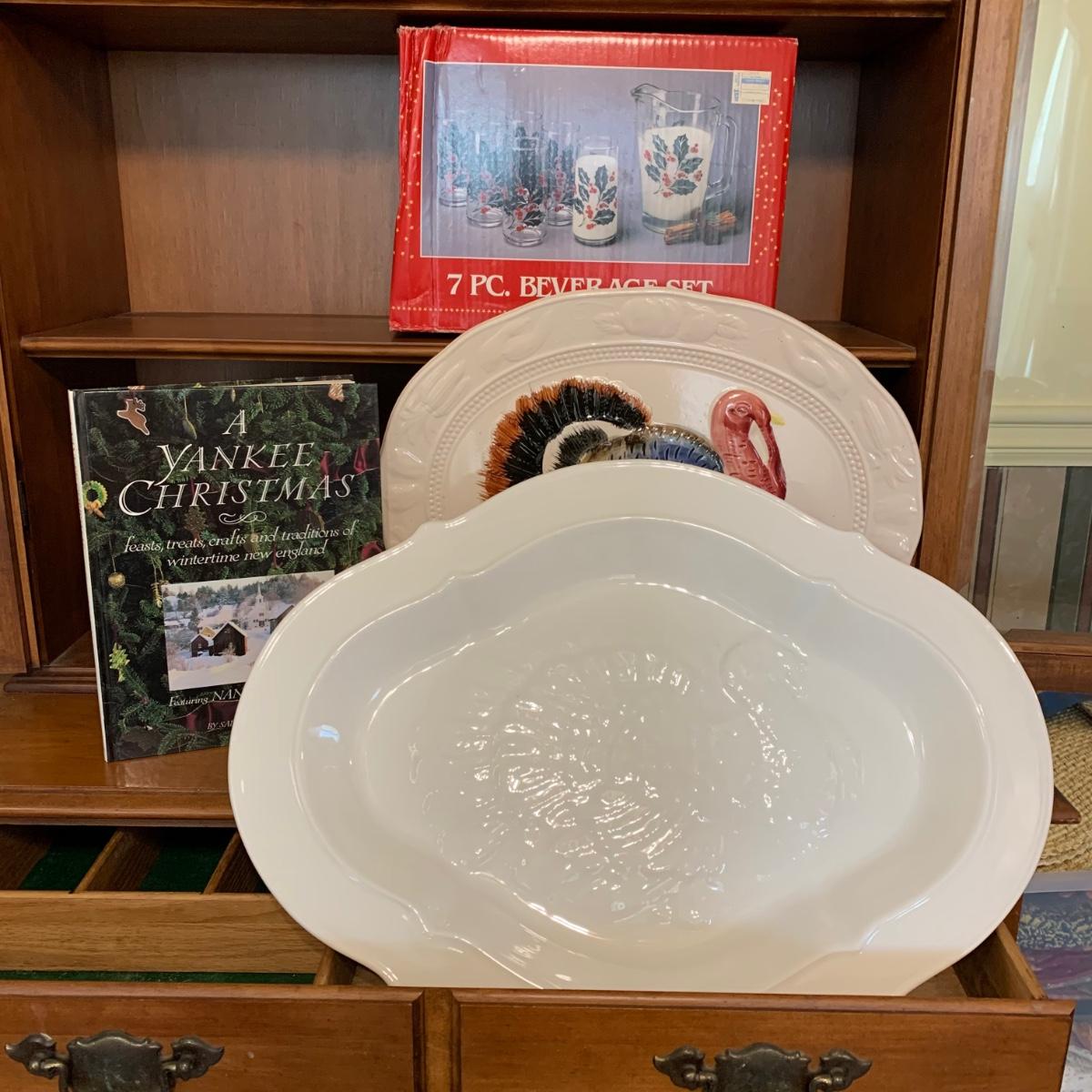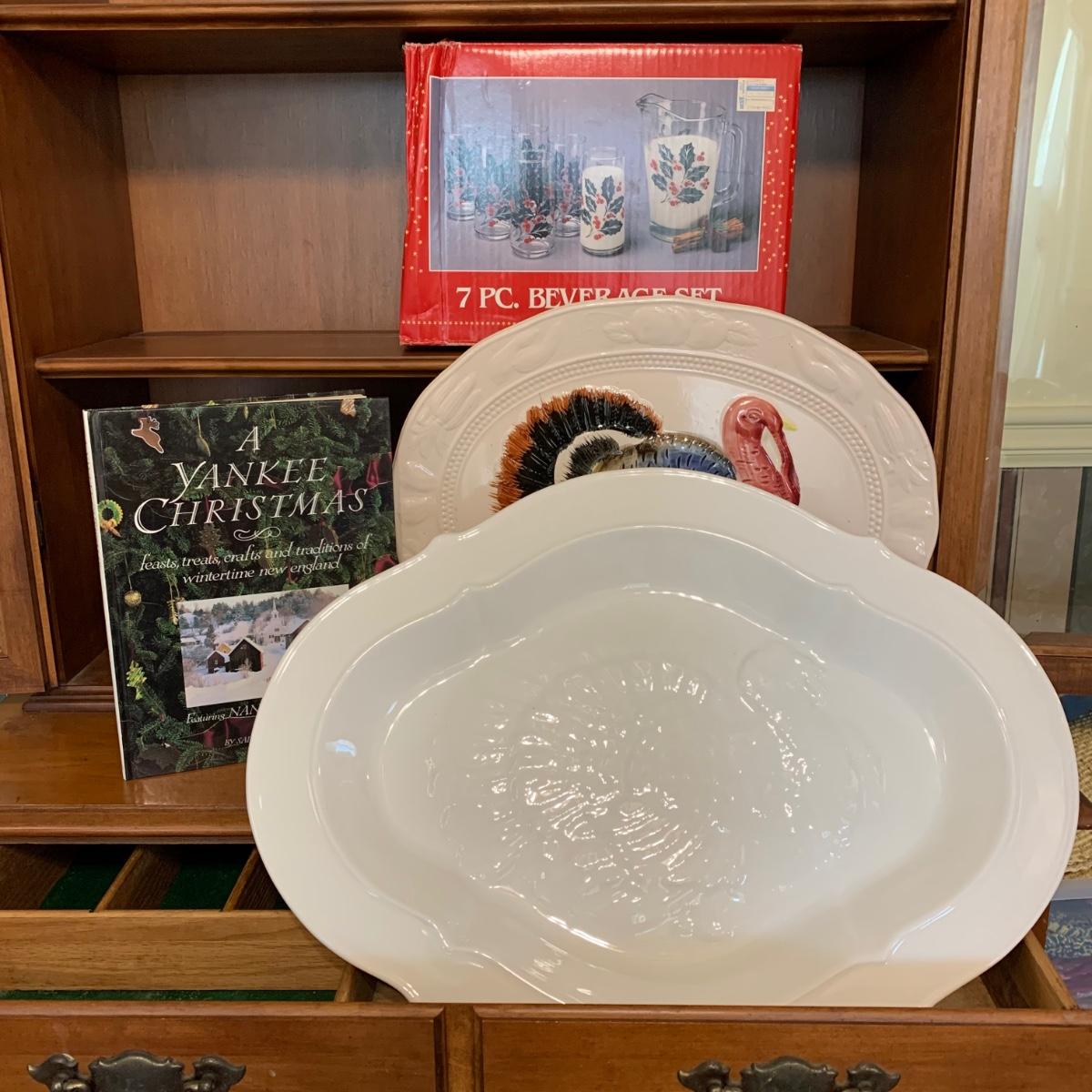 LOT 74: Himark #14-1620 Deluxe Turkey Platter, Vintage Glass Holly Berry Pitcher w/6 Tumblers. Yankee Christmas Book & Ceramic Turkey Platter