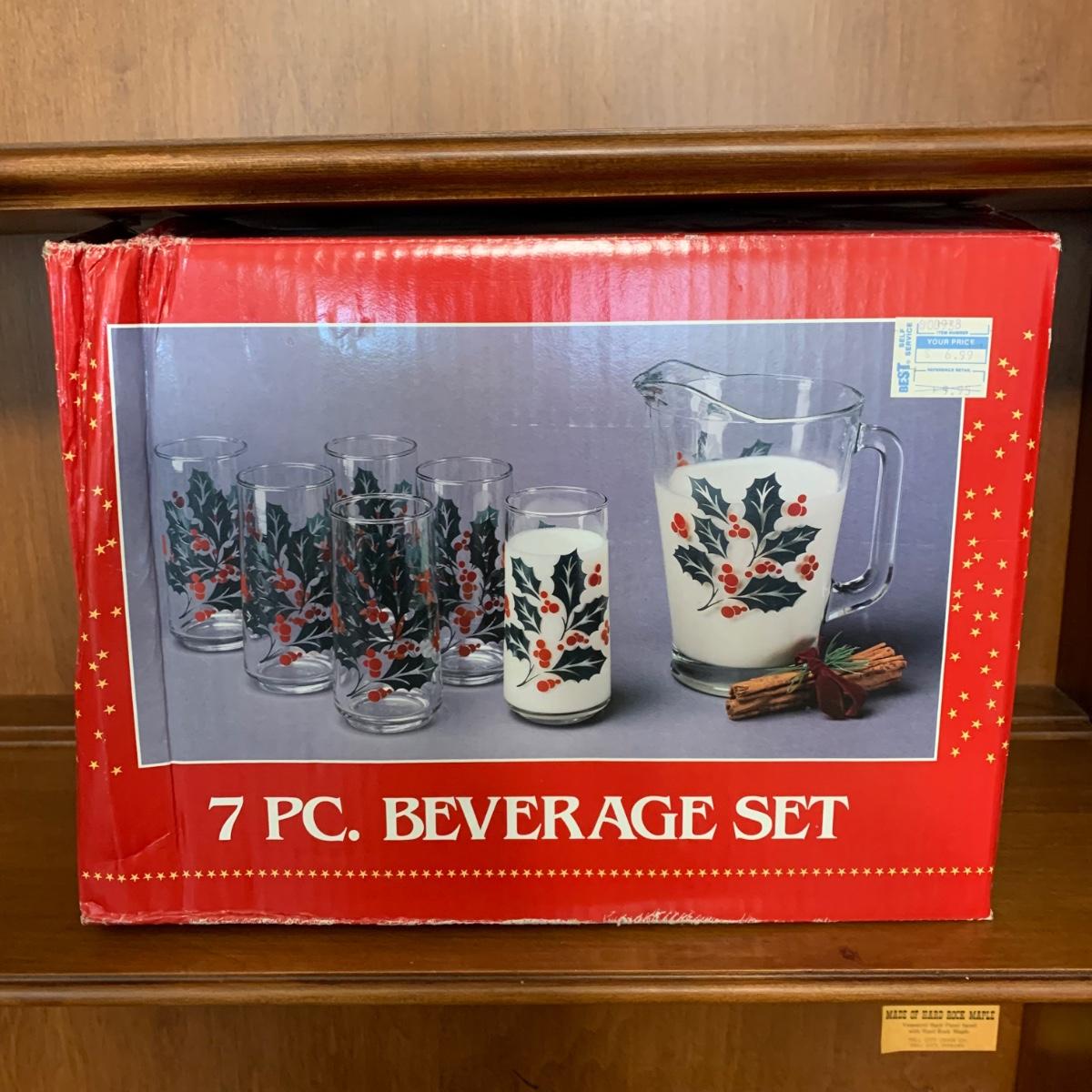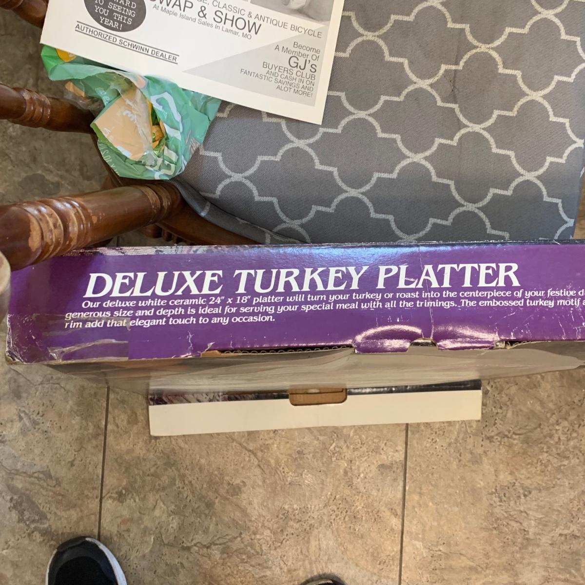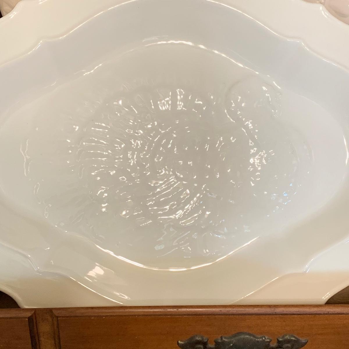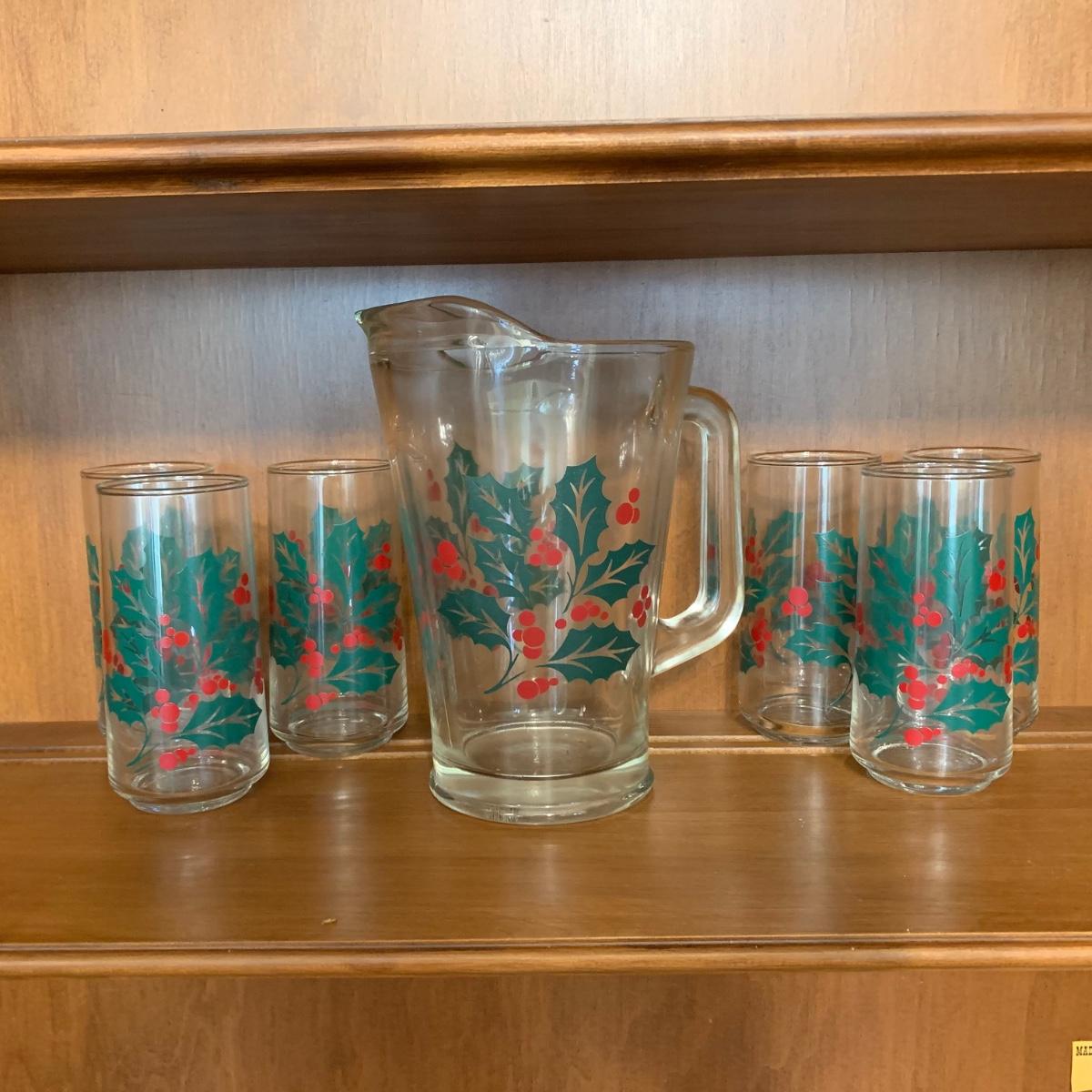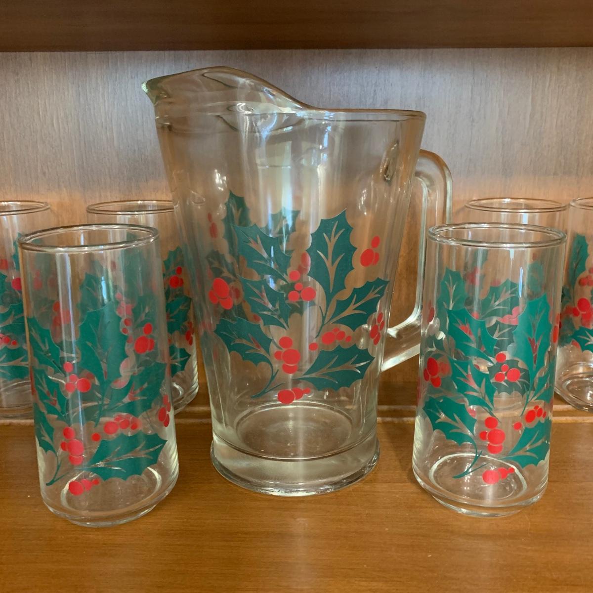 LOT 74: Himark #14-1620 Deluxe Turkey Platter, Vintage Glass Holly Berry Pitcher w/6 Tumblers. Yankee Christmas Book & Ceramic Turkey Platter