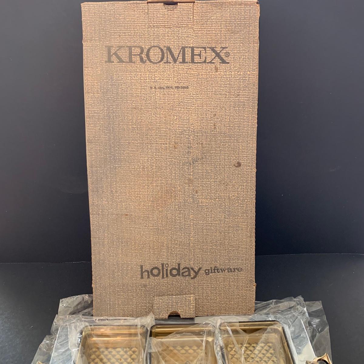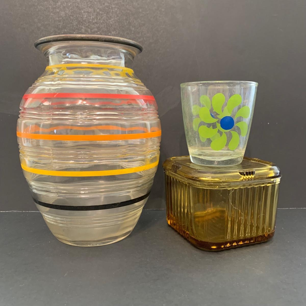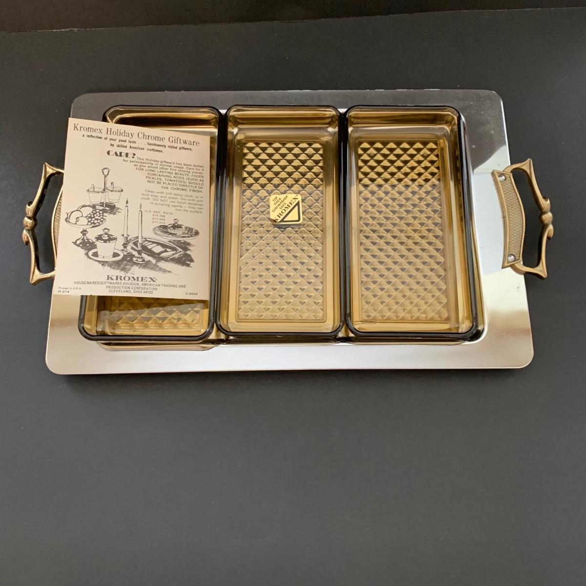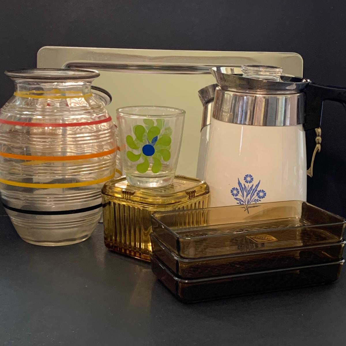 LOT 79: Kromex Holiday Giftware Set, Corning Ware Coffee Percolator Coffee Pot, Hocking Glass Ring Vase, Vintage Federal Glass Amber Square Refrigerator Dish with Lid Ribbed 4" & More